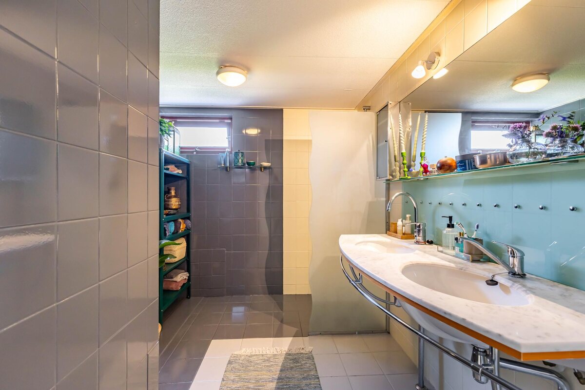 Begane grond: entree, hal, ruim toilet, inpandige garage (22 m2), ruime, lichte woonkamer (66 m2) met schuifpui naar de tuin en halfopen keuken met inbouwapparatuur en veel kastruimte, bijkeuken met cv-opstelling. Tevens op de benedenverdieping een slaap(werk-)kamer (14 m2) met eigen badkamer (6 m2) v.v. ligbad, douche, toilet, wastafel, vloerverwarming en lichtkoepel. Eerste verdieping: ruime overloop, drie heerlijk riante slaapkamers (19, 19 en 18 m2), waarvan 2 met extra verdiepingsvloer (beide 8 m2) voor bijvoorbeeld een extra leuke slaapplek of voor opslag. Deze kamers hebben tevens veel opbergruimte. Tweede badkamer (6 m2) met douche, vloerverwarming en dubbel wastafelmeubel. Vanuit de overloop is ook een derde toilet te bereiken en een praktische was/droogruimte.