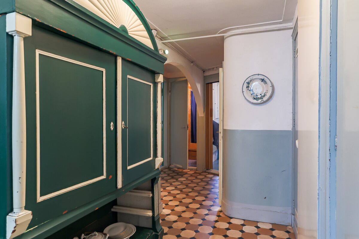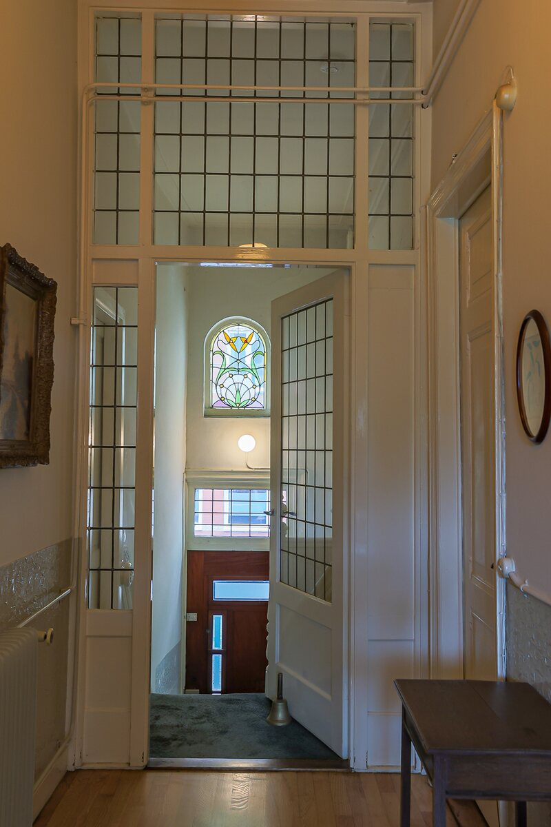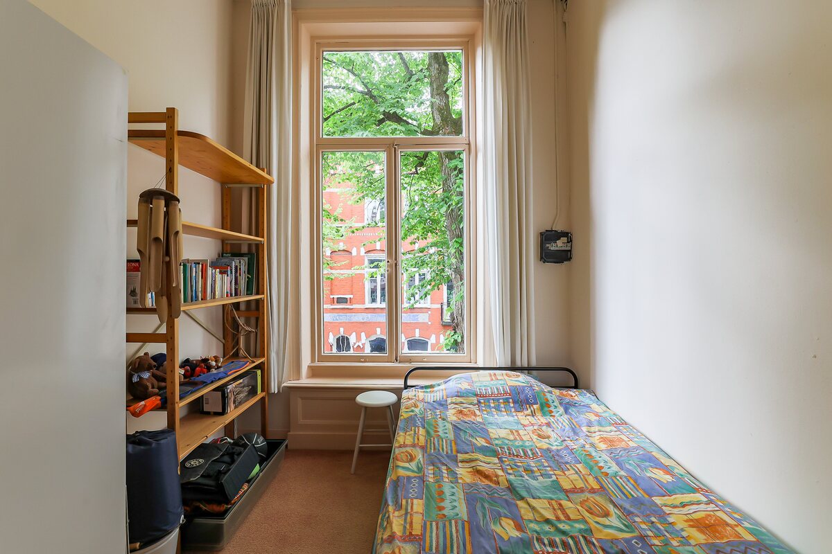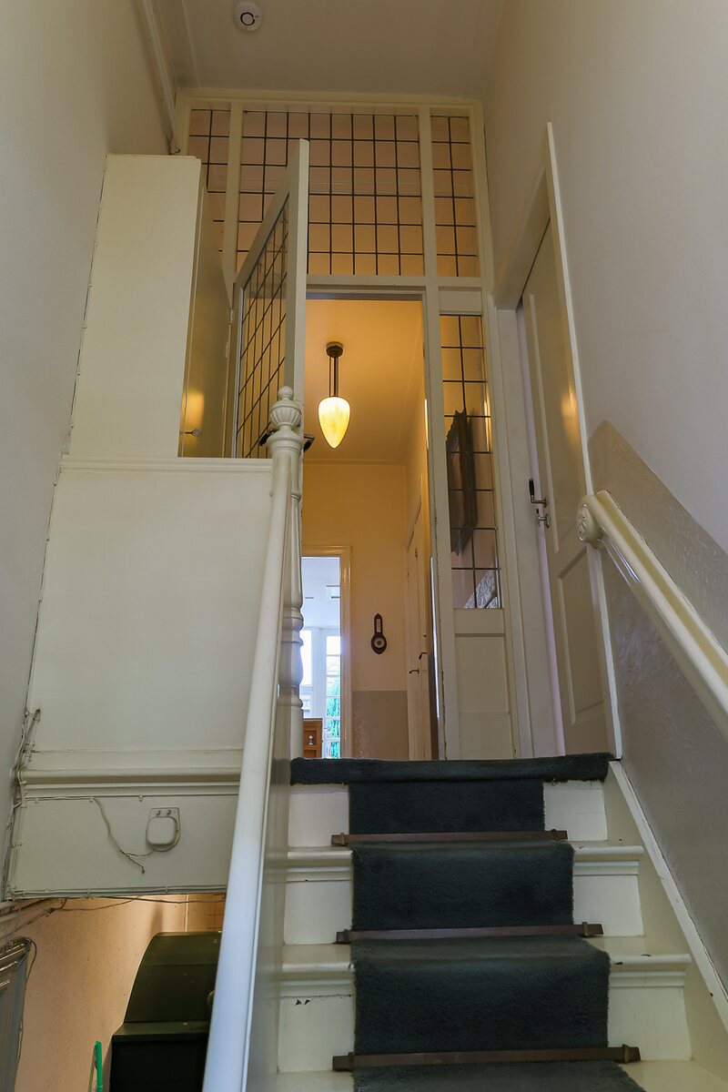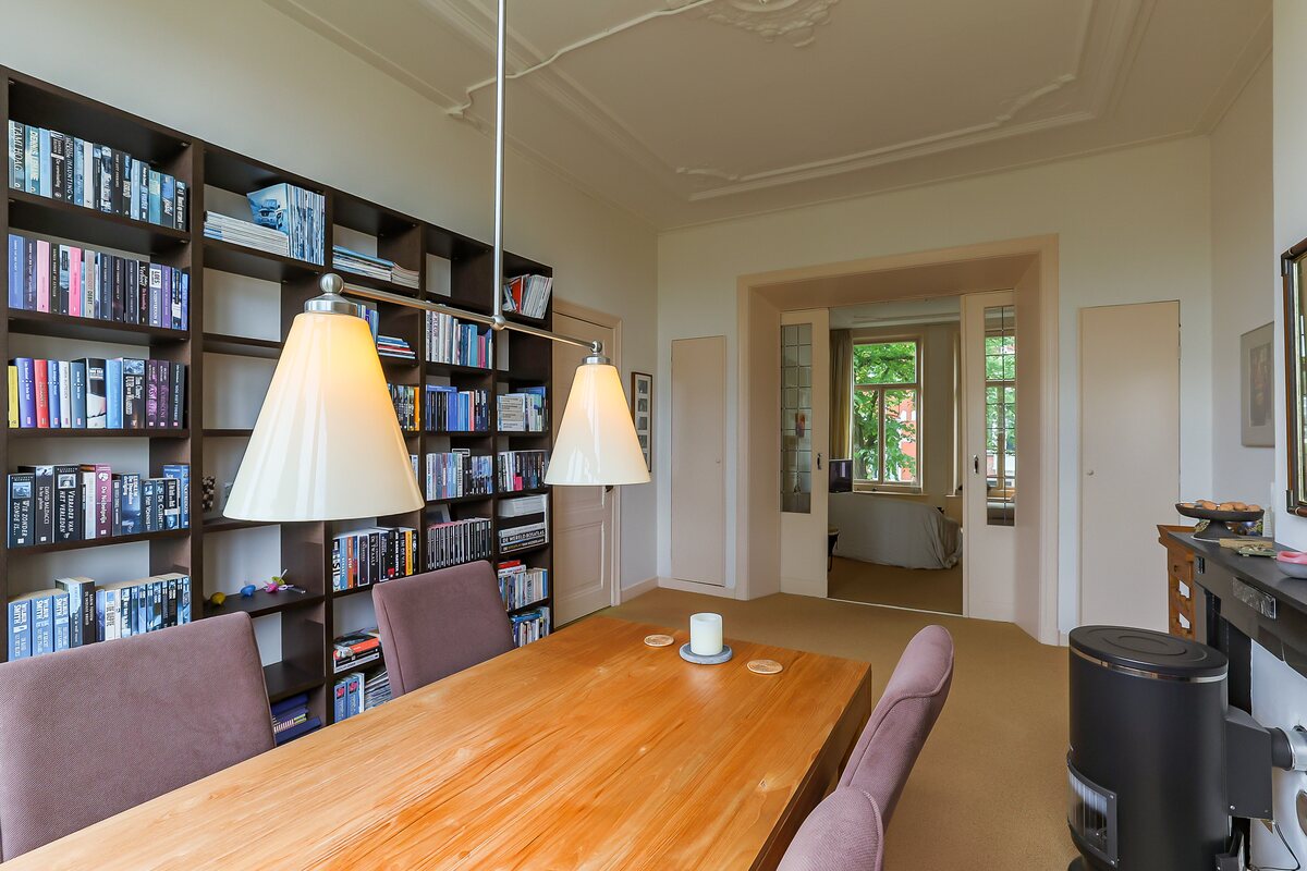 Souterrain: entree, trapje naar beneden. Grote hal met kastruimte. Twee slaapkamers (24 en 12 m2), toilet, douche, bergkamer (5 m2) en een bijkeuken (10 m2) met deur naar de tuin. Beletage: trap naar deze verdieping. Ruime hal, toilet, fraaie woonkamer-en-suite (achterzijde de eetkamer (24 m2) en aan de voorzijde de woonkamer (23 m2) met originele kasten en schouwen. Eenvoudige dichte keuken van 10 m2 met deur naar het terras van 19 m2. Eerste verdieping: overloop, toilet, slaapkamer aan de voorzijde (9 m2) en wederom een woonkamer-en-suite met 2 royale vertrekken (25 en 24 m2). Eenvoudige keuken met douchecel.Tweede verdieping: flinke overloop, 3 kamers (30, 19 en 7 m2 en een tweede dichte keuken met douchecel.