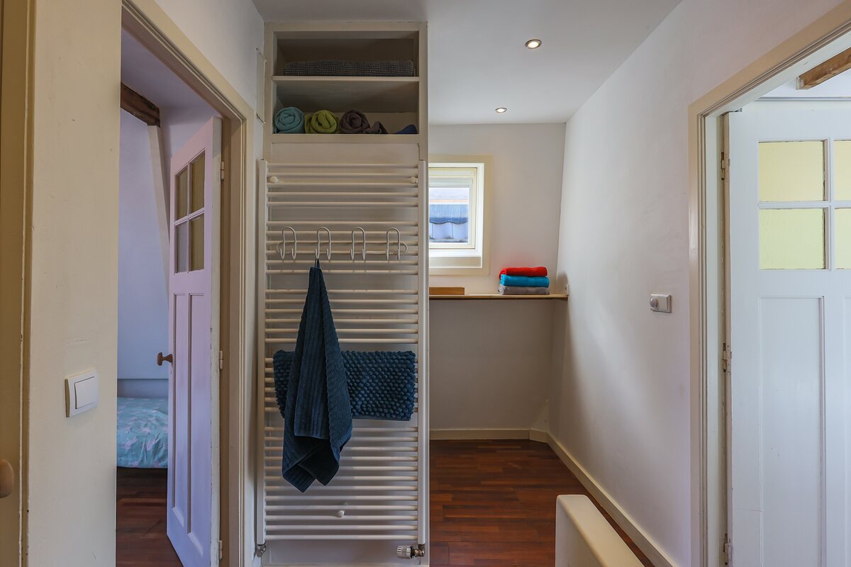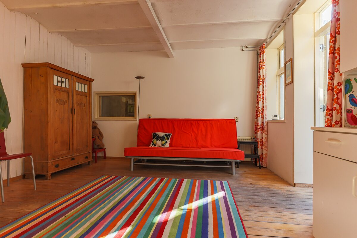 Begane grond: kleine hal, badkamer met ligbad, wastafel en toilet. Leuke studio (woonkamer met keukenblokje) met openslaande deuren ca. 18 m2. De naastgelegen praktische berging (ca. 11 m2) met een trap naar zolder (oude meelzolder). Via deze overloop toegang tot de slaapkamer/ kantoorruimte van 10 m2 (bruto 18 m2) met een kleine buitenruimte van 6 m2. Woonoppervlakte: 43 m2