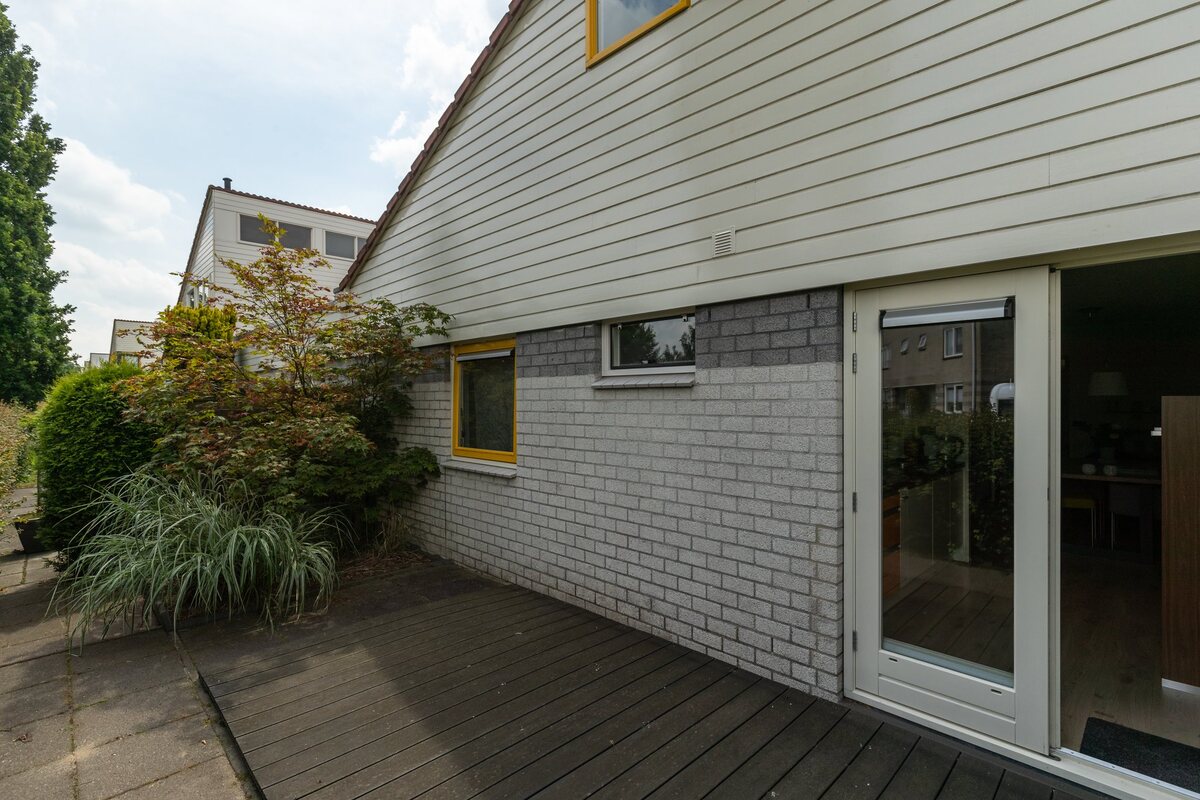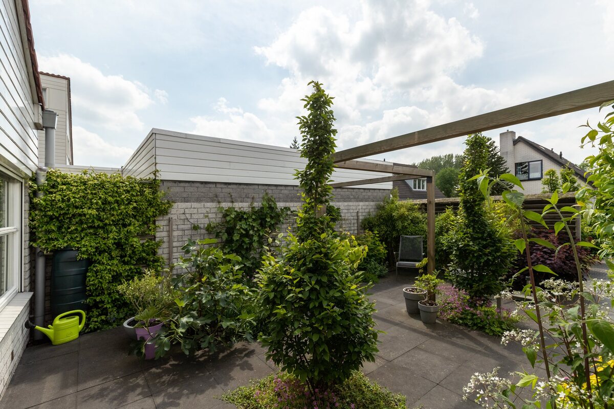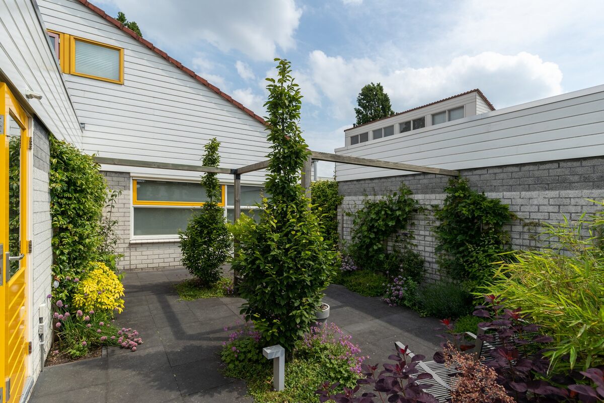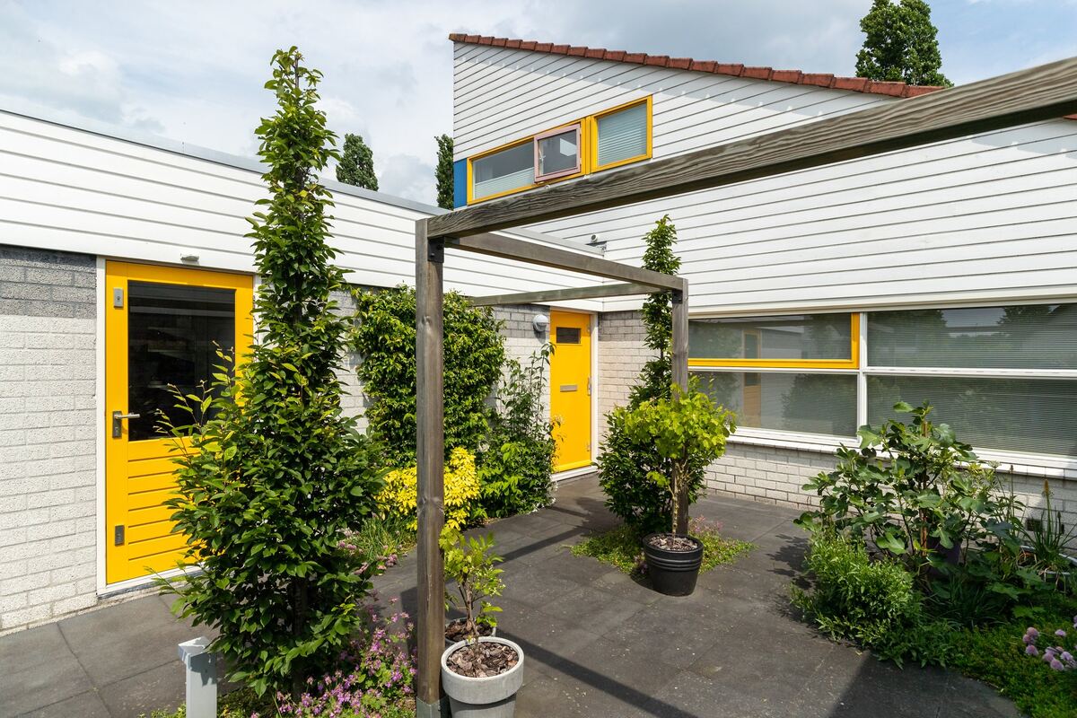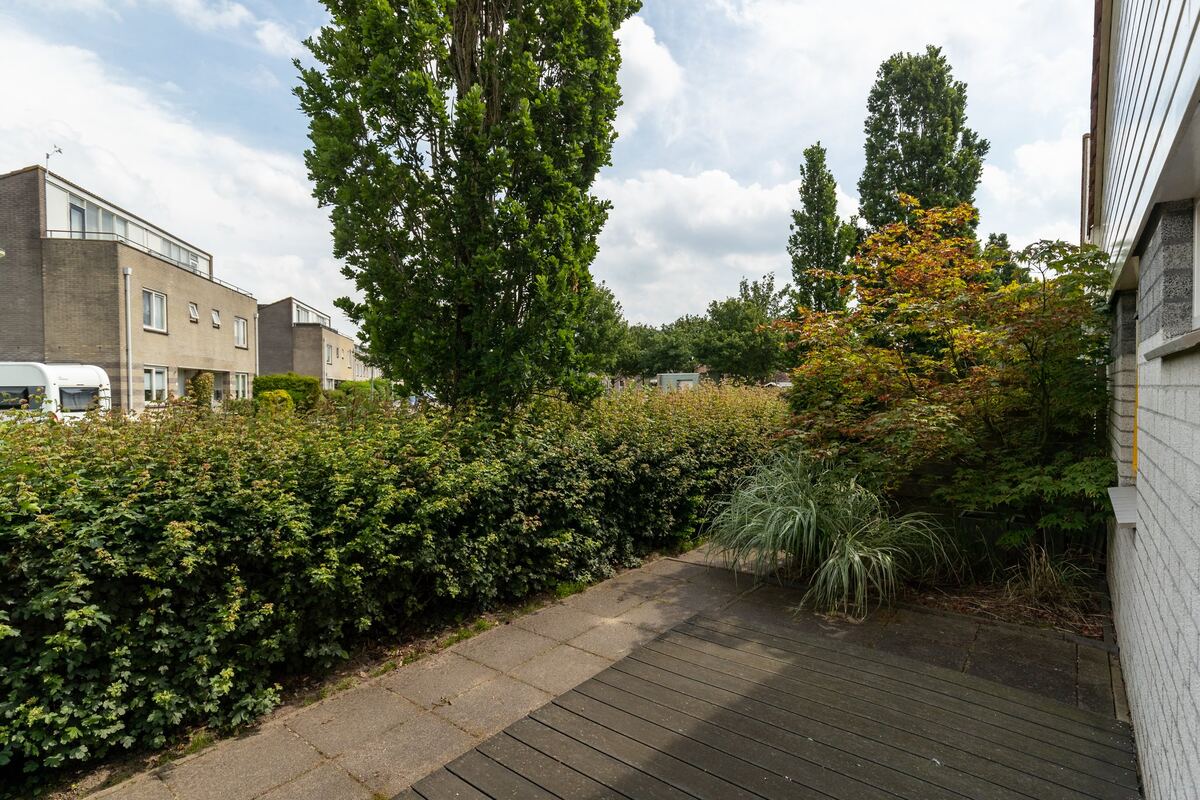 Een zonnige, beschutte en onderhoudsarme voortuin inclusief patio op het zuidwesten. Verder een kleine achtertuin op het noordoosten met uitzicht op groenstrook.