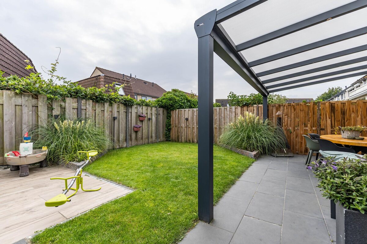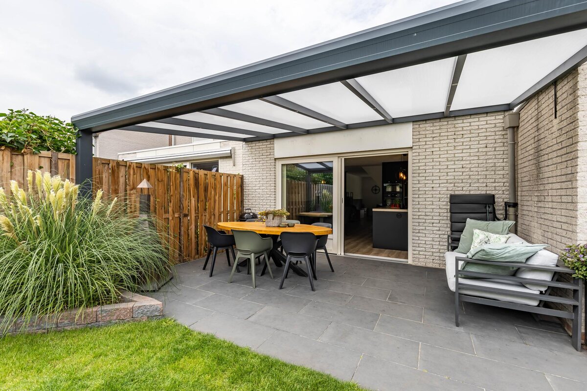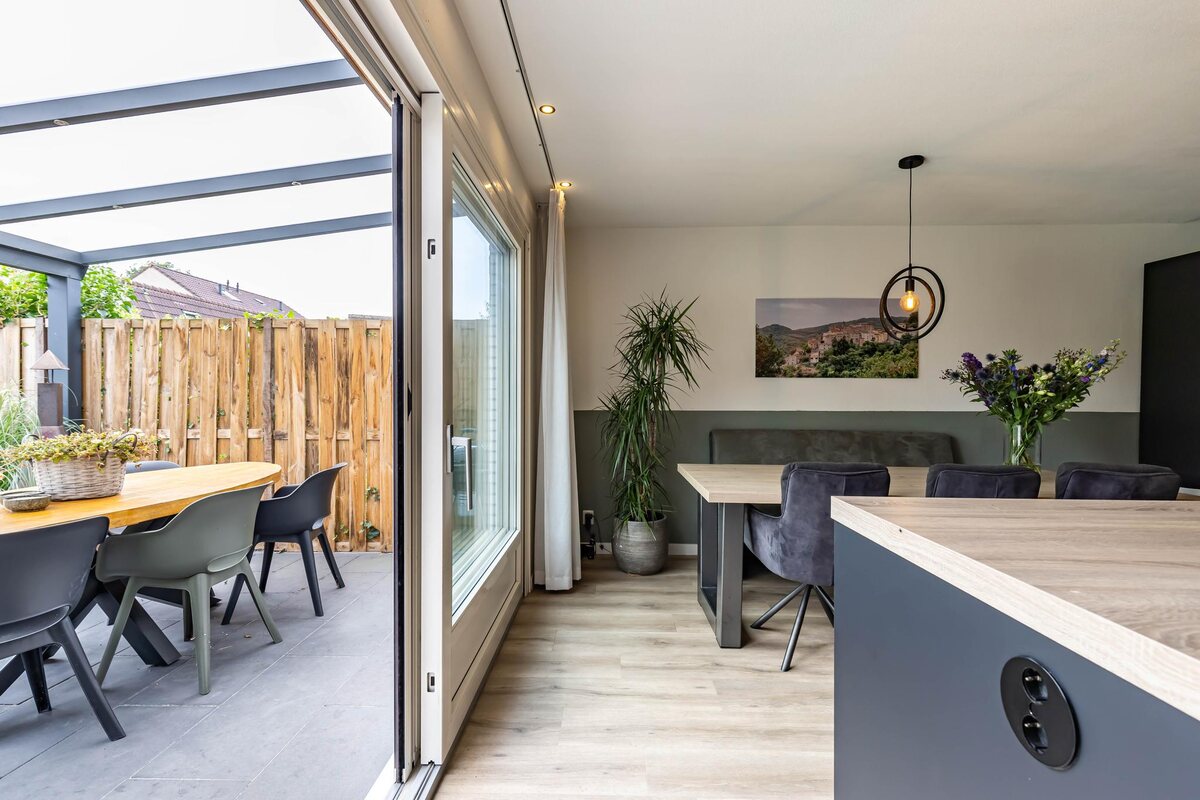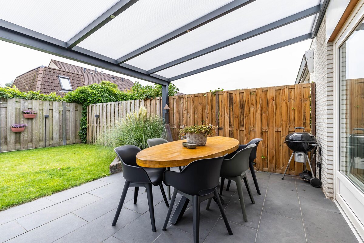 Direct achter de keuken ligt een mooie veranda die aansluit op de zonnige tuin op het zuiden.