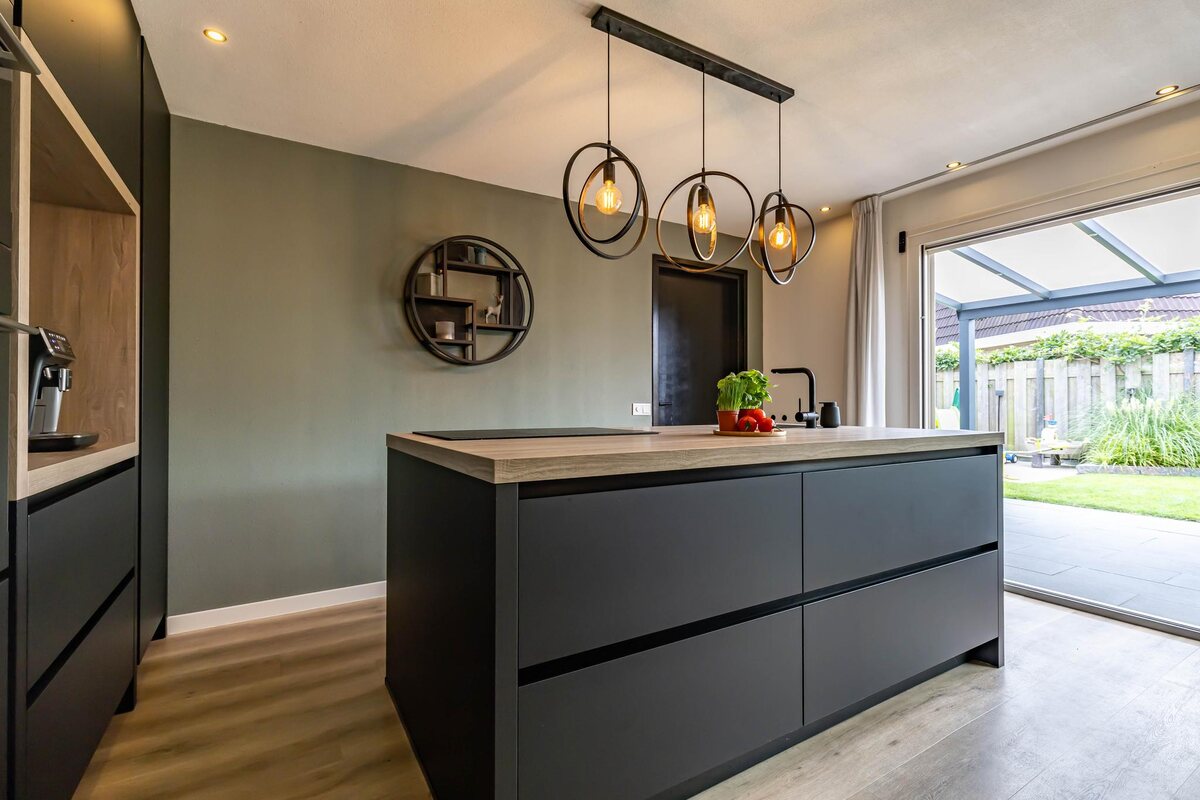 Entree/hal met fraai toilet, trapopgang, meterkast en doorloop naar de woonkamer met open keuken (tezamen 52 m2 groot). De woonkamer ligt aan de voorzijde en kijkt uit op de voortuin. Op de vloer ligt modern en sfeervol pvc (houtlook), verder kan de ruimte extra verwarmd worden door een gezellige houtkachel.Aan de achterzijde een royale en luxe woonkeuken welke is voorzien van een schuifpui naar de tuin en binnendoor naar de bijkeuken en de garage. De keuken inrichting is voorzien van een kook-/spoeleiland en een wandmeubel. Inbouwapparatuur: vaatwasser, grote koelkast, combi-oven, oven, inductiekookplaat met afzuigkap. Daarnaast heeft het wandmeubel een handige pantry.Bijkeuken (ca. 10 m2) met deur naar de tuin en voorgelegen berging (ca. 12 m2).