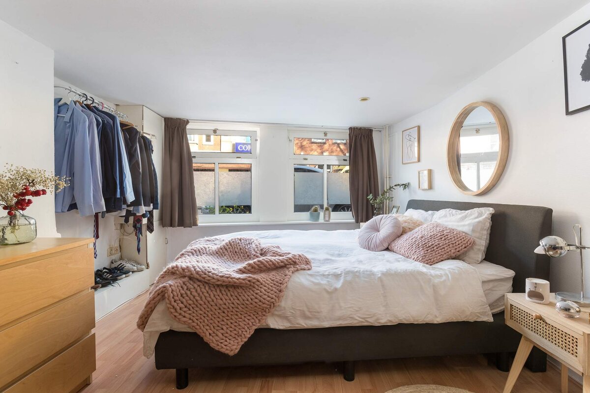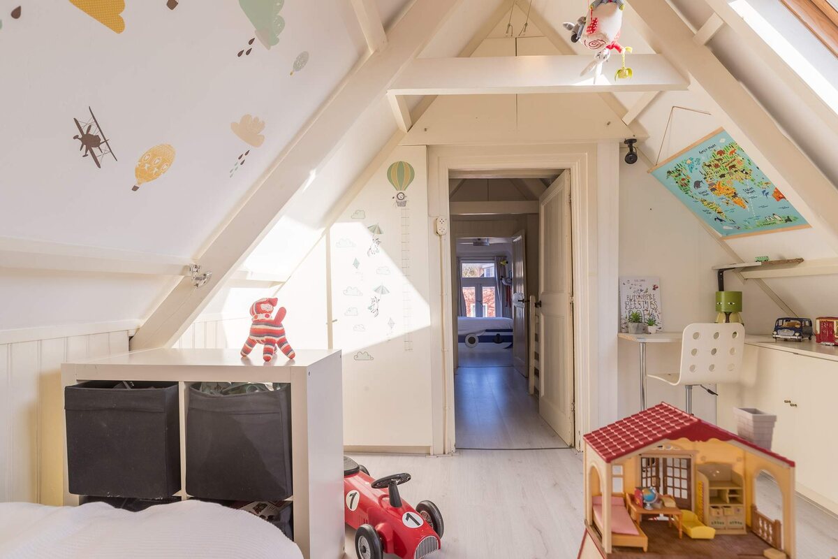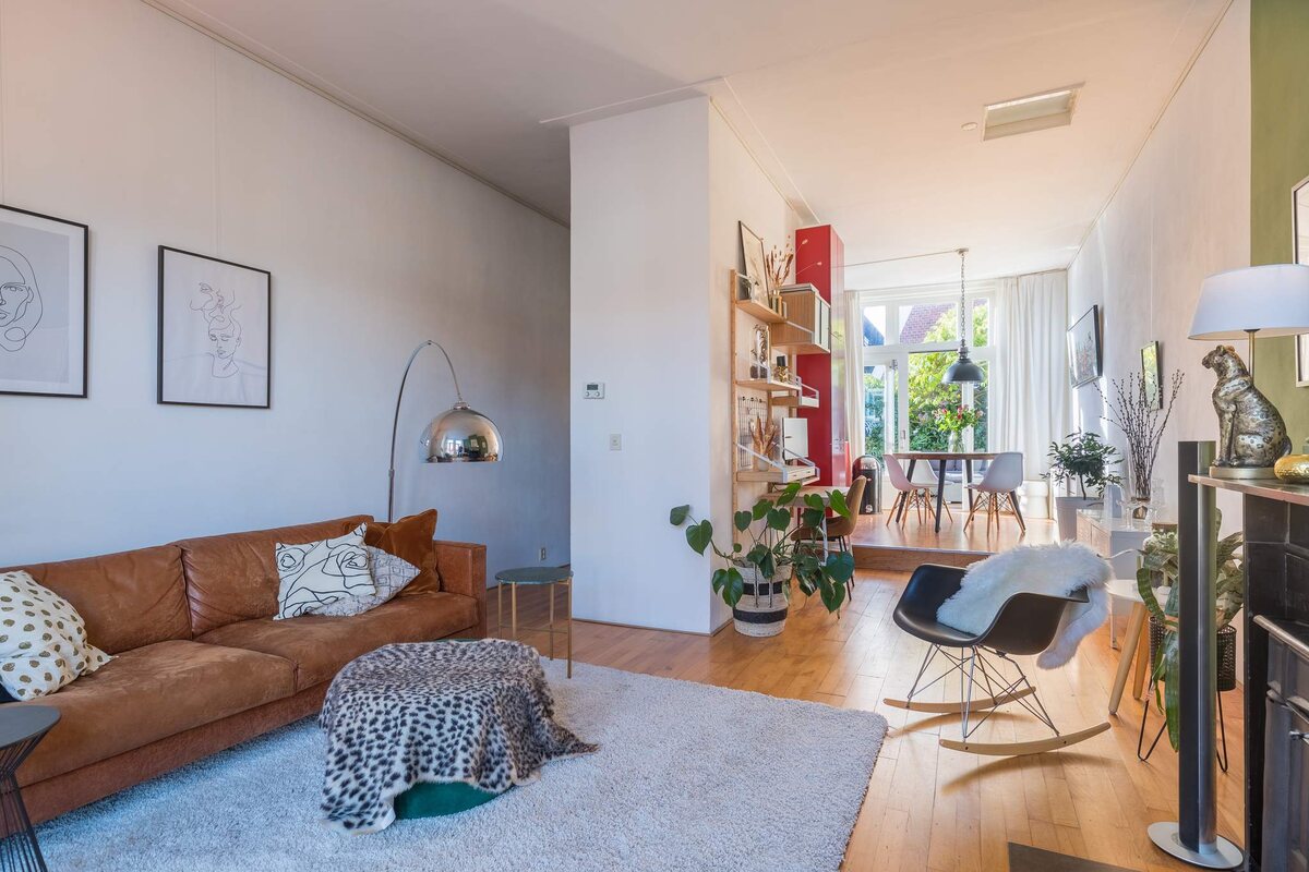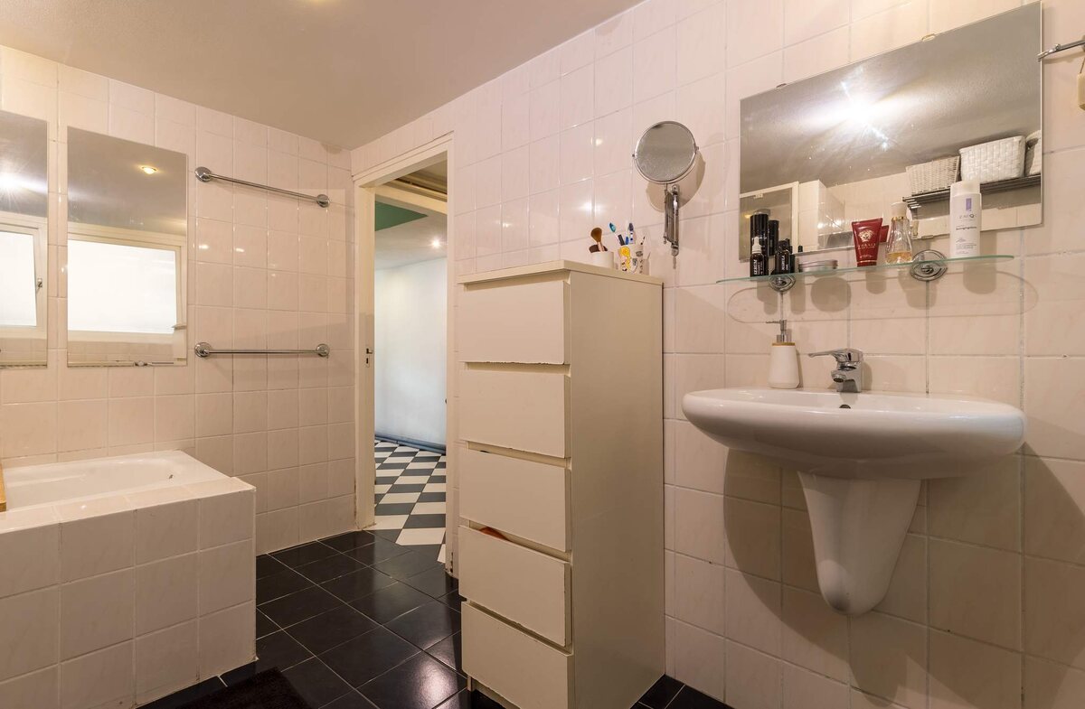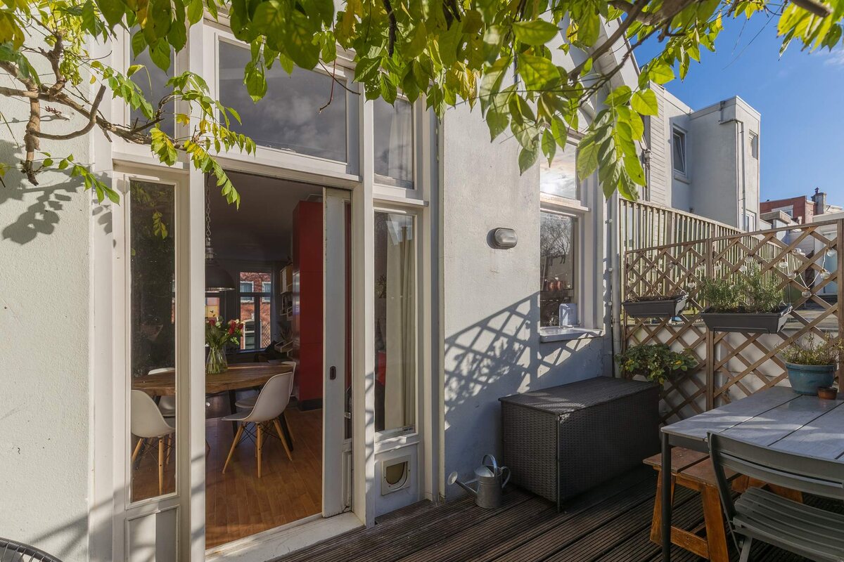 Begane grond/souterrain: entree in halletje met hoog plafond, twee traptreden omlaag naar gang over de volle lengte. Aan de voorzijde een prachtige slaapkamer van 22 m2 met ingebouwde kasten (stahoogte 1.93 m). Aan de achterzijde een flinke badkamer (9 m2) met ligbad, aparte douche, toilet en bidet. Achter de badkamer een buitenplaatsje (met daarboven dakterras) voor fietsen en opslagruimte.Eerste verdieping: ruime woonkamer met sfeer (40 m2) en open haard en een plafondhoogte van 3,10 m. Nette open woonkeuken met apart deel voor eettafel. Schuifdeur naar zonnig dakterras op het westen (15 m2).Tweede verdieping: overloop met ingebouwde kasten en kleine berging. Twee slaapkamers van 13 en 10 m2 (bruto vloeroppervlak), beide met ingebouwde kasten.