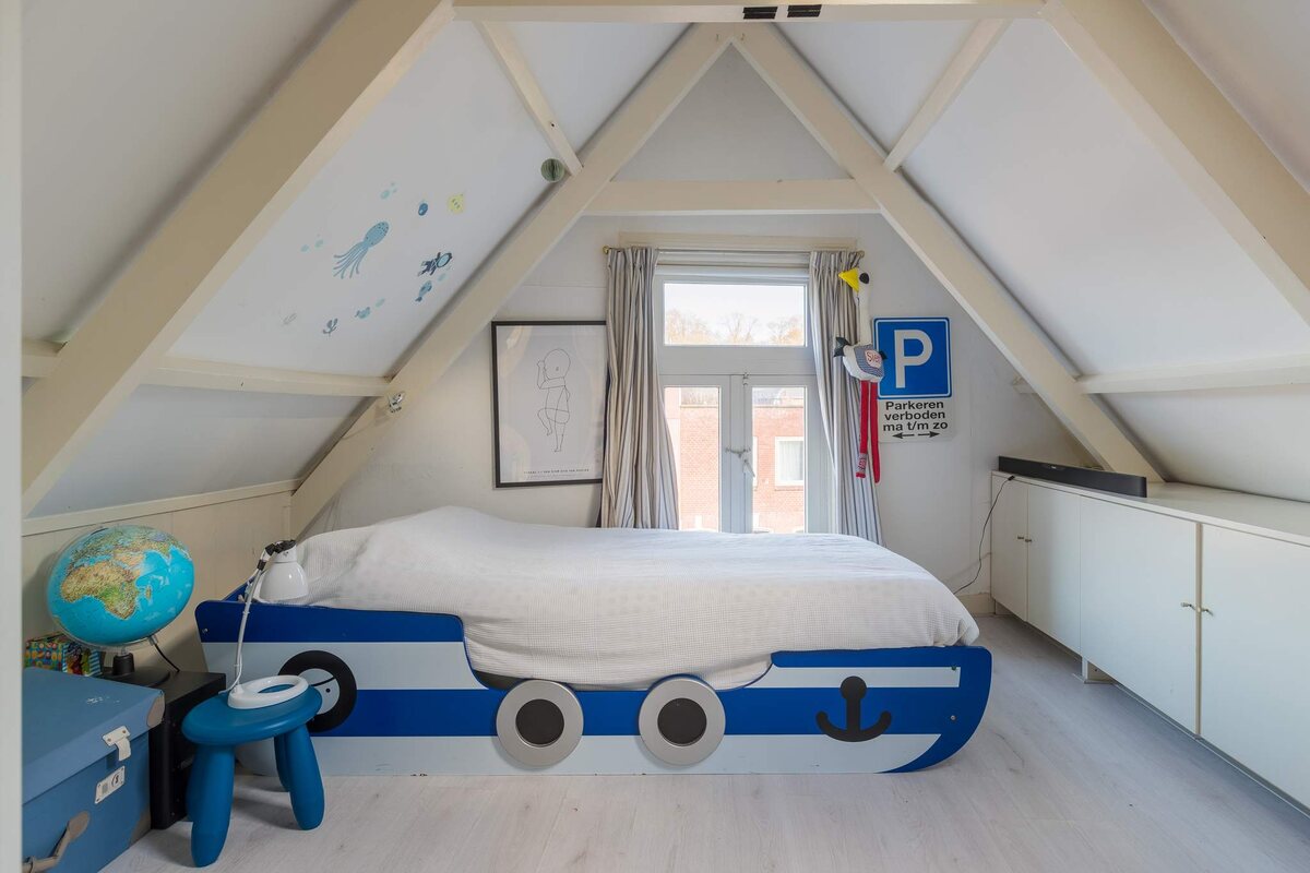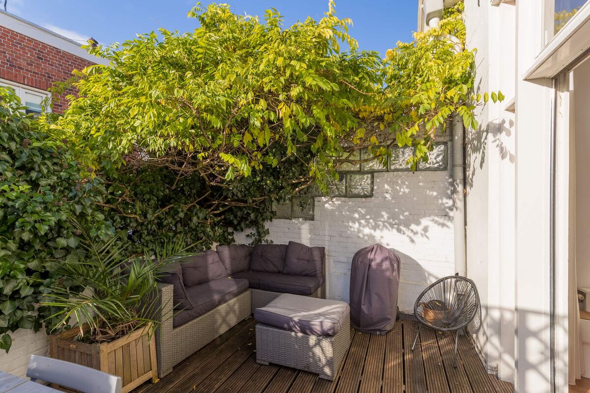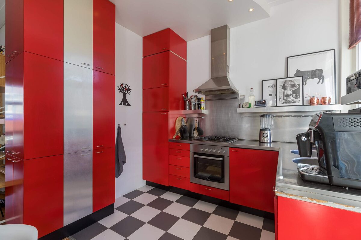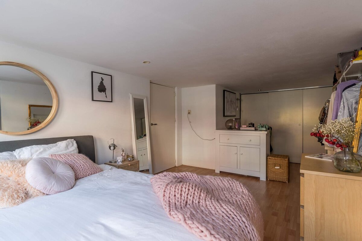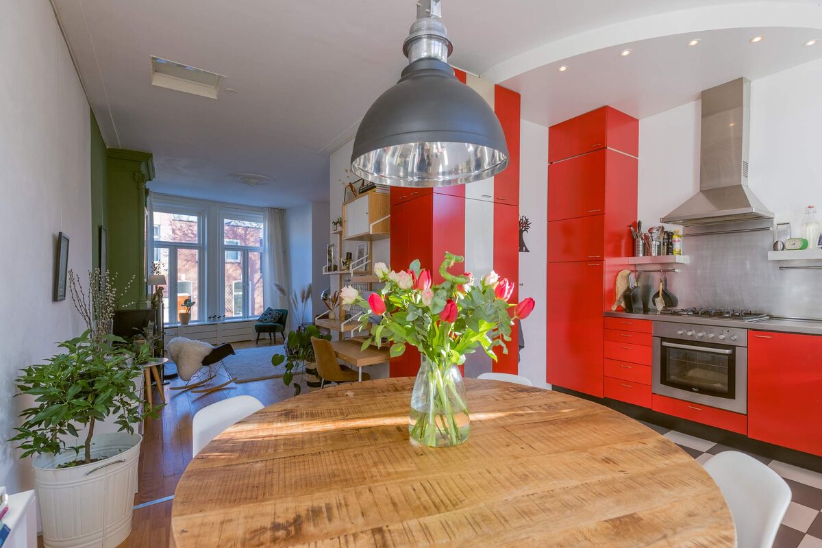 Begane grond/souterrain: entree in halletje met hoog plafond, twee traptreden omlaag naar gang over de volle lengte. Aan de voorzijde een prachtige slaapkamer van 22 m2 met ingebouwde kasten (stahoogte 1.93 m). Aan de achterzijde een flinke badkamer (9 m2) met ligbad, aparte douche, toilet en bidet. Achter de badkamer een buitenplaatsje (met daarboven dakterras) voor fietsen en opslagruimte.Eerste verdieping: ruime woonkamer met sfeer (40 m2) en open haard en een plafondhoogte van 3,10 m. Nette open woonkeuken met apart deel voor eettafel. Schuifdeur naar zonnig dakterras op het westen (15 m2).Tweede verdieping: overloop met ingebouwde kasten en kleine berging. Twee slaapkamers van 13 en 10 m2 (bruto vloeroppervlak), beide met ingebouwde kasten.
