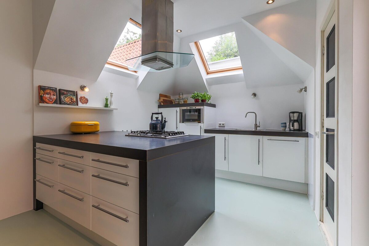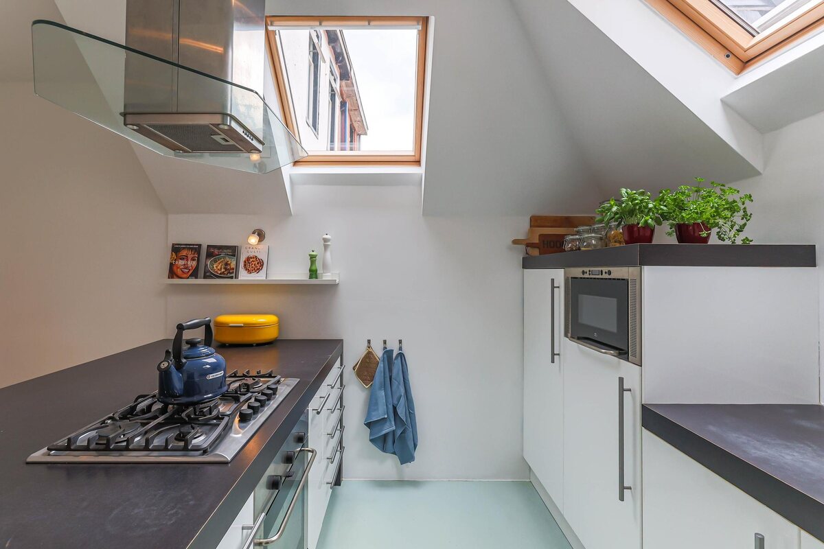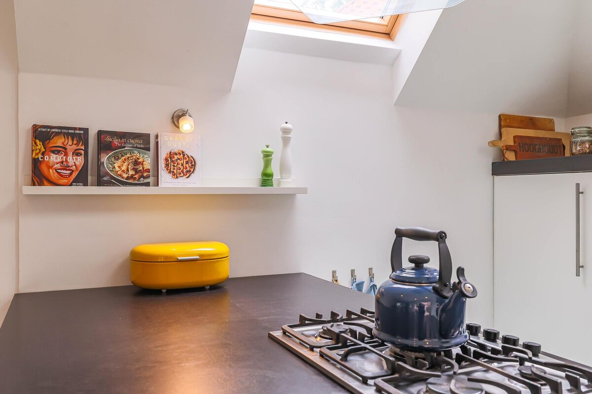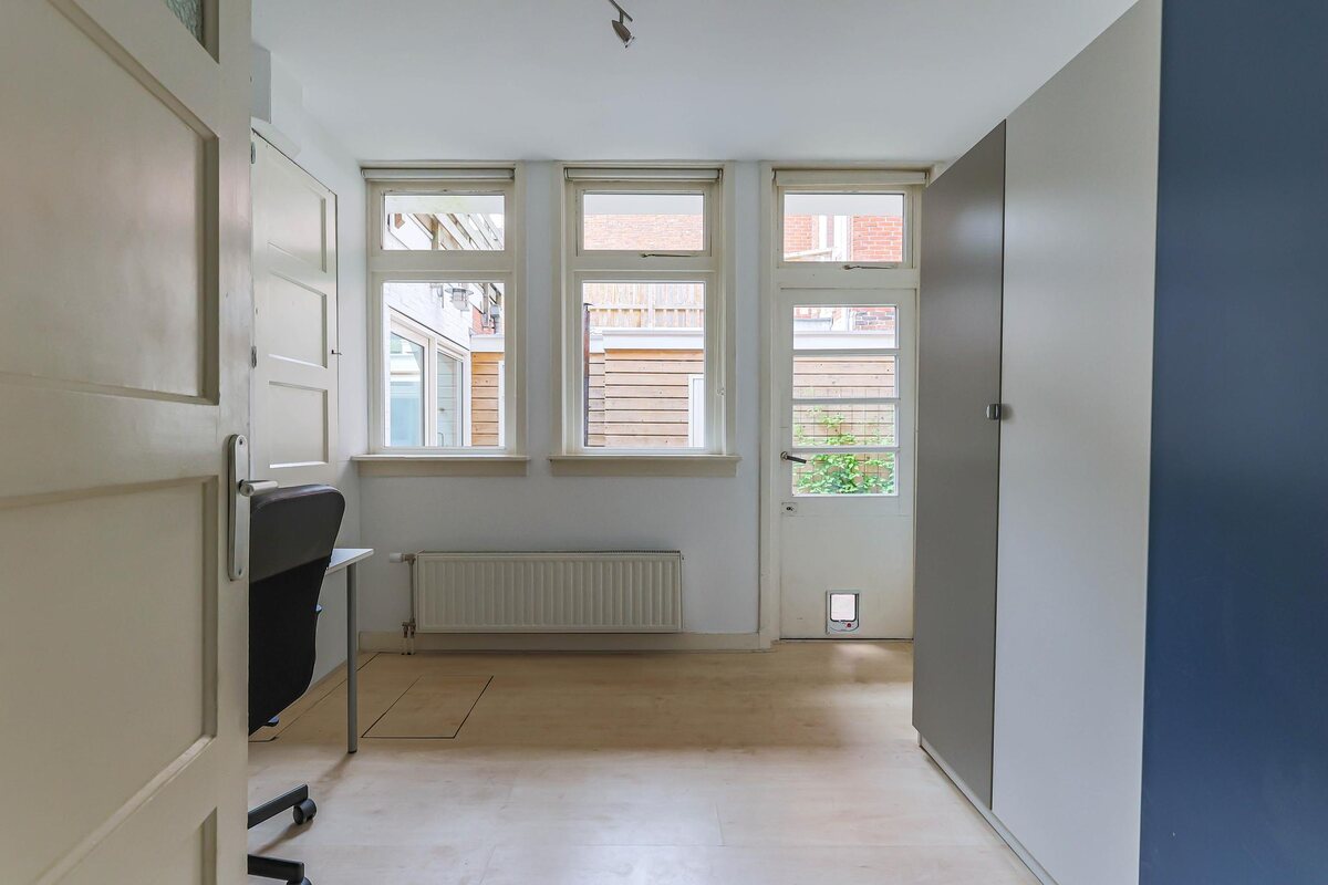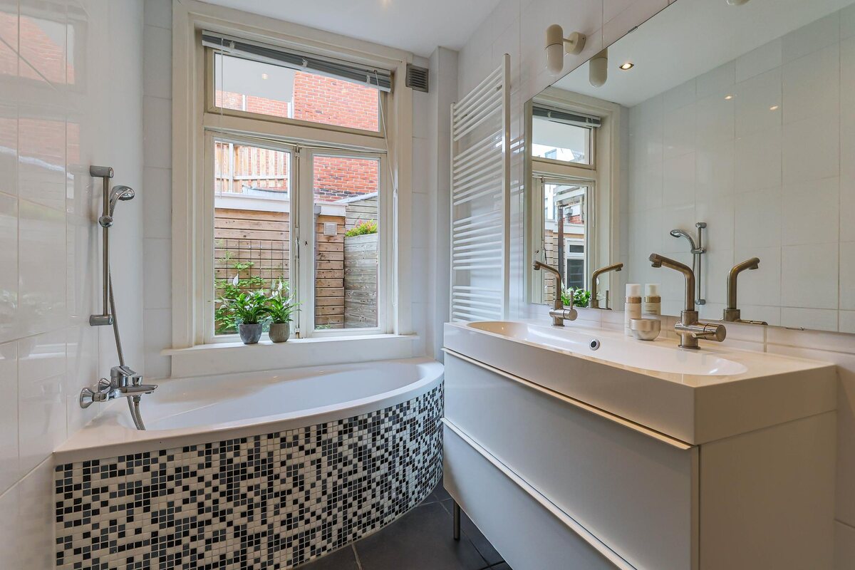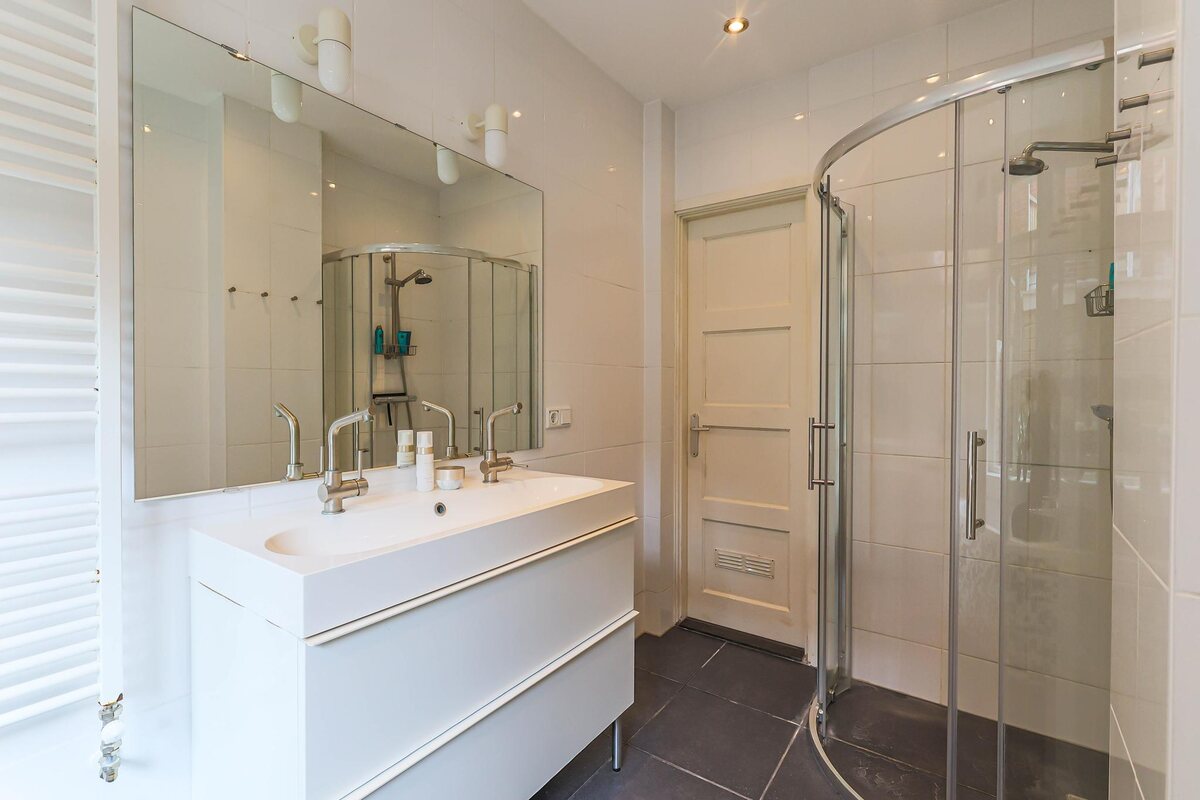 Entree, hal, ruim bemeten stijlvolle woonkamer (ooit de stelplaats voor de melkwagen en het paard van de melkboer) met open keuken, bijna 50 m2. De keuken heeft een schiereiland en is v.v. inbouwapparatuur. Schuifpui naar de sfeervolle stadstuin van 20 m2. Handige bijkeuken. Verder 4 slaapkamers (10, 10, 9 en 7 m2) en een keurige badkamer uit 2010 met ligbad, douchehoek en wastafelmeubel.