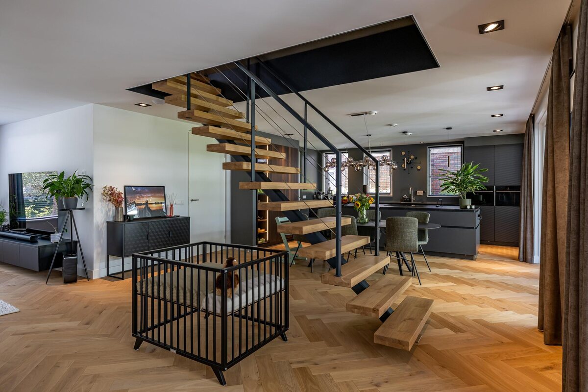 Begane grond: entree, toilet en L-vormige living (maar liefst 77 m2) met eiken vloer en luxe keuken met kookeiland. Dubbele schuifpui (zowel naar de serre (16 m2) als naar de grote overkapping. De open trap is een statement en tegelijk een stijlvolle room divider. Vanuit de keuken toegang tot een praktische bijkeuken (9 m2). Eerste verdieping: overloop en 3 royale slaapkamers (23, 17 en 13 m2). De grootste slaapkamer heeft een fijne walk-in-closet. Keurige badkamer met wastafelmeubel, douche en 2e toilet. Tweede verdieping: Fraaie zolderverdieping met 42 m2 bruto vloeroppervlakte.