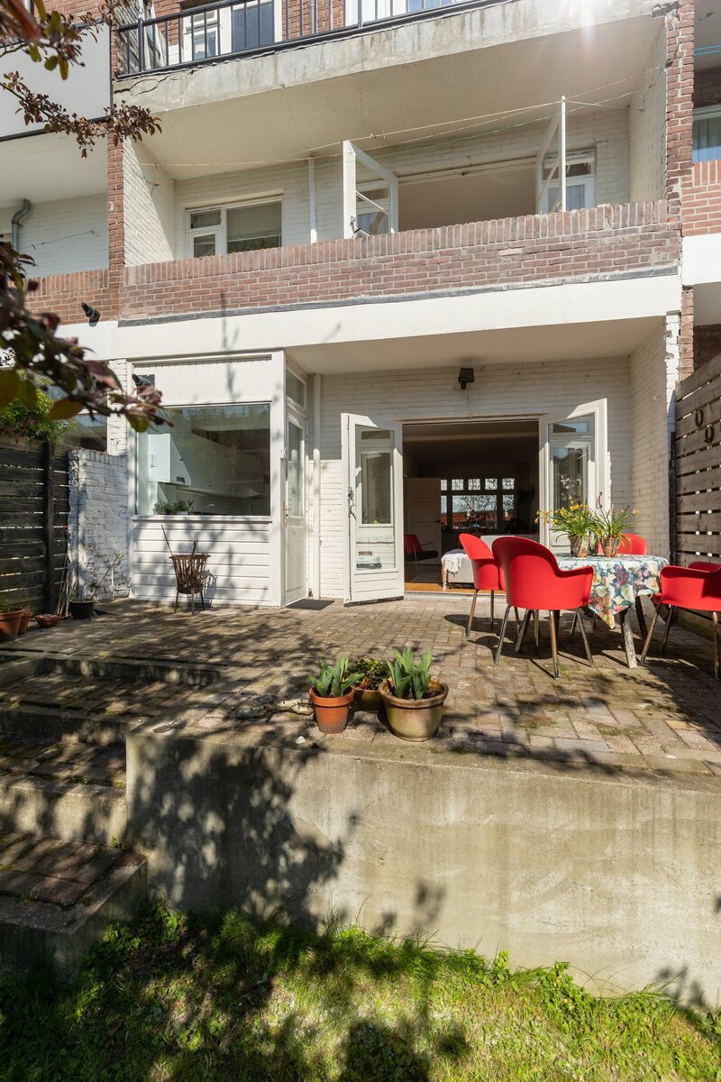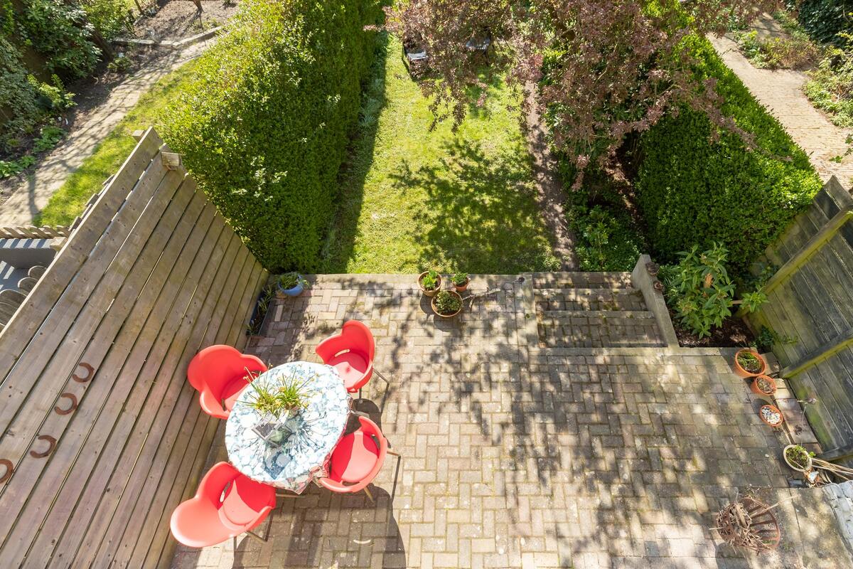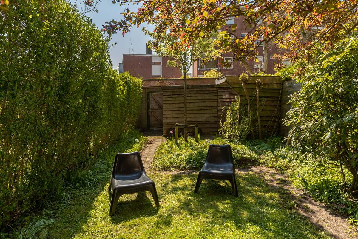 Voortuintje en zeer diepe achtertuin op het zuiden gelegen. Veel rust en groen. Achterom is de woning goed bereikbaar.