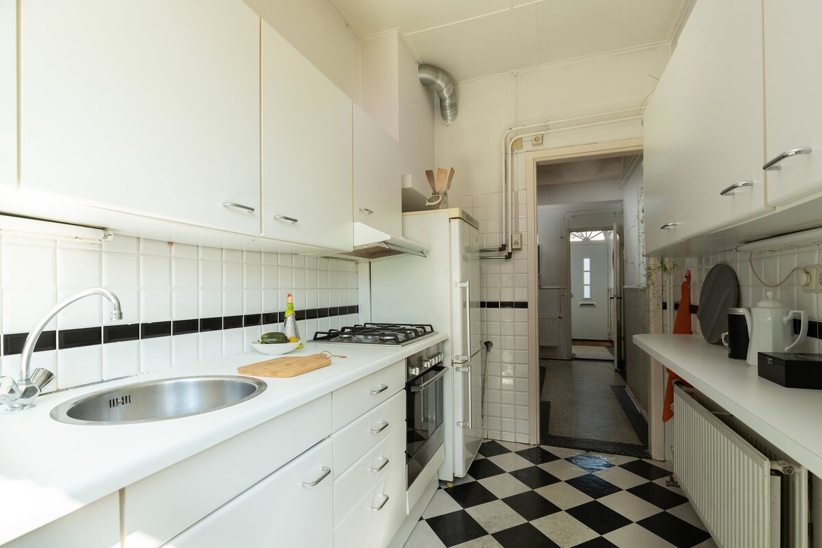 INDELING Begane grond: entree met tochtportaal, hal met trapkast, toilet. Sfeervolle woonkamer en-suite van ca. 30 m2 met houten vloer en openslaande deuren naar de tuin. De besloten keuken is eenvoudig, doch netjes. De keuken heeft eveneens toegang tot de achtertuin. Eerste verdieping: overloop, drie slaapkamers van ca. 5, 11 en 13 m2 waarvan de grootste slaapkamers aan de achterzijde toegang tot het balkon heeft. Twee kamers hebben praktische kastruimte. De badkamer is eenvoudig en functioneel, met douche in ligbad en wastafel.