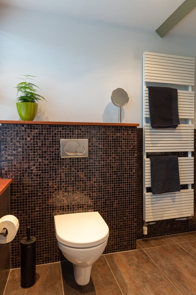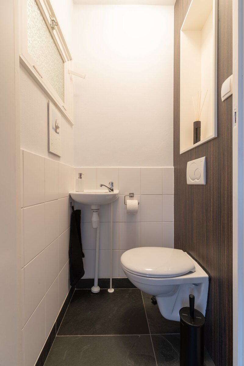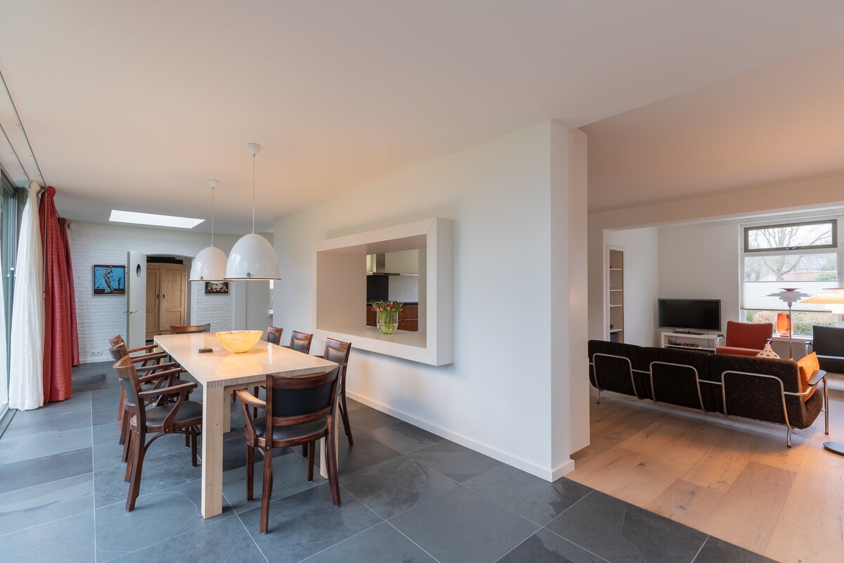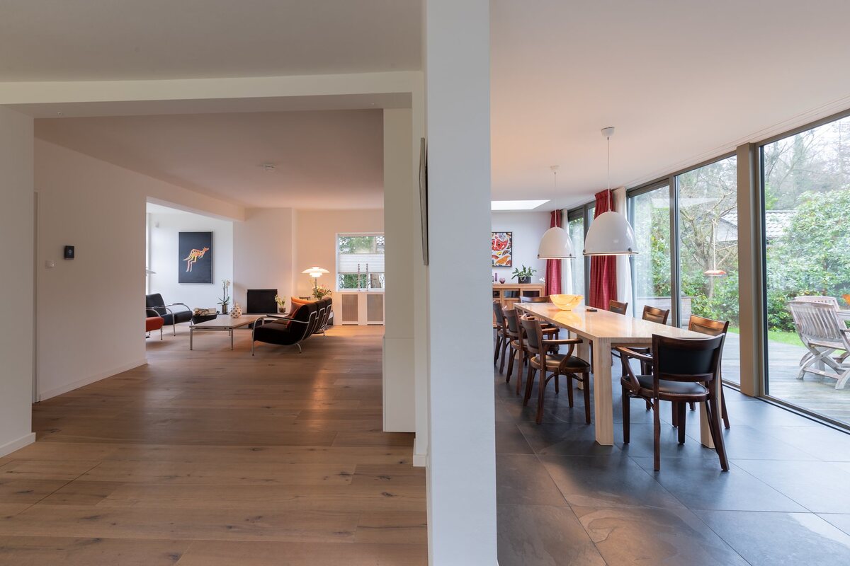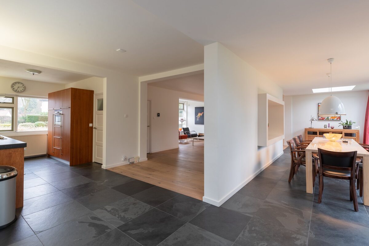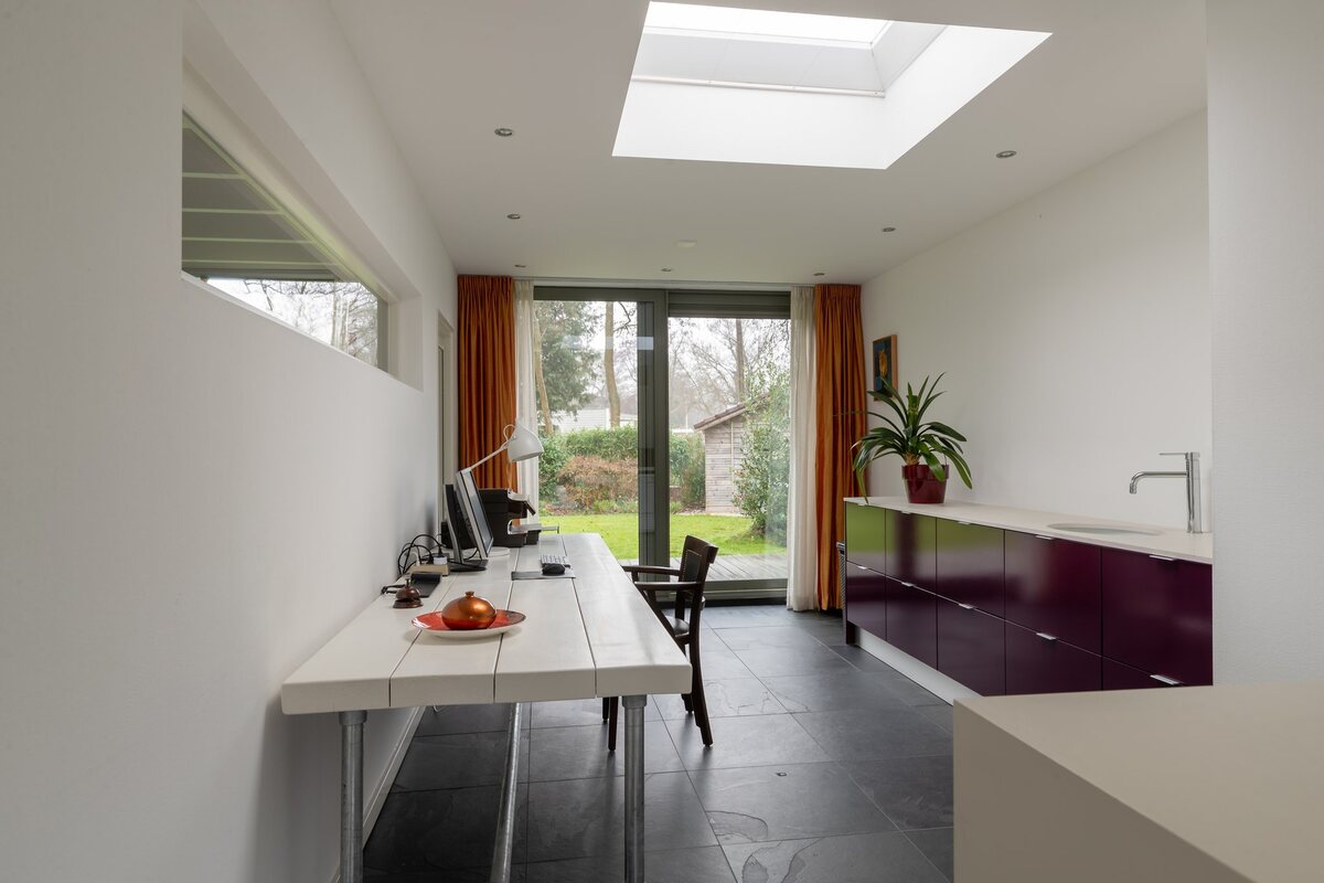 INDELING Begane grond: Via de voorzijde van de woning stapt u de ruime entree binnen. Hier bevinden zich onder andere de trapopgang naar de eerste verdieping en een modern afgewerkt toilet. Vervolgens komt u in de woonkamer van maar liefst 85,8m² groot. Deze ruimte kan opgedeeld worden in een zitgedeelte, eetgedeelte en een keuken. Het eetgedeelte en de keuken zijn voorzien van vloerverwarming. Het zitgedeelte beschikt over een open haard voor extra comfort en sfeer. Door de vele ramen en lichtkoepels komt er veel licht binnen, wat elke hoek van de woonkamer aangenaam maakt. De open keuken is voorzien van diverse inbouwapparatuur (5-pits gaskookplaat, combi-oven, koelkast, vrieskast, vaatwasser) en afgewerkt met een natuurstenenblad. Daarnaast is er nog een kleine kelder die vanuit de keuken te bereiken is. Ideaal voor etenswaarden die koel bewaard moeten worden. Via de keuken is er toegang tot de bijkeuken en werkkamer van respectievelijk 5,7m² en 16,9m² en beschikken over een eigen groepenkast. De werkruimte is voorzien van veel ramen en een lichtkoepel. De bijkeuken is ook van buitenaf te bereiken via openslaande deuren.