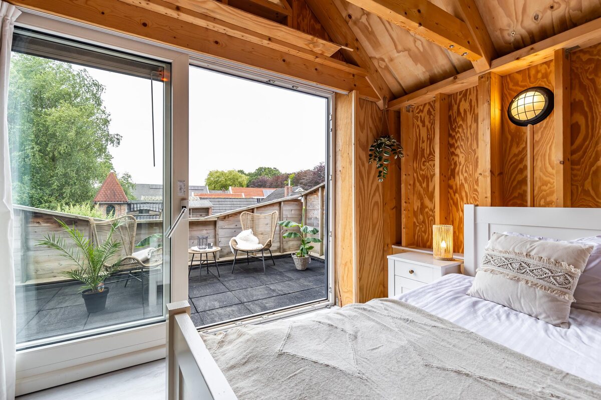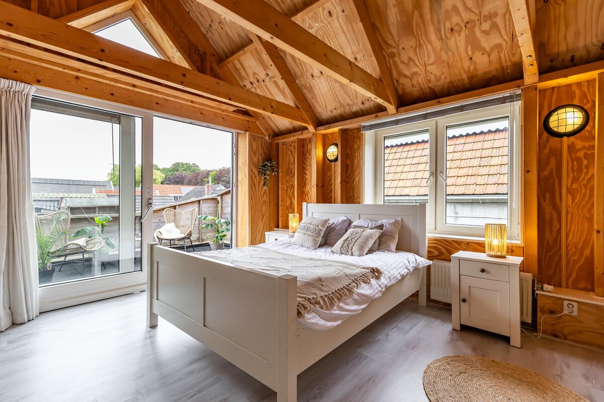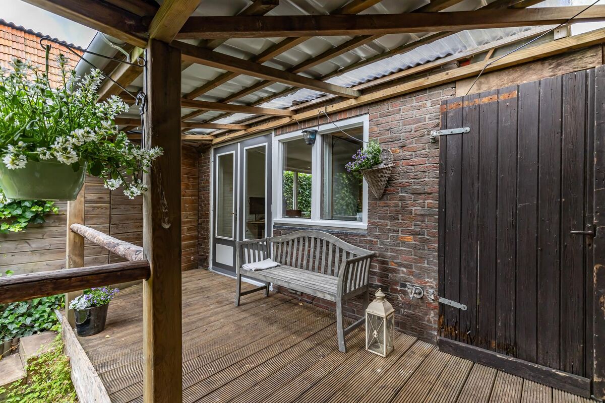 Indeling: Hal/entree (ca. 5 m2) met toilet en toegang tot de woonkeuken, badkamer en een slaap-werkkamer. Gezellige woonkeuken (ca. 14 m2, verhoogde vloer, balken plafond) met wandmeubel voorzien van inbouwapparatuur. Doorloop naar de woonkamer.Leuke woonkamer (ca. 21 m2) eveneens met balkenplafond, sfeervolle Italiaans natuurstenen vloer en open trap naar de verdieping. Eenvoudige badkamer (ca. 7 m2) met groot ligbad , wastafelmeubel en douche. Slaap-werkkamer (ca. 10 m2) met deur naar de bijkeuken en openslaande deuren naar de veranda aan het begin van de tuin. Bijkeuken met wasmachine en droger aansluiting. Verdieping: ruime overloop (ca. 11 m2) met toegang tot drie slaapkamers en de badkamer. Royale en sfeervolle slaapkamer aan de achterzijde (ca. 19 m2) met schuifpui naar het royale dakterras (ca. 14 m2). Slaapkamer voorzijde (ca. 14 m2), met fraaie vide en een betstede. Slaapkamer zijgevel (ca. 11 m2) eveneens met vide.