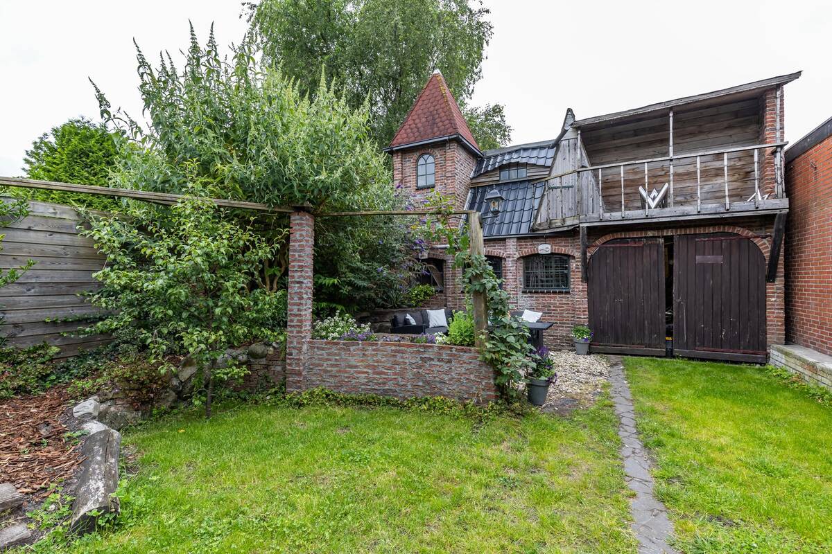 Diepe (ca. 12 meter) zonovergoten tuin met aan de gevel een veranda. Gazon, borders, een gezellig en beschut terras en aan achterzijde een ruime kasteelschuur (ca. 6,5 bij 6,5 met openslaande deuren naar de tuin en een additionele zolderverdieping van ca. 21 m2).De tuin is via een brede achterom (er kan een auto langs) bereikbaar. Houten carport en berging. Aan de andere zijde bevindt zicht een aangebouwde berging.