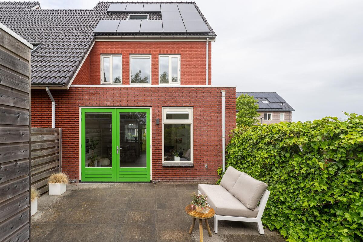 De voortuin is verzorgd. De achtertuin is zonnig (gelegen op het zuidwesten), is onderhoudsarm en heeft een houten berging. Tevens voorzien van een praktische achterom. Geen achterburen; zicht op de landerijen.