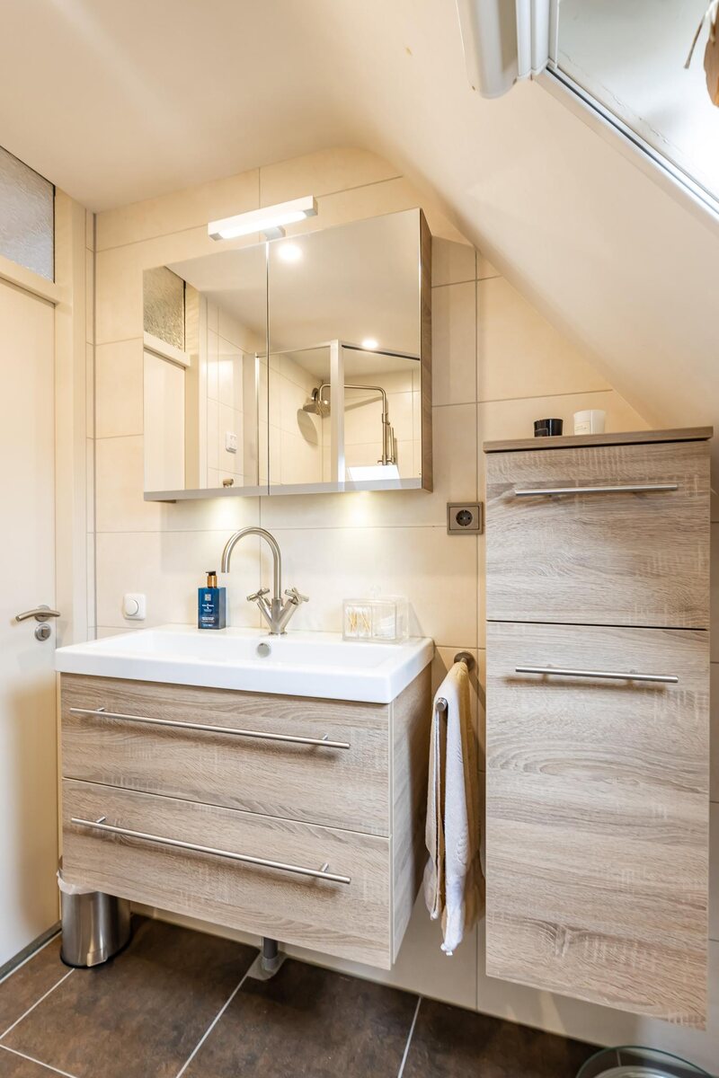 Eerste verdieping: overloop en toegang tot drie slaapkamers en de badkamer.De slaapkamers zijn ca. 12 (voorzijde met dakkapel), 8 (achterzijde met dakraam) en 7 m² (met zijgevelraam). Keurige badkamer (ca. 4 m²) is voorzien van een douche, een wastafelmeubel en een tweede toilet.