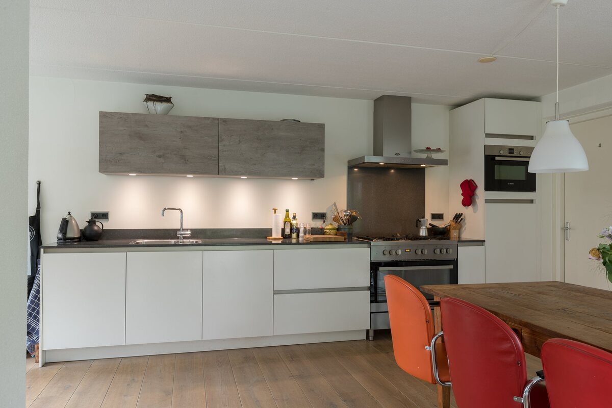 Begane grond: entree met toilet en toegang tot de ruime woon-/eetkeuken van ca. 52.7m². De woonkamer beschikt over grote raampartijen met veel lichtinval. De moderne keuken uit 2014 is voorzien van diverse inbouwapparatuur. Via de keuken is de bijkeuken te betreden met daar aangrenzend de hobby-/werkkamer. De garage is zowel van binnenuit als buitenlangs te bereiken. Een kunststof schuifpui geeft direct toegang tot de tuin.