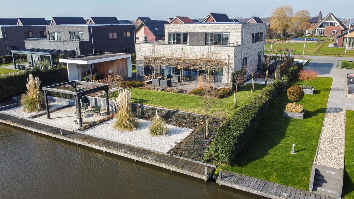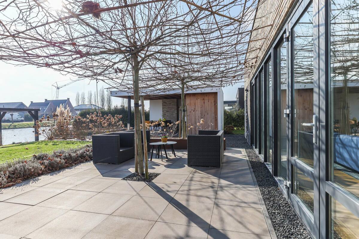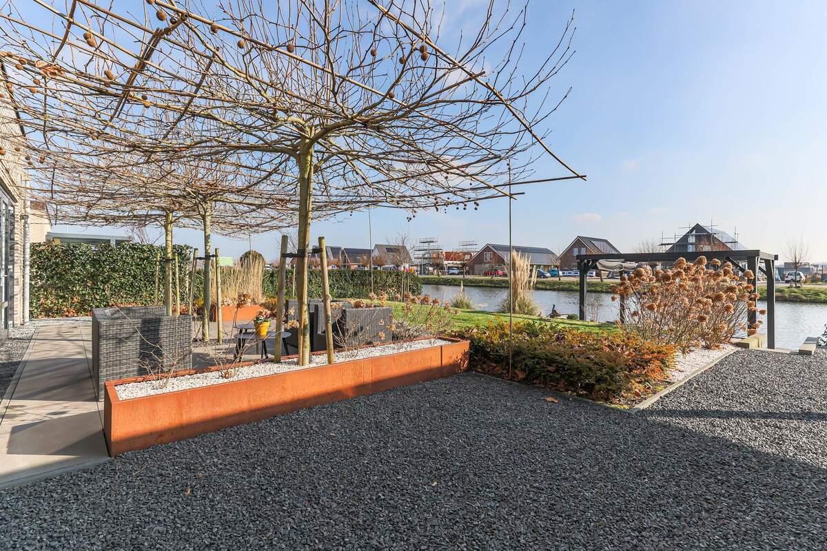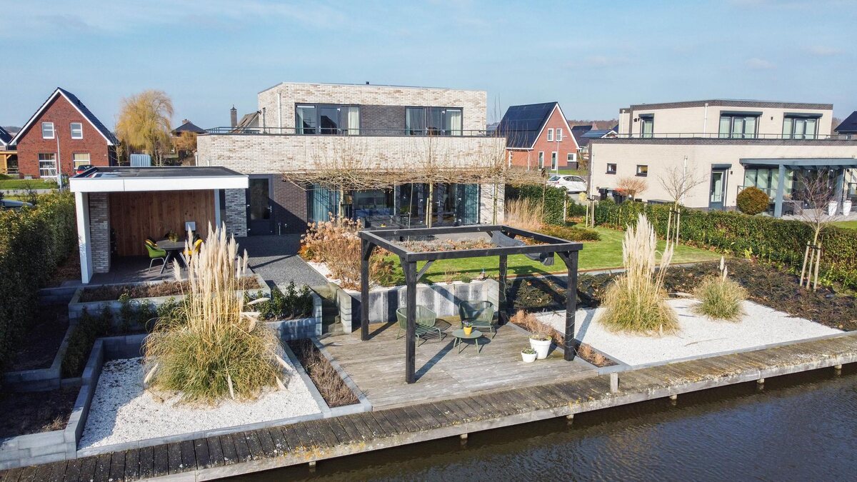 Prachtige tuin met terrassen, borders, gazon en een lekker in de luwte gelegen houten veranda met berging.De kavel ligt over de gehele breedte aan het water, er is derhalve ruimte voor een flinke boot.
