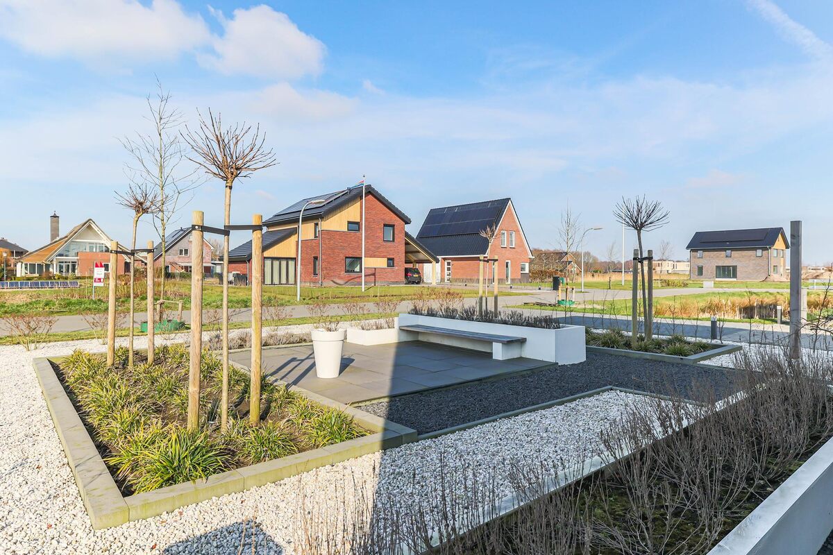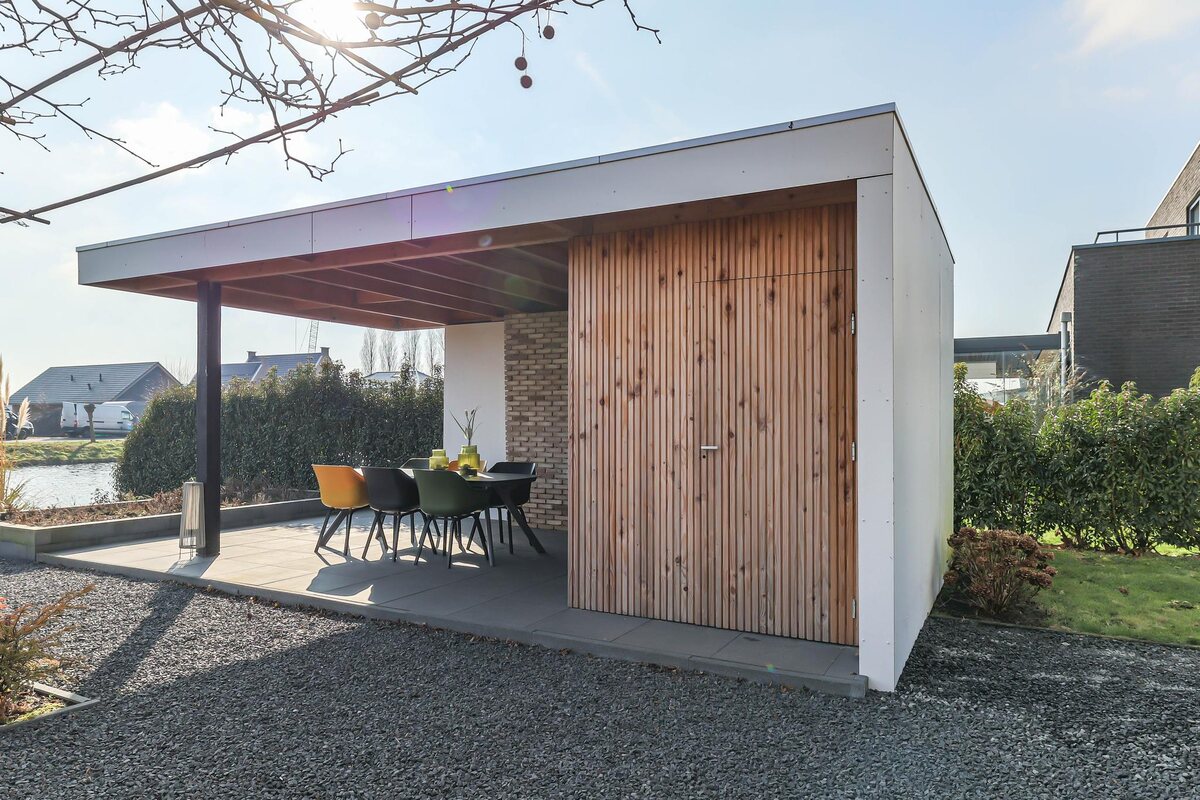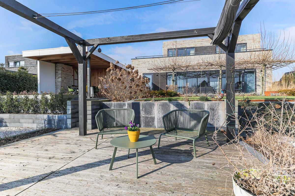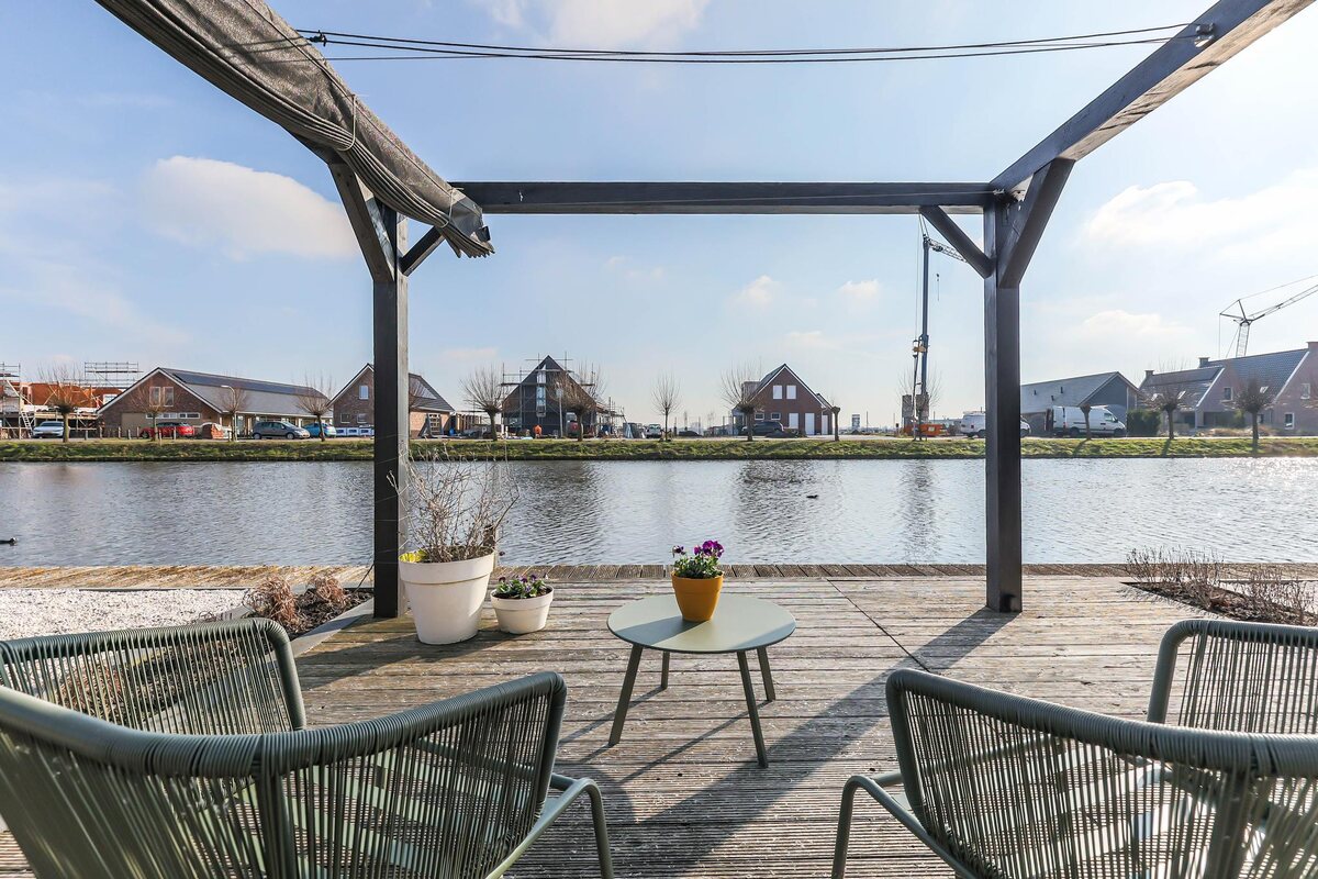 Prachtige tuin met terrassen, borders, gazon en een lekker in de luwte gelegen houten veranda met berging.De kavel ligt over de gehele breedte aan het water, er is derhalve ruimte voor een flinke boot.