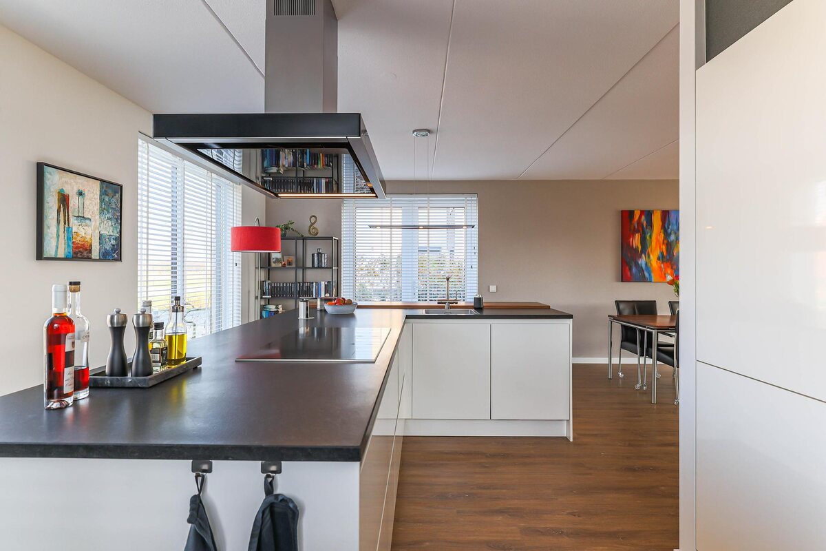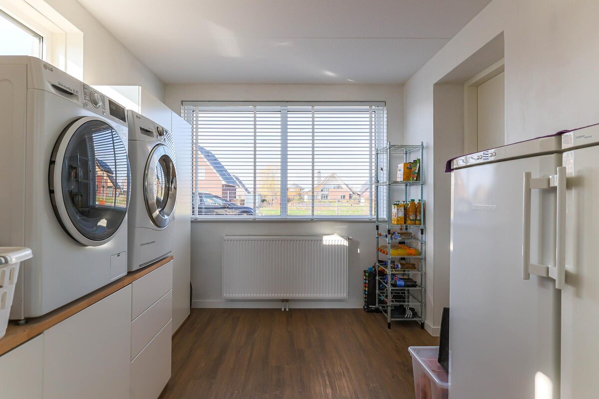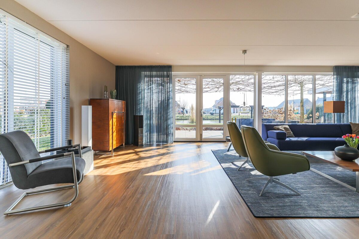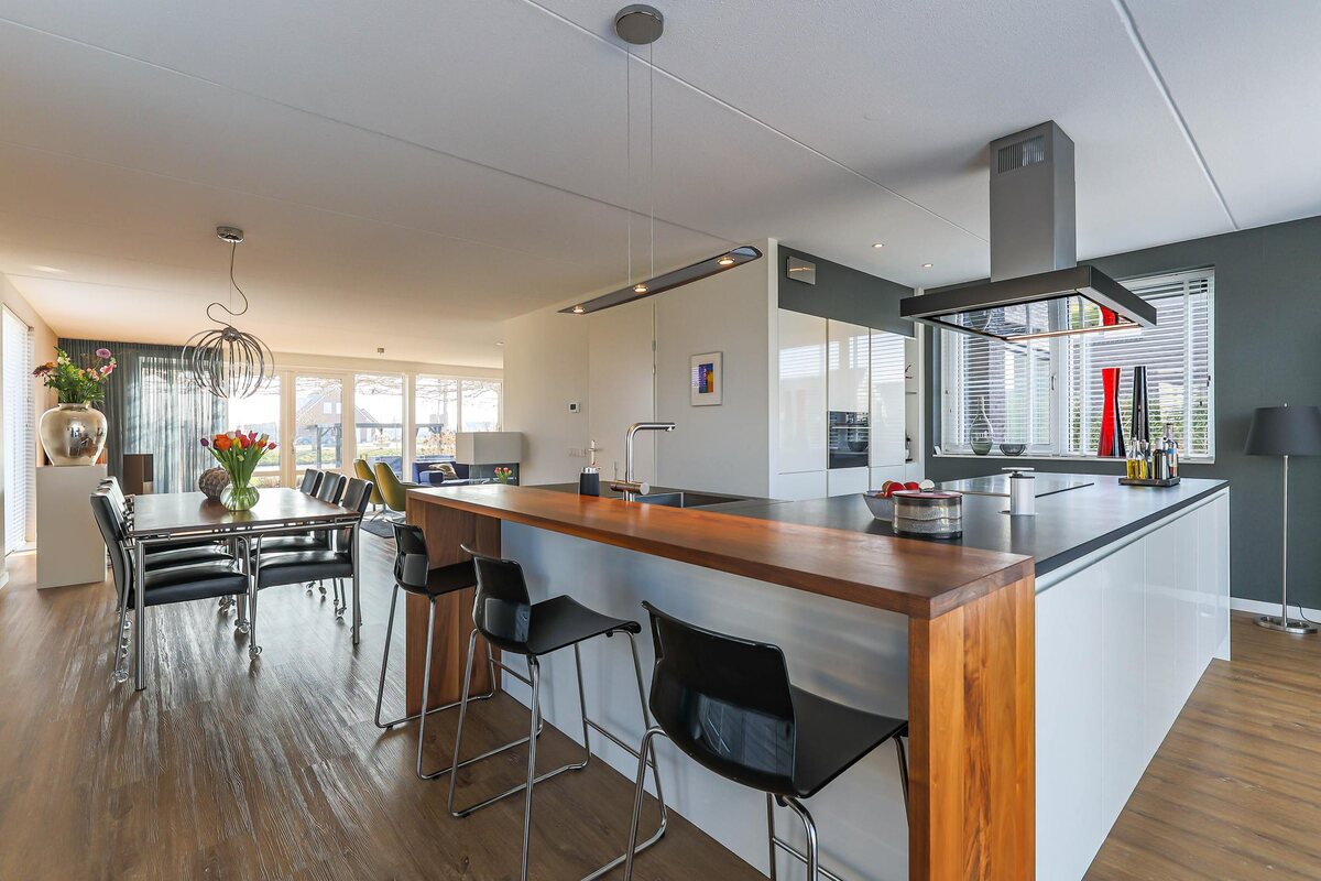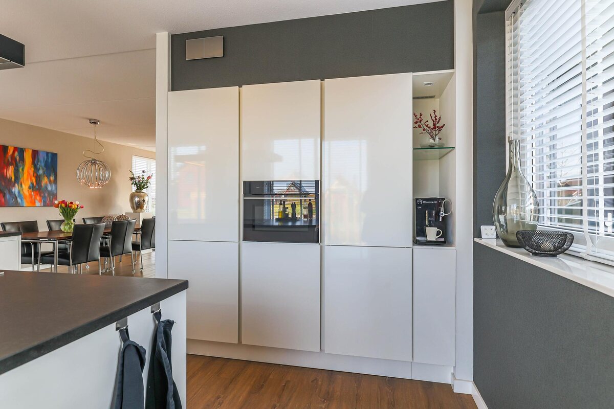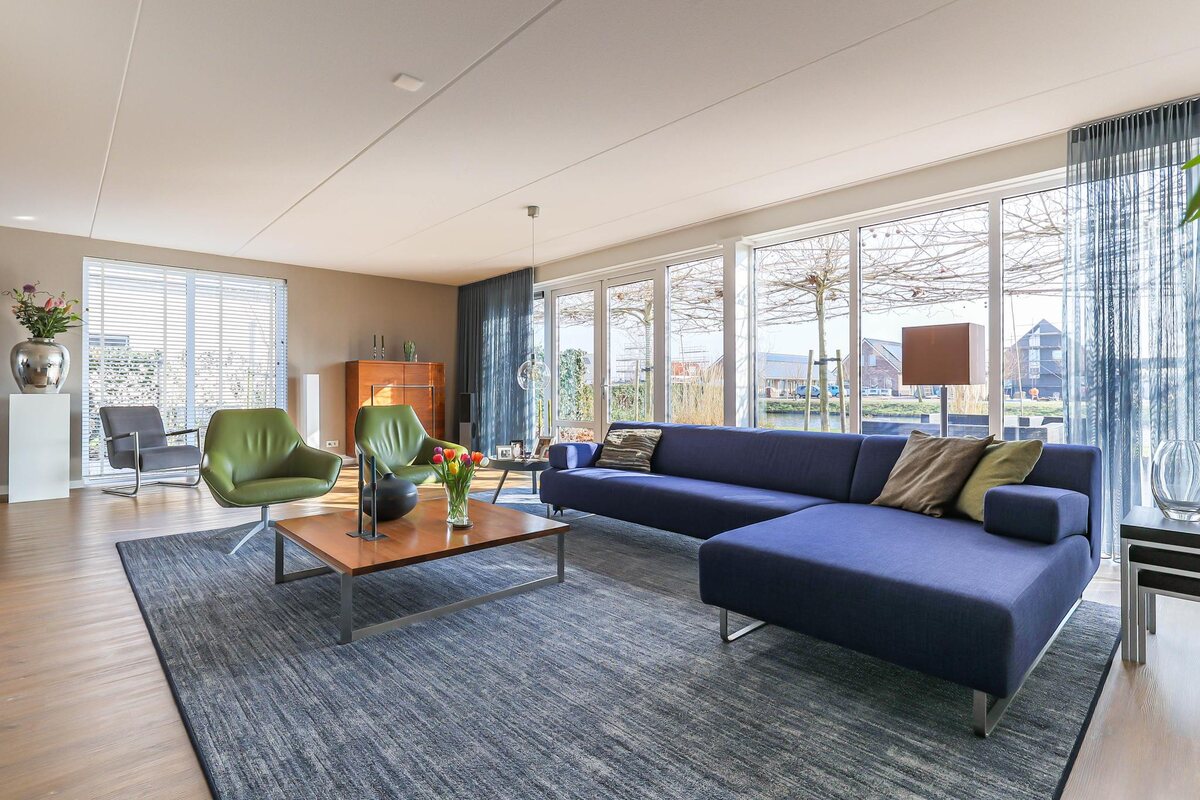 Hal/entree (ca. 11 m2) met mooie trapopgang, royaal en modern toilet, meterkast en toegang tot de woonkamer en bijkeuken.Riante living met open keuken (tezamen bijna 90 m2!) met een grandioos uitzicht op de tuin en het achter gelegen water. De pui van de woonkamer is bijna negen meter breed en geeft derhalve panoramisch zicht en heel veel licht. De woonkamer heeft verder een fraaie aankleding middels een laminaat pvc vloer (nieuw product), een stijlvolle gashaard en open slaande deuren naar de zijtuin en de achtertuin.Heerlijke woonkeuken met bar en een kook- en spoeleiland voorzien van inductiekookplaat, vaatwasser en quooker. Wandmeubel met grote koelkast, combioven en veel bergruimte. Alles in leuke kleurstelling en met veel omliggend raamoppervlak.Bijkeuken (ca. 10 m2) met wasmachine aansluiting en doorloop naar de ruime berging (ca. 14 m2), welke is voorzien van een loopdeur naar de tuin.