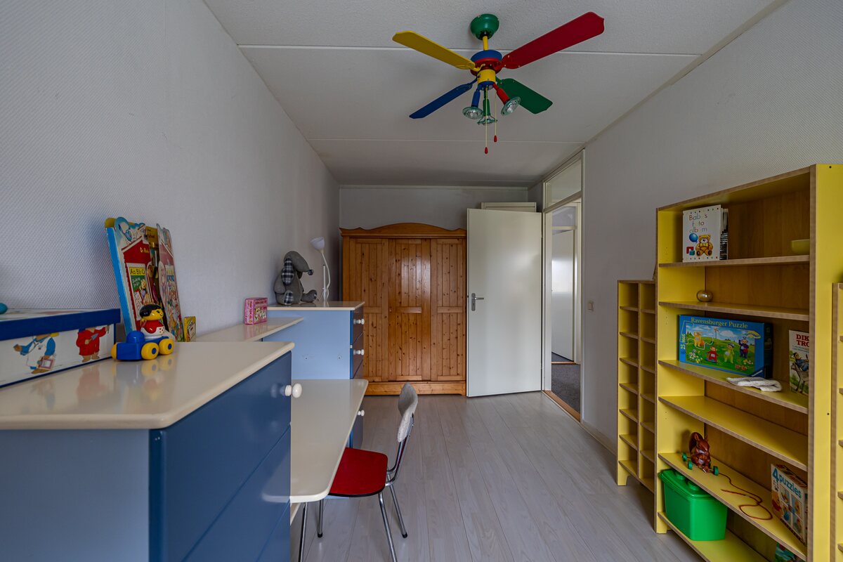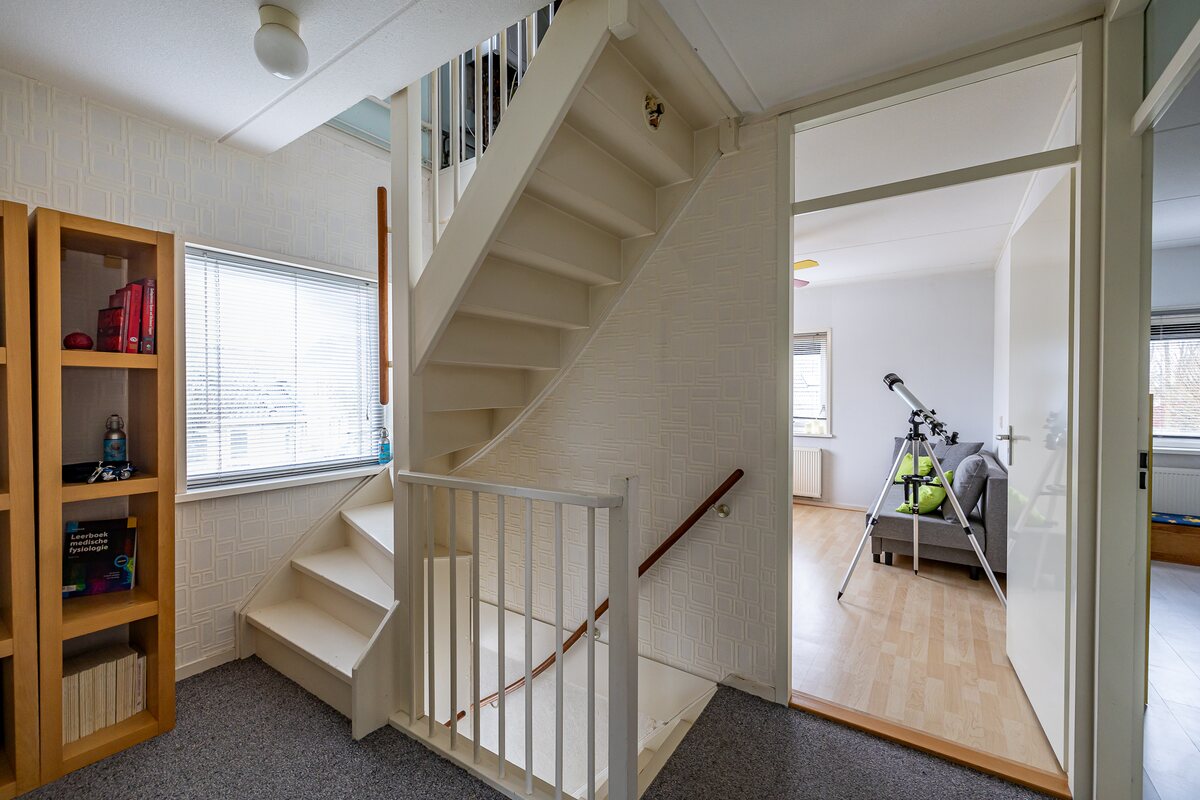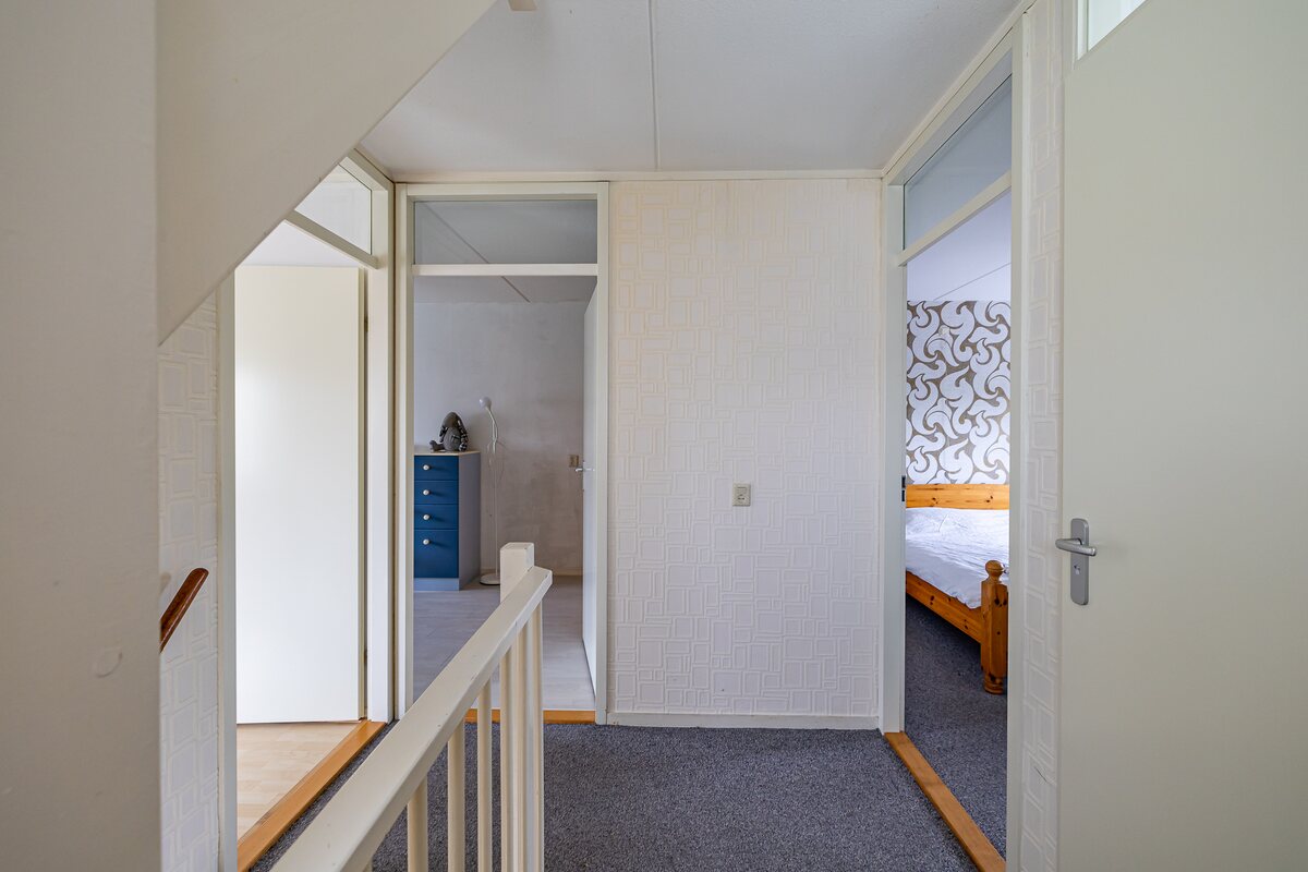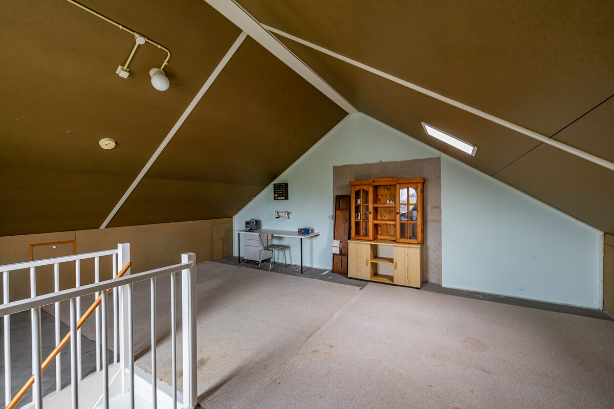 Begane grond: Entree/hal, meterkast, toilet en toegang tot de woonkamer.Lichte L-vormige woonkamer (ca. 36 m²) met zicht op voorliggende groenstrook, open keuken en schuifpui naar de tuin. Open eenvoudige keuken (ca. 9,5 m²) met doorloop naar de bijkeuken.Bijkeuken (ca. 7 m2) met pantry en wasmachine-aansluiting, loopdeur naar de tuin en doorloop naar de aangebouwde garage (ca. 29 m2).Eerste verdieping: OverloopDrie royale slaapkamers van ca. 13, 13 en 12 m².Eenvoudige badkamer (ca. 6 m²) in lichte kleurstelling met vrijstaand ligbad, douche, wastafel en tweede toilet. Zolderverdieping: Royale open ruimte (ca. 30 m2) met mogelijkheid voor een of twee slaapkamers.