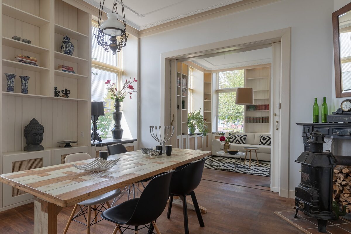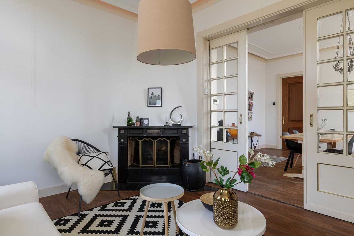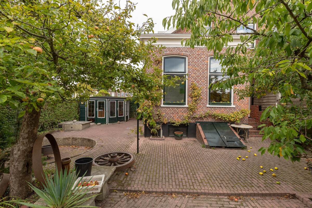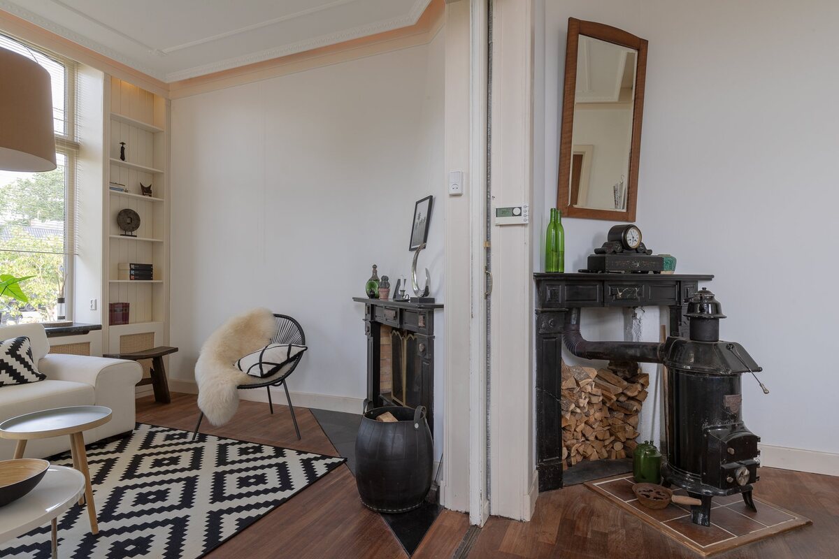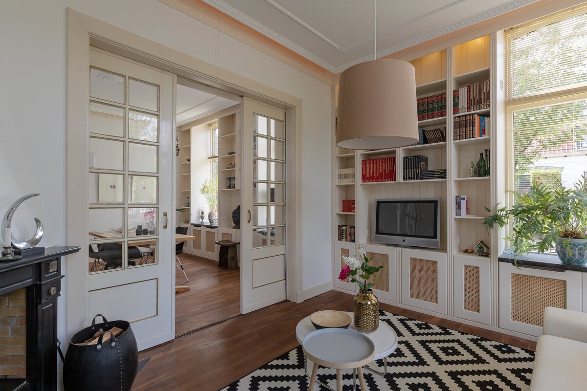 De woning is door de jaren heen netjes onderhouden en teruggebracht in de oude stijl. De woonkamer bevindt zich in het voorste gedeelte van het huis en is voorzien van suitedeuren, een open haard en een houtkachel. De plafond beschikt over fraaie elementen wat uitstekend past bij de stijl van de woning. Aan de achterzijde van de woning is de keuken gesitueerd. Tevens beschikt de begane grond nog over een slaapkamer/werkkamer van ca. 12m², een toilet en een toegang tot de één van de kelders met o.a. een aansluiting voor de wasmachine en droger en een keukentje met water.