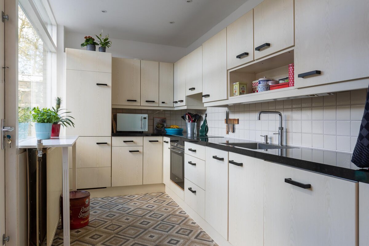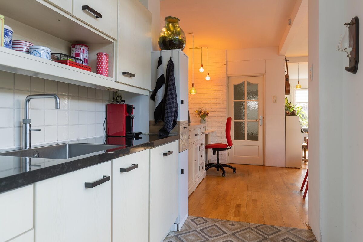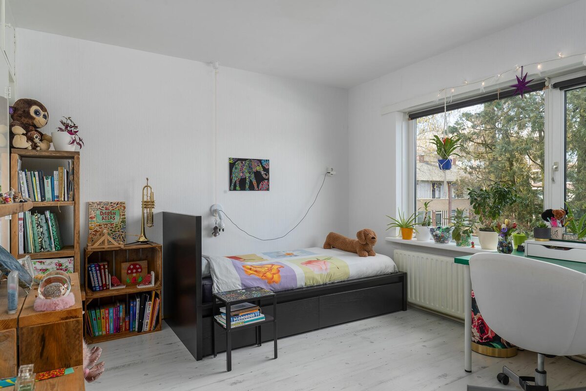 Entree in tochtportaal (met vernieuwde meterkast). Hal met vaste trapkast, modern toilet en een groot raam naar de woonkamer.Ruime en lichte L-vormige doorzonwoonkamer (ca. 36 m2) v.v. parket vloer en een zijgevelraam. Uitzicht in de tegenoverliggende straat.Semi-open keuken in de uitbouw (ca. 8 m2), in hoekopstelling voorzien van inbouw apparatuur en een loopdeur naar de tuin.Verdieping: overloop met toegang tot alle vertrekken.Twee slaapkamers aan de achterzijde van ca. 12 (vaste kast) en 5 m2 (hoogslaper).Slaapkamer voorzijde ca. 13m² met vaste kast.Prachtige hoofdbadkamer aan de voorzijde (2021, ca. 5 m2) met ligbad, douche, hangend toilet, elektrische vloerverwarming en wastafelmeubel.Kleine badkamer (2020, ca. 3 m2) met vaste wastafel, inloopdouche, elektrische vloerverwarming en wasmachineaansluiting.Zolderverdieping: ruime open zolderslaapkamer (ca. 17 m2) met dakramen en diverse bergmogelijkheden. Kast met CV ketel (HR combi, ouder exemplaar).