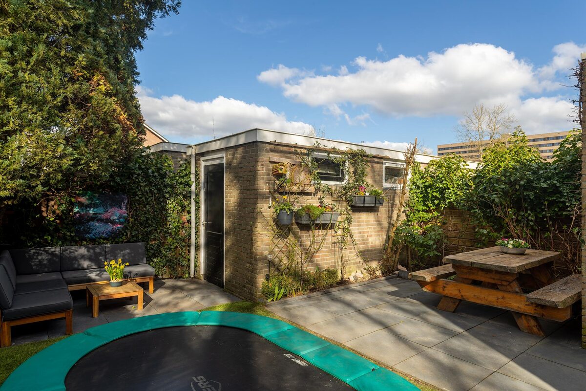 Gezellige en zonnige achtertuin (ca. 10 meter diep) met grote vrijstaande berging (ca. 4,2 bij 2,4 m.) welke veel privacy biedt. Zijtuin met overkapping (ruime open fietsenschuur) en achterom. Verrassende voortuin die een groot deel van het jaar in bloei staat.