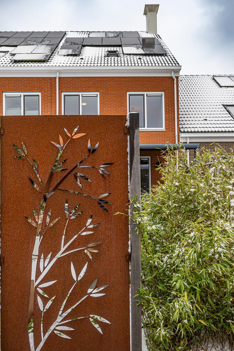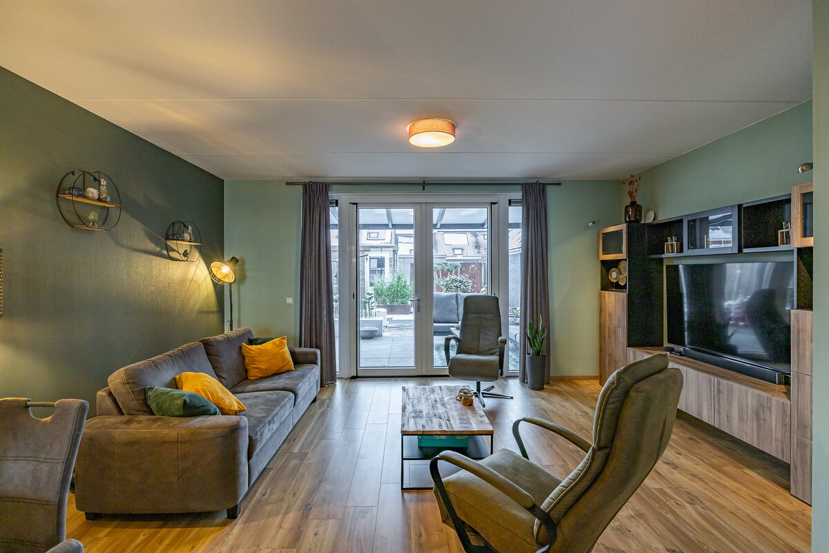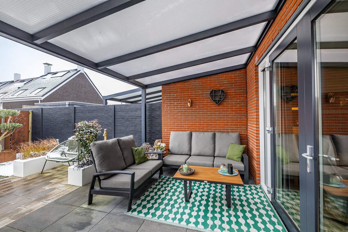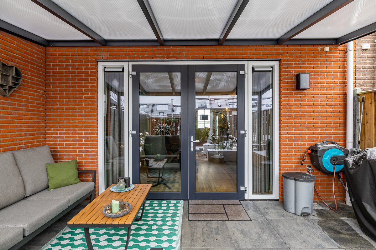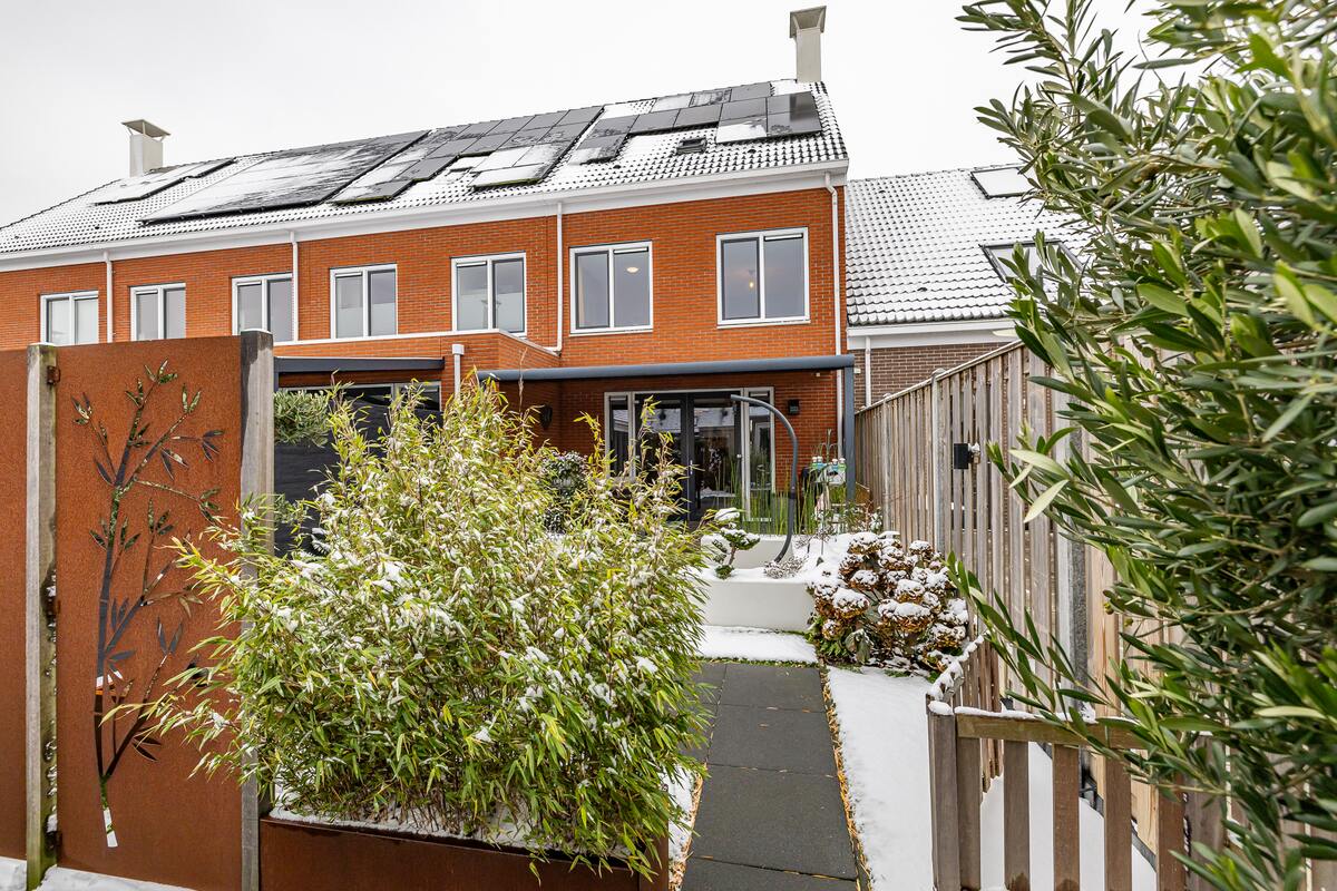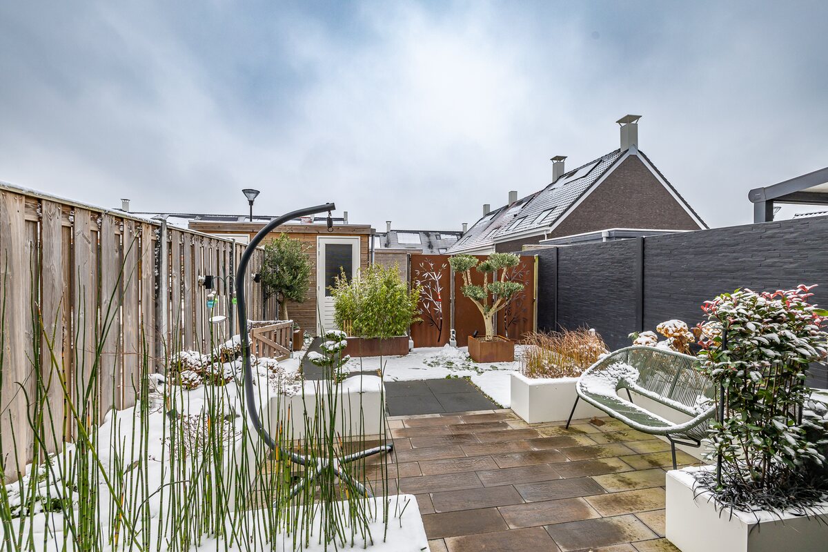Zonovergoten achtertuin (ca. 5,2 bij 9 m. Op oost) met gezellige veranda direct aan de gevel, terrassen, mooie bloembakken en borders en een vrijstaande houten berging (ca. 7,5 m2). Achter de tuin ligt de (eigen) parkeerplaats.