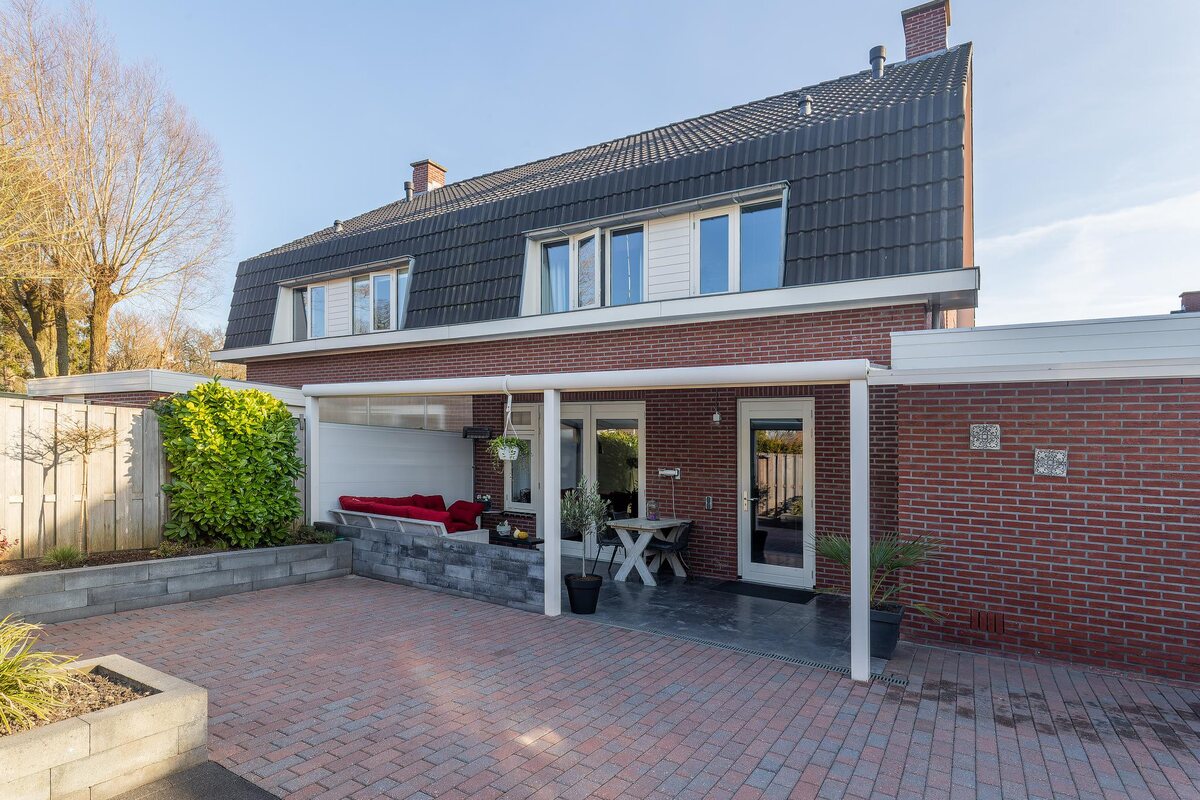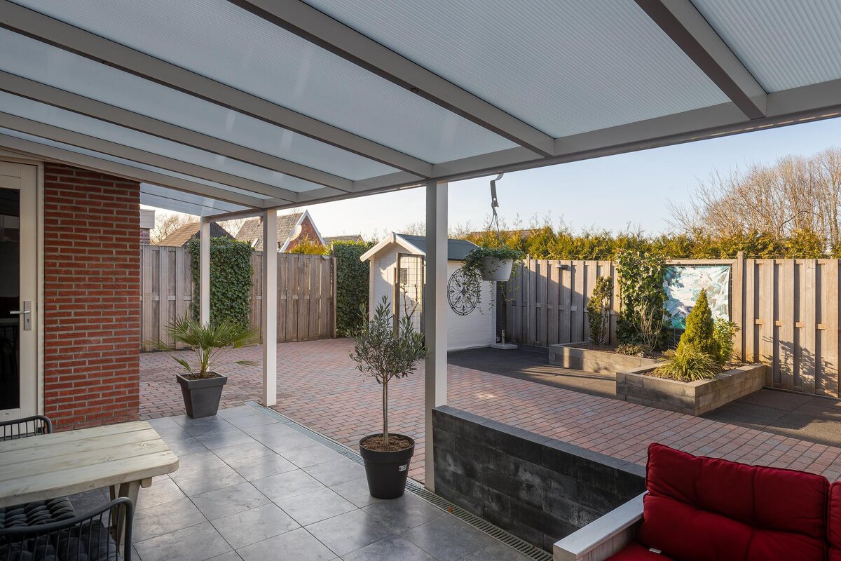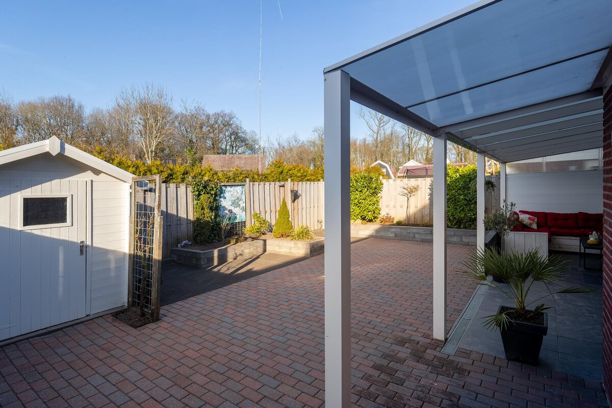 Tuin: de achtertuin is gelegen op het noordwesten en biedt veel privacy. Over de gehele breedte van de woning is een overkapping geplaatst. Zodoende kan men ook bij minder goed weer nog buiten zitten. Achterin de tuin staat nog een kleine houten berging van ca. 3 m² groot. De tuin is via een zijpad te bereiken.