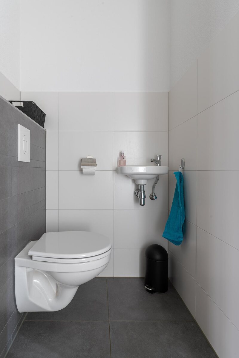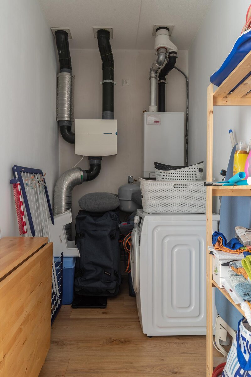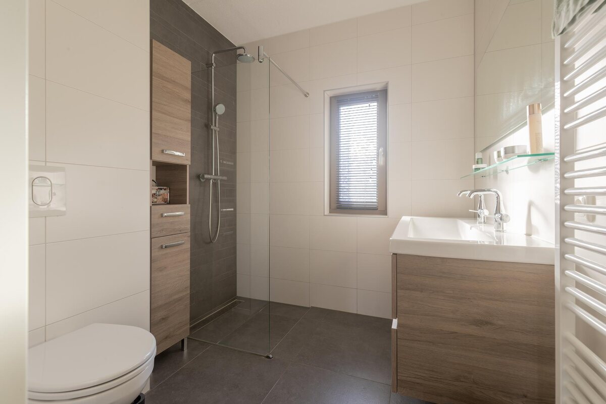 Verdieping: ruime overloop (ca. 9 m2).Drie slaapkamers van 9, 11 en 16 m2, allen voorzien van laminaatvloer. De badkamer (5 m2) is modern en voorzien van inloopdouche, tweede toilet en wastafelmeubel.Ruime berging met wasmachine aansluiting en Cv ketel (HR combi 2017, eigendom).