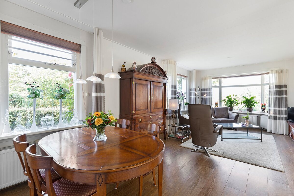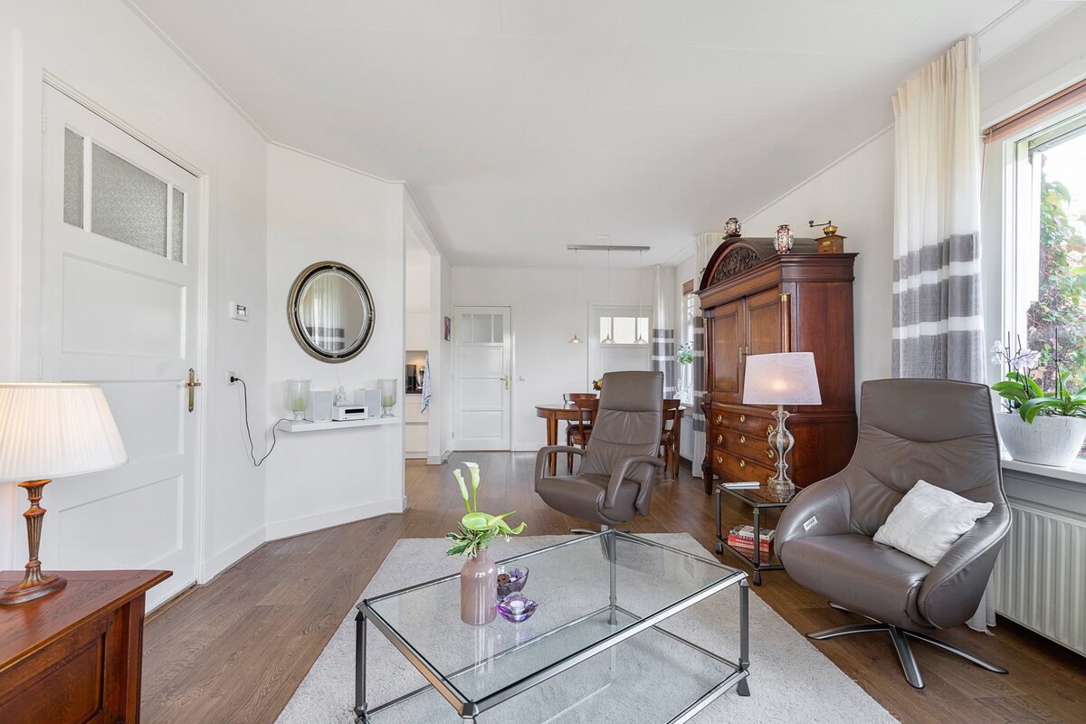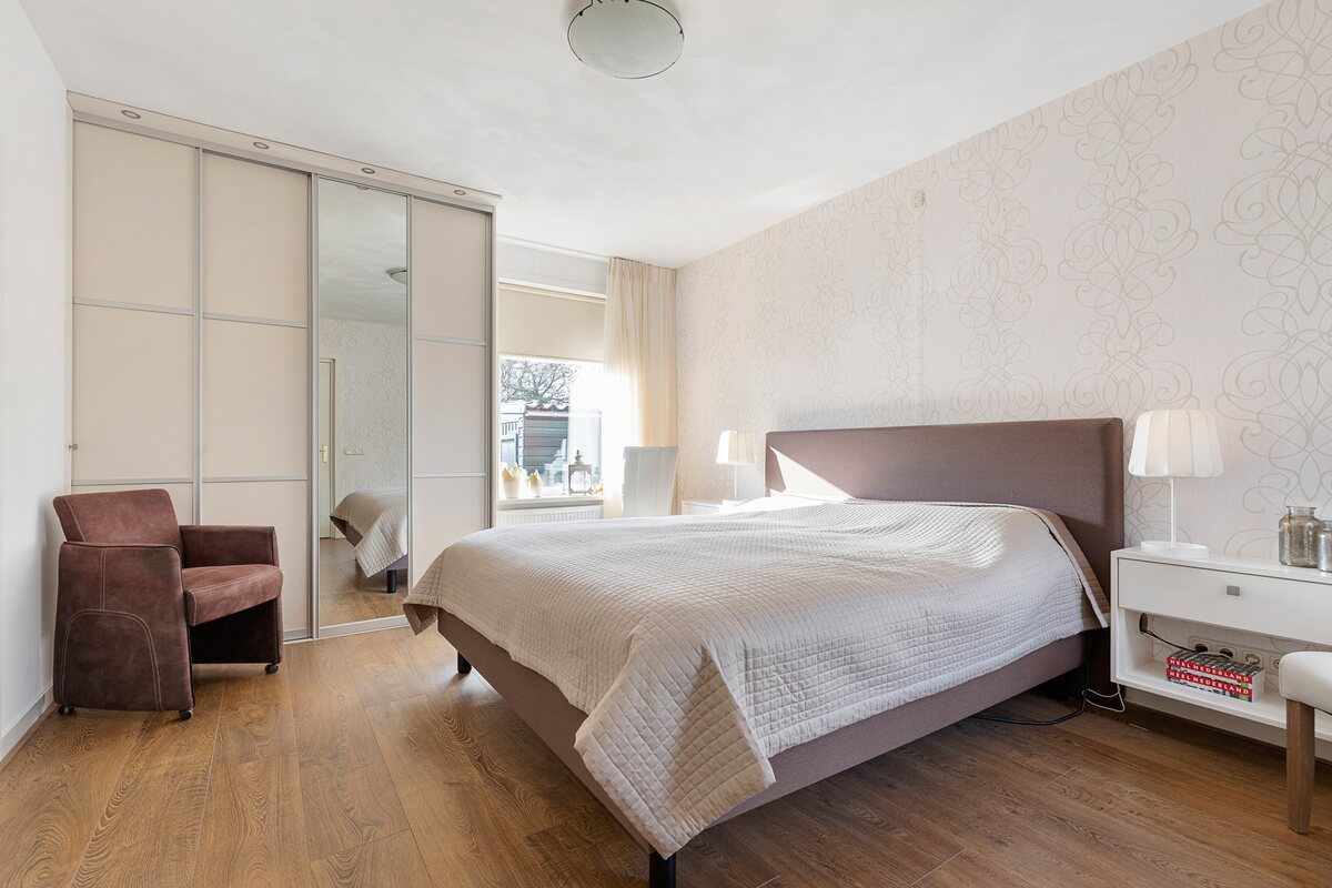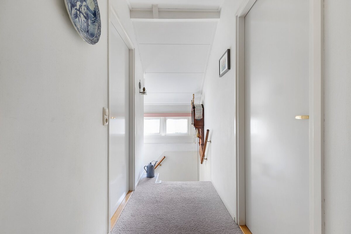 Hal/entree met trap naar de verdieping en toegang tot de woonkamer.Gezellige woonkamer met open keuken (tezamen L-vormig en 41 m2) voorzien van mooi laminaat en met fraai uitzicht op het voor- en naastgelegen groen. De keuken is modern en voorzien van alle gemakken: vaatwasser, gaskookplaat, koelkast, oven-magnetron, apothekerskast en deur naar de kelder. Ruime provisiekelder (droog, geen stahoogte) van ca. 7 m2.Grote bijkeuken (ca. 12 m2) met opstelplaats van de wasmachine, toilet, toegang tot de keuken, badkamer en vliering. Royale slaapkamer (ca. 19 m2) met vaste kastenwand en deur naar de badkamer.Nette moderne badkamer (ca. 5 m2) met tweede toilet, wastafelmeubel en douche.Verdieping: overloop met vaste kast.Slaapkamer 2 voorzijde (ca. 12 m2) met vaste kastenwand.Slaapkamer 3 achterzijde (ca. 12 m2).