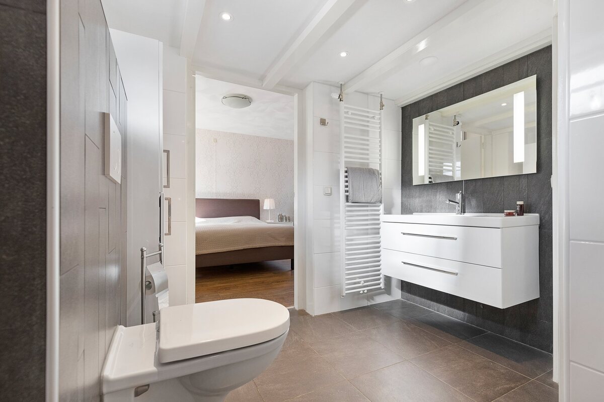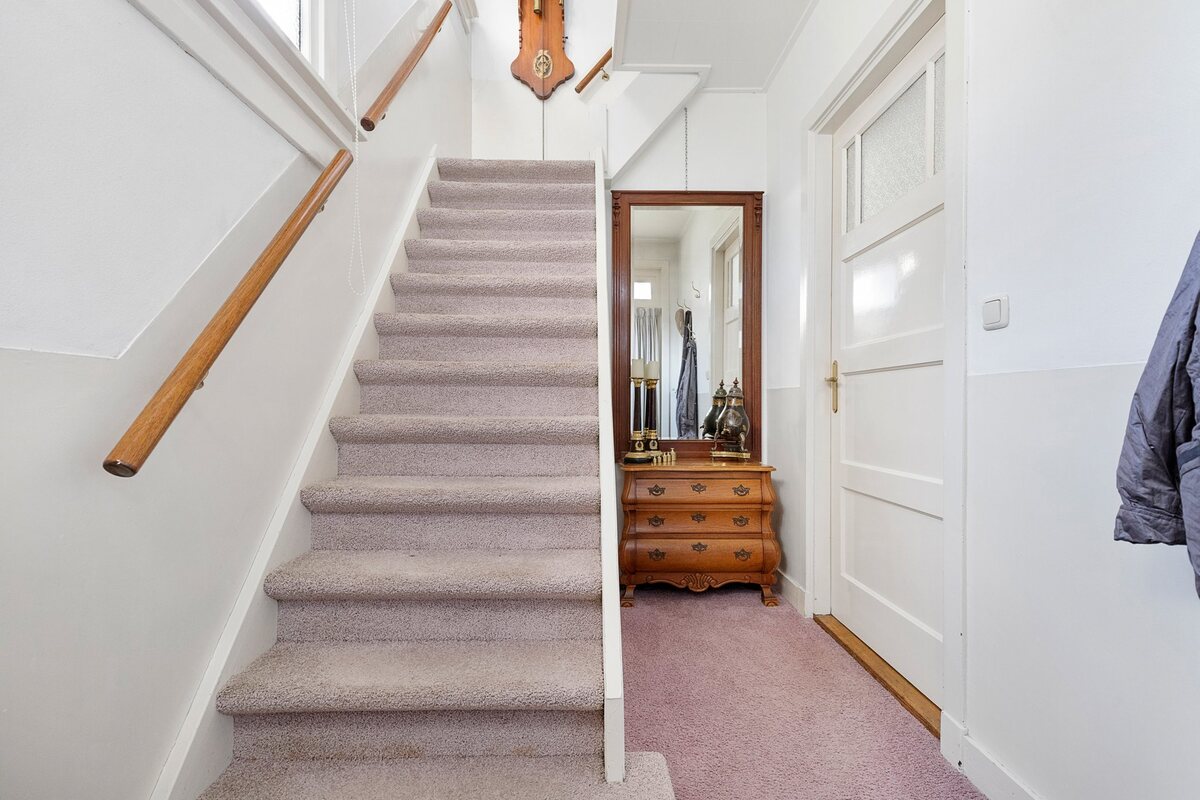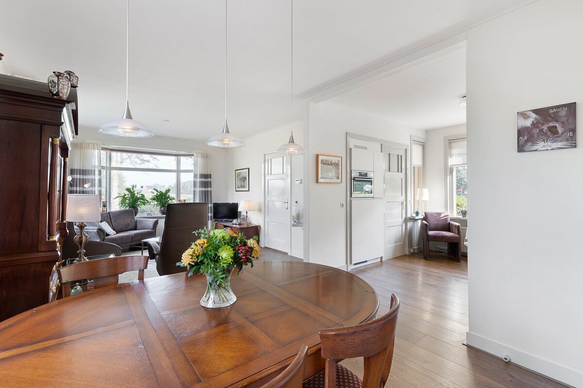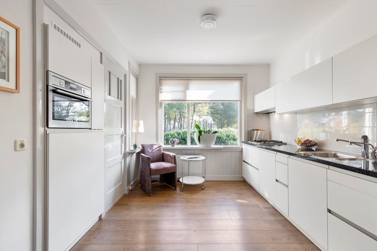 Hal/entree met trap naar de verdieping en toegang tot de woonkamer.Gezellige woonkamer met open keuken (tezamen L-vormig en 41 m2) voorzien van mooi laminaat en met fraai uitzicht op het voor- en naastgelegen groen. De keuken is modern en voorzien van alle gemakken: vaatwasser, gaskookplaat, koelkast, oven-magnetron, apothekerskast en deur naar de kelder. Ruime provisiekelder (droog, geen stahoogte) van ca. 7 m2.Grote bijkeuken (ca. 12 m2) met opstelplaats van de wasmachine, toilet, toegang tot de keuken, badkamer en vliering. Royale slaapkamer (ca. 19 m2) met vaste kastenwand en deur naar de badkamer.Nette moderne badkamer (ca. 5 m2) met tweede toilet, wastafelmeubel en douche.Verdieping: overloop met vaste kast.Slaapkamer 2 voorzijde (ca. 12 m2) met vaste kastenwand.Slaapkamer 3 achterzijde (ca. 12 m2).