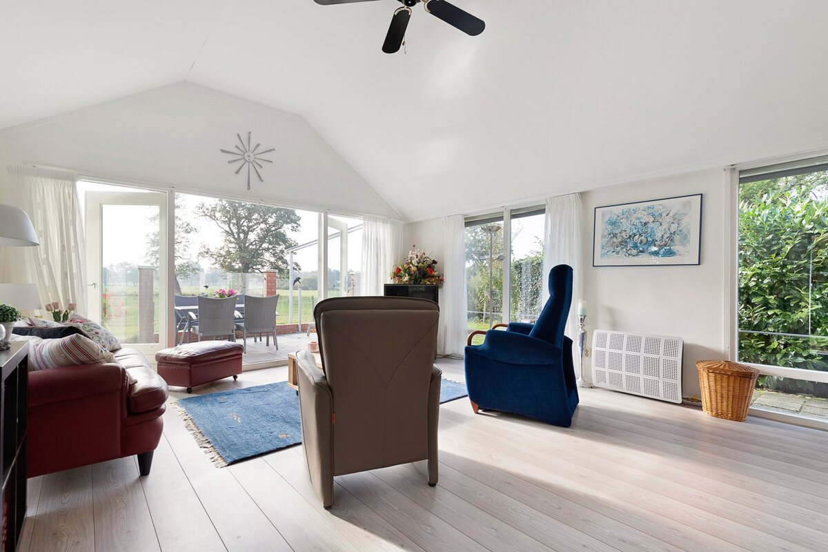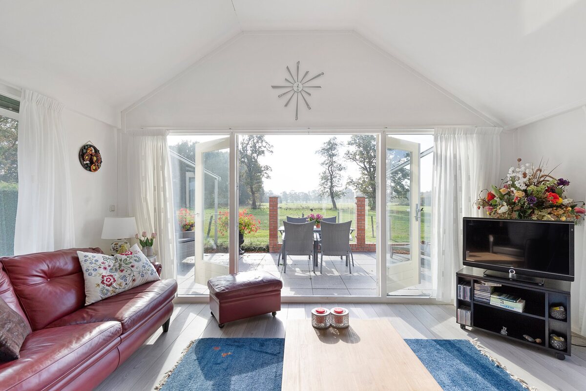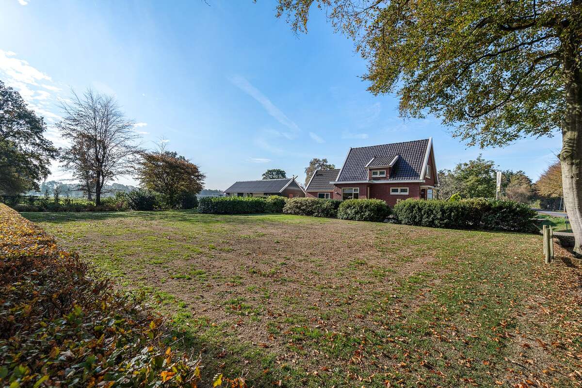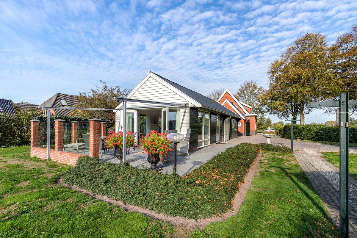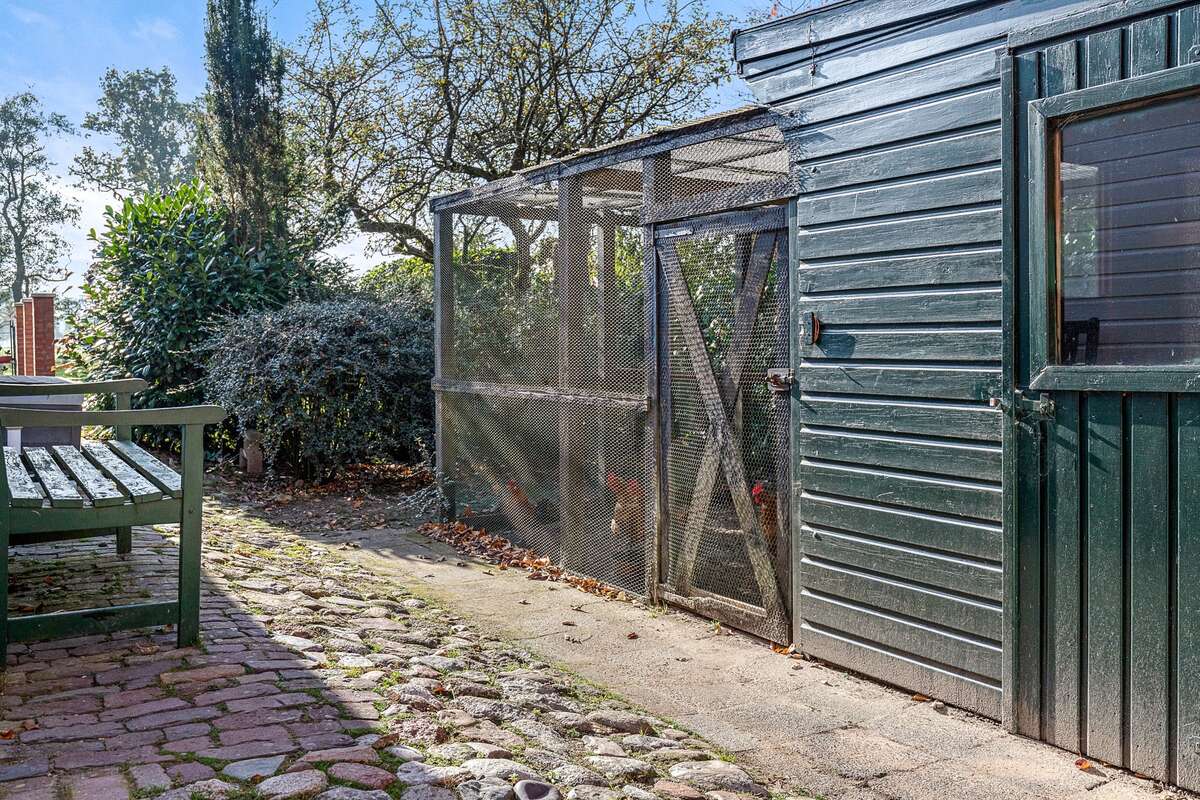 Rondom gelegen tuin met gazon, borders, groententuin, terrassen en kippenhok. Prachtig gelegen aan weilanden en naast een sportveld.