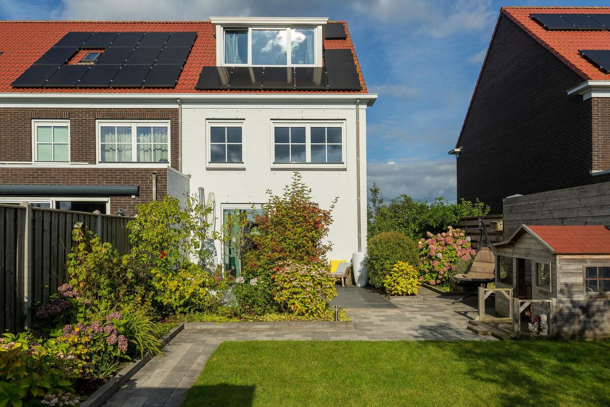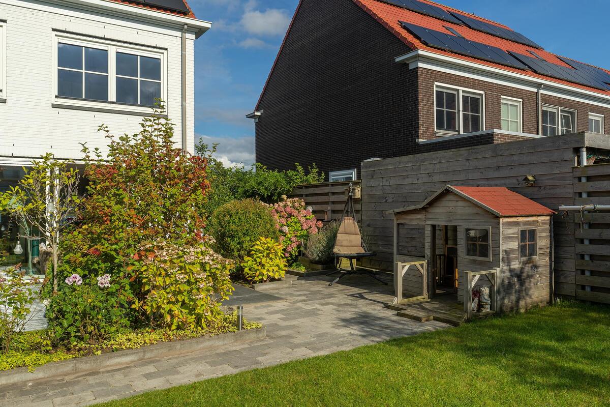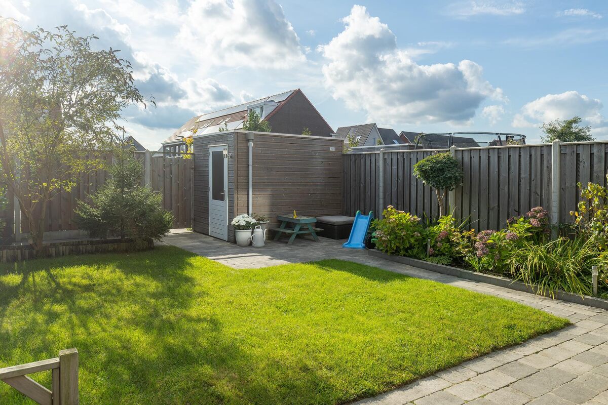 Royale achtertuin (ca. 16 meter diep en 8,5 m. breed, ligging zuidwest) voorzien van gazon, een heerlijk zonovergoten terras, borders en een vrijstaande houten berging (ca. 7 m2).