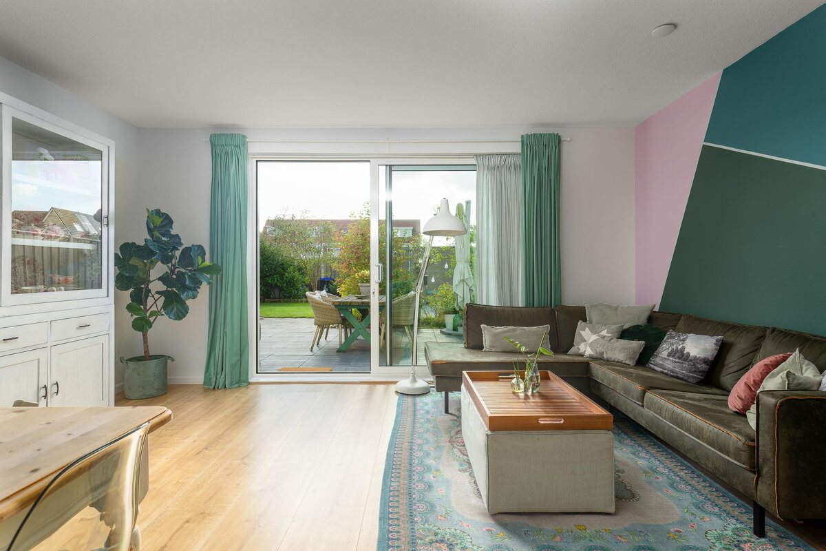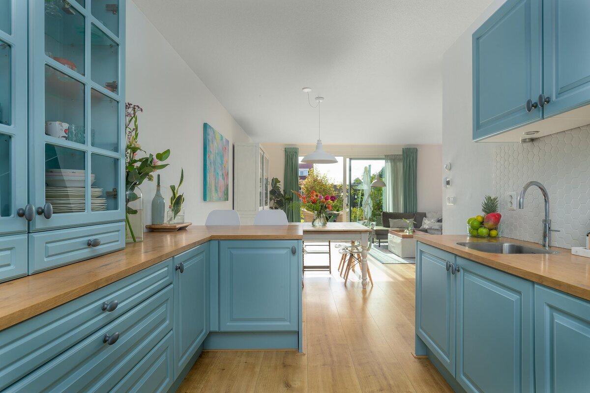 Tuingerichte woonkamer (ca. 25 m2) met open keuken (ca. 11 m2), voorzien van vloerverwarming (en koeling), een fraaie laminaatvloer en schuifpui naar de tuin.De keuken (landelijke stijl) is voorzien van een bar en uiteraard alle gemakken: Quooker, vaatwasser, koel-vriescombi, inductie kookplaat met afzuigkap en een grote oven.