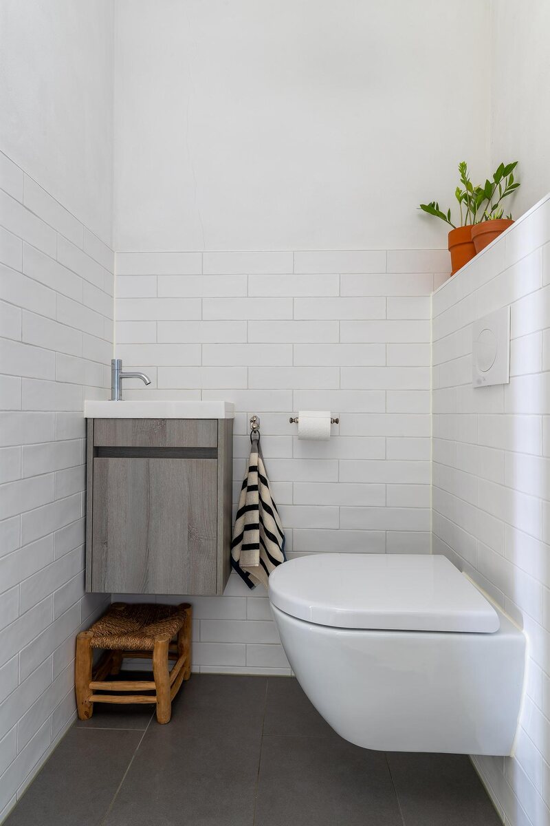 Hal/entree met modern toilet, meterkast en opgang naar de verdieping.