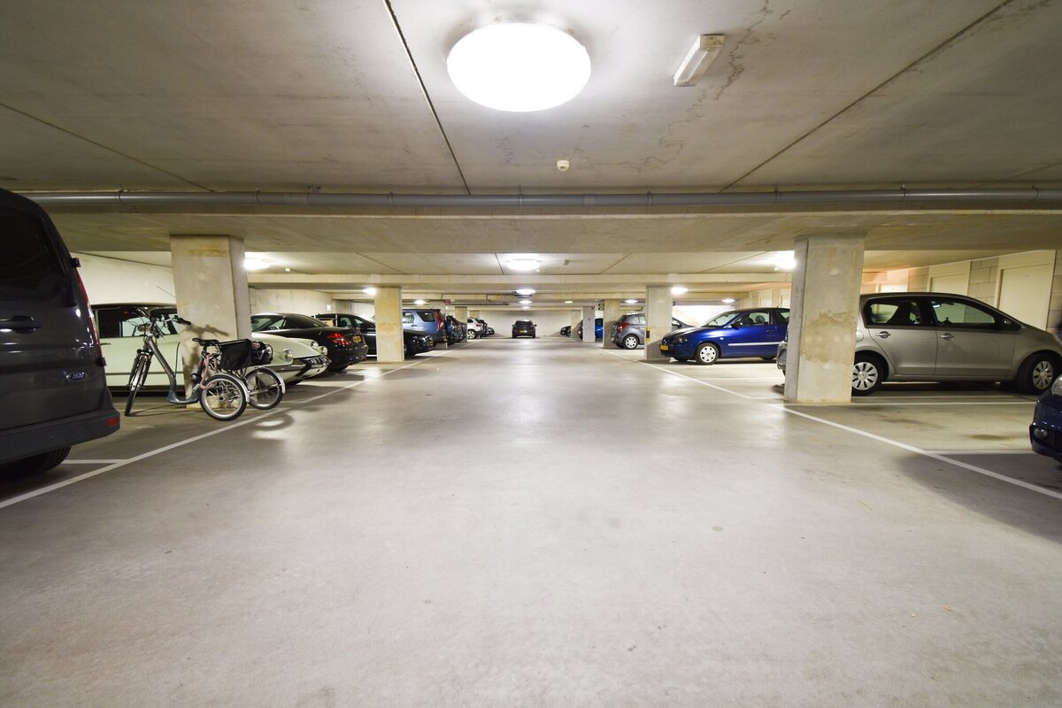 Onder het appartementencomplex ligt de parkeergarage, waar je je eigen vaste parkeerplek hebt. Elke eigenaar heeft ook een afgesloten ruime (fietsen)berging onder het complex.