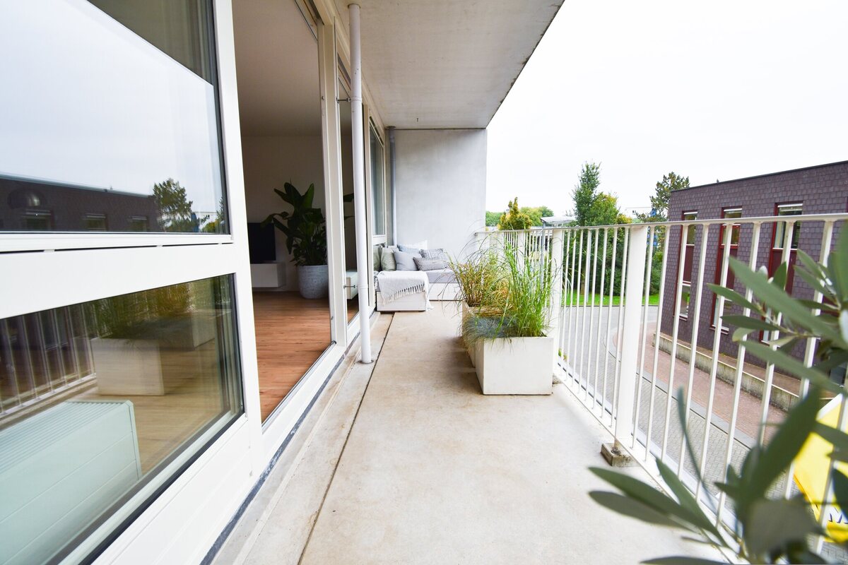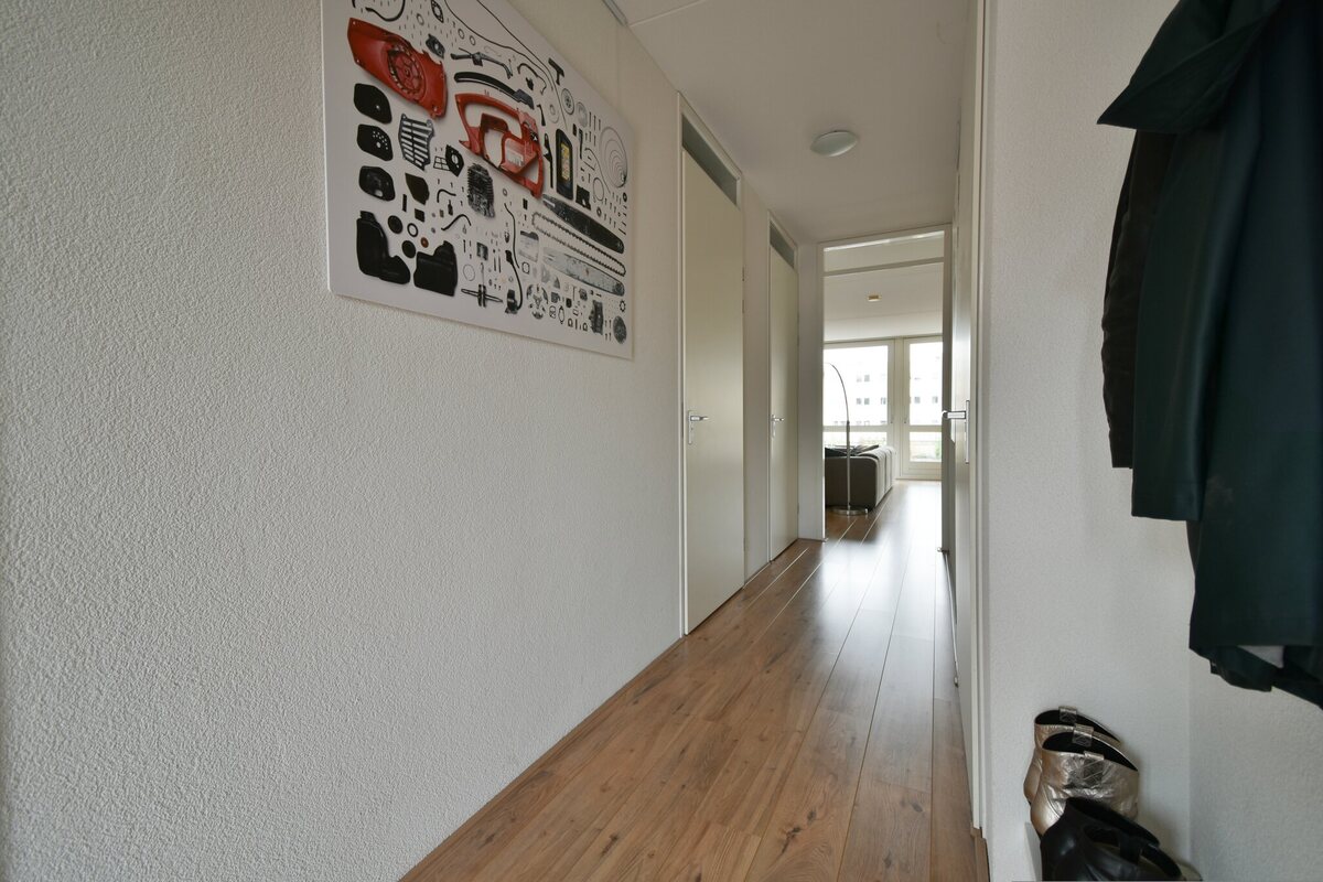 Begane grond: via de centrale hal beneden kan je met de lift of met de trap naar de eerste verdieping.Appartement: via de daktuin aan de voorzijde (ca. 40 m2) treed je het appartement binnen. Aan de rechter- en de linkerkant van de gang de 2 slaapkamers (13 en 10 m2). De grote met nette kastenwand. Tevens vanuit de gang een handige berging en een badkamer (douche, ligbad en wastafel). Het einde van de gang mondt uit in de royale en bijzonder lichte woonkamer (52 m2) met half open keuken (v.v. inbouwapparatuur). Via een grote schuifpui is het fijne balkon van 12 m2 te bereiken.