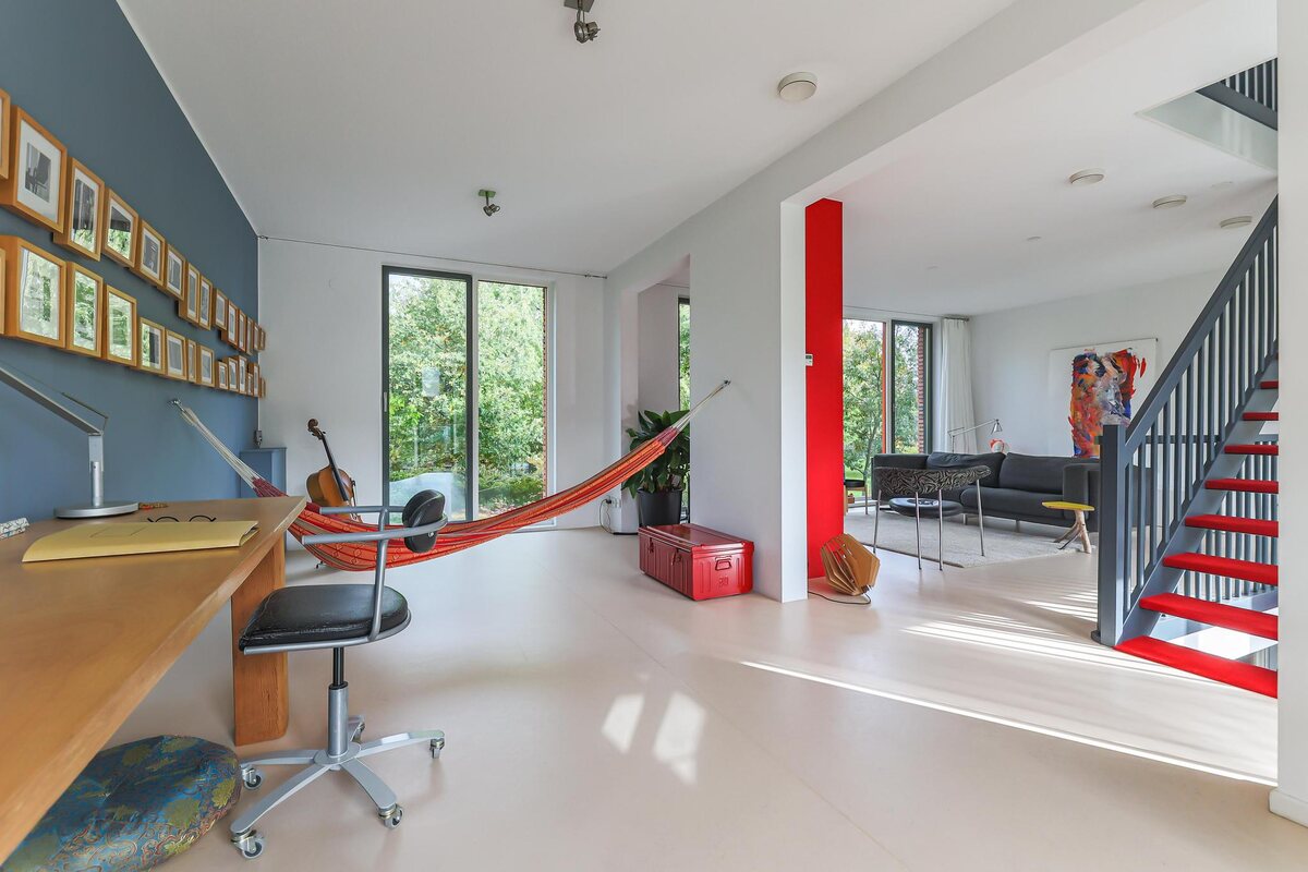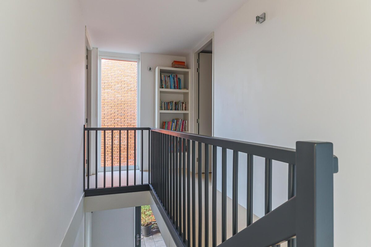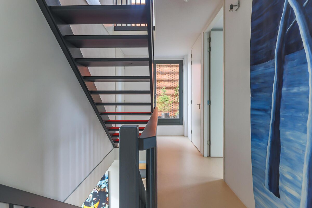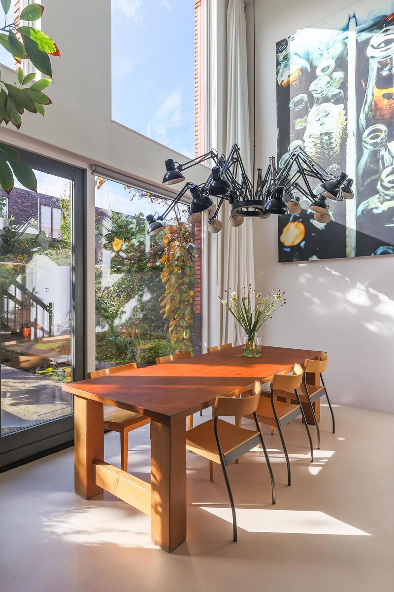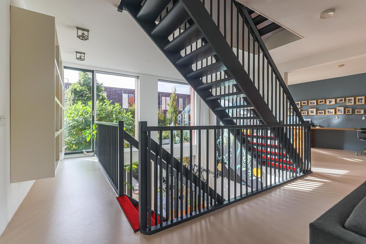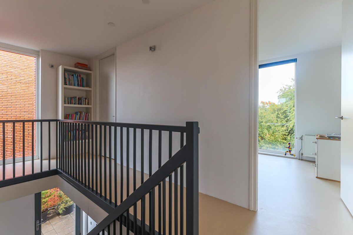 De architectuur van dit huis is bijzonder. De woning beschikt over een basisplattegrond van 9 bij 9 meter waardoor een zeer royaal woonhuis is gerealiseerd. De eerste twee woonlagen zijn met elkaar verbonden door een grote vide met een centraal open trappenhuis (gaaf!). Daarnaast kenmerkt de woning zich door veel en grote raampartijen. Door deze elementen is een groot woon/werk/leefhuis ontstaan met een speelse en verrassende indeling, een zeer ruimtelijke indruk en veel en prettig lichtinval.