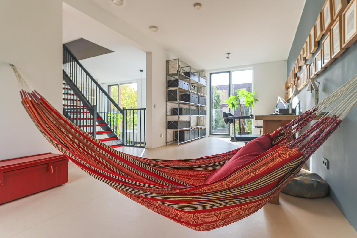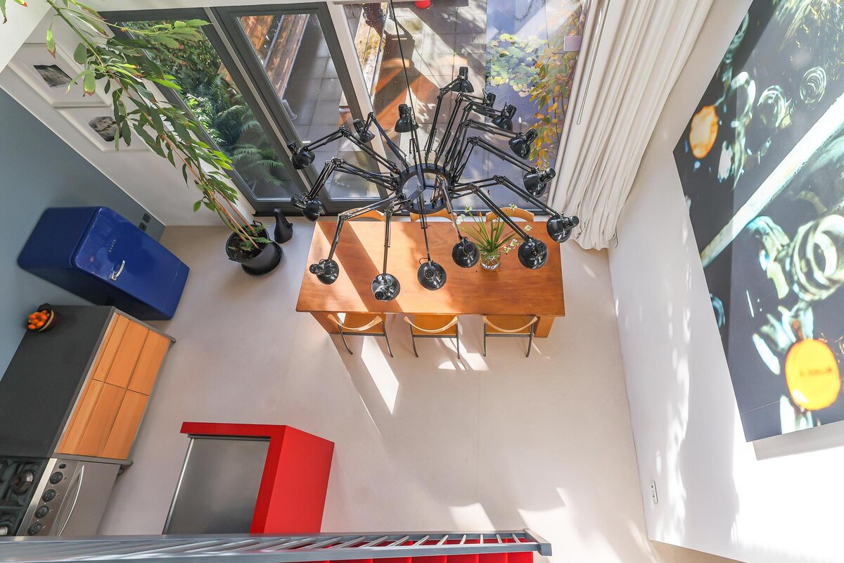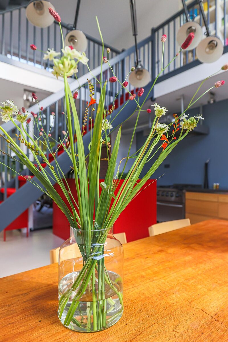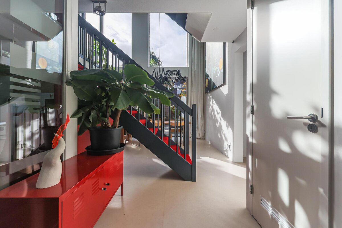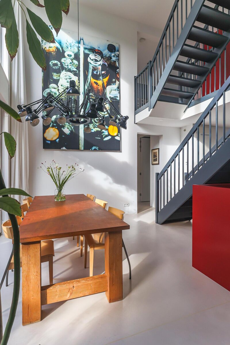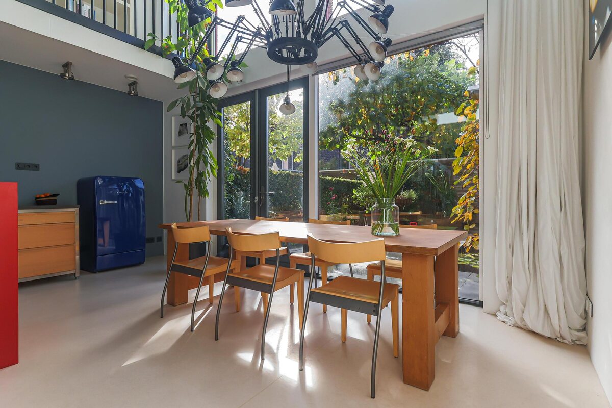 De architectuur van dit huis is bijzonder. De woning beschikt over een basisplattegrond van 9 bij 9 meter waardoor een zeer royaal woonhuis is gerealiseerd. De eerste twee woonlagen zijn met elkaar verbonden door een grote vide met een centraal open trappenhuis (gaaf!). Daarnaast kenmerkt de woning zich door veel en grote raampartijen. Door deze elementen is een groot woon/werk/leefhuis ontstaan met een speelse en verrassende indeling, een zeer ruimtelijke indruk en veel en prettig lichtinval.
