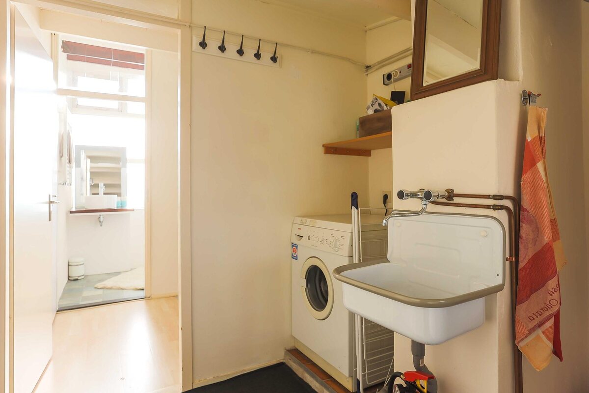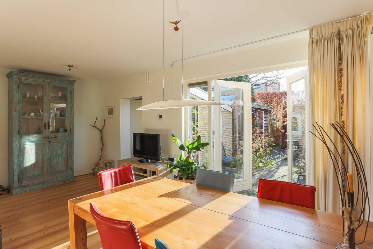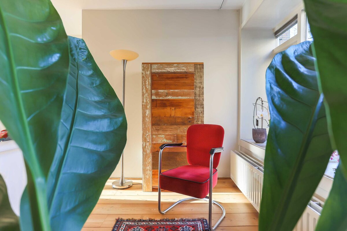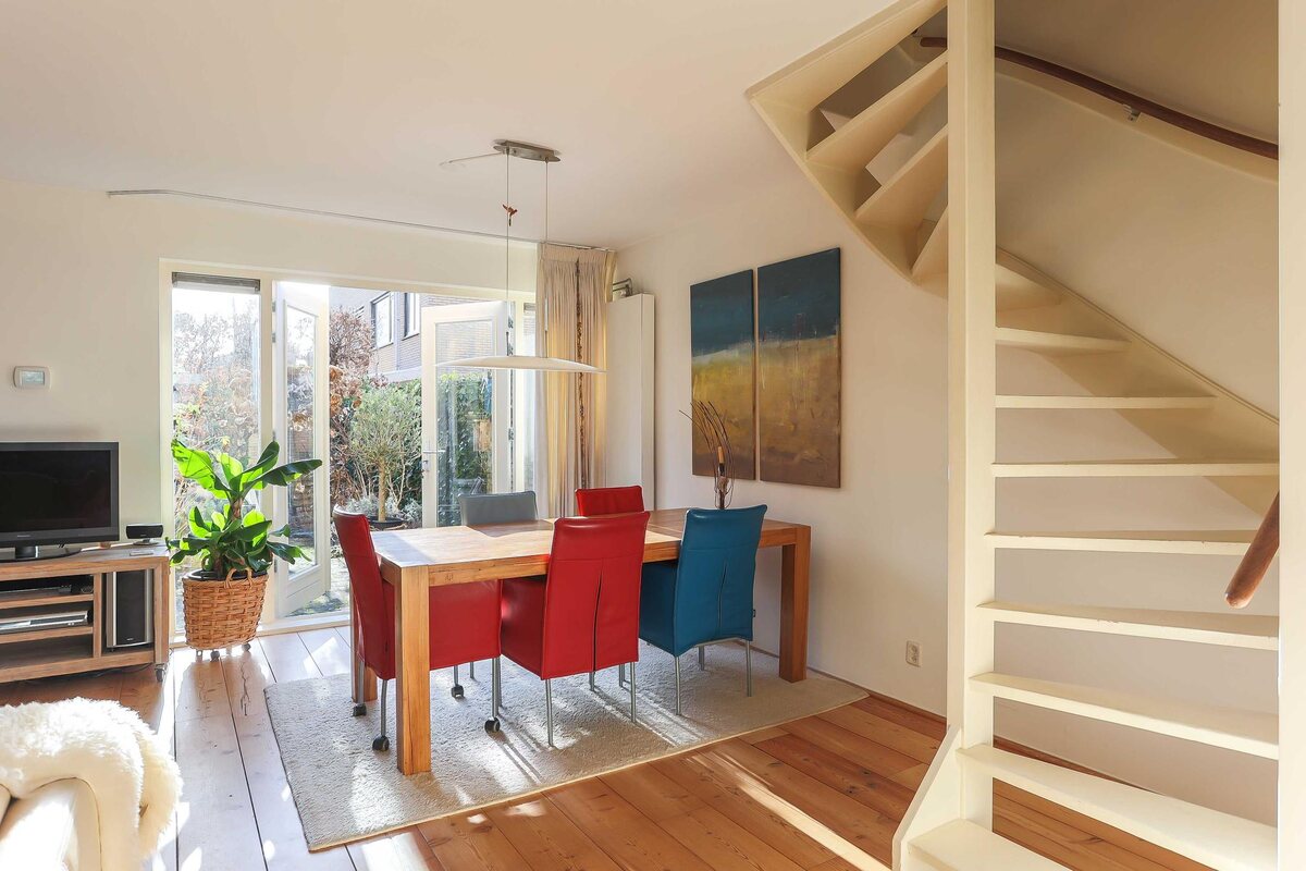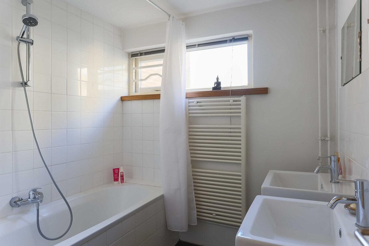 INDELING Begane grond: entree/hal, toilet met fontein, meterkast, lichte en ruimtelijke woonkamer (42m2) met fraaie houten plankenvloer en prachtige houtkachel, dichte keuken (8 m2) met keukenblok in hoekopstelling voorzien van inbouwapparatuur en deur naar de zonnige achtertuin met achterom. Eerste verdieping: overloop, separaat hangend toilet en 2 flinke slaapkamers (respectievelijk 21 en 14 m2). De nette, volledig betegelde, badkamer (5 m2) heeft een douche in ligbad en dubbele wastafel. De grootste slaapkamer is ontstaan door een samenvoeging van 2 slaapkamers. Tweede verdieping: overloop, praktische tweede badkamer (3 m2) met douche en wastafel, een slaapkamer (13 m2) met deur naar dakterras (8 m2) en nog een slaapkamer (totaal 16 m2) met aparte wasruimte en opstelplaats cv-ketel.