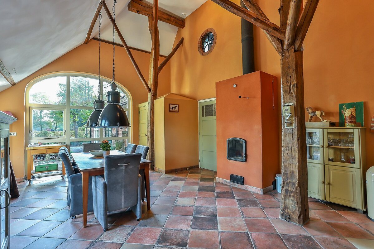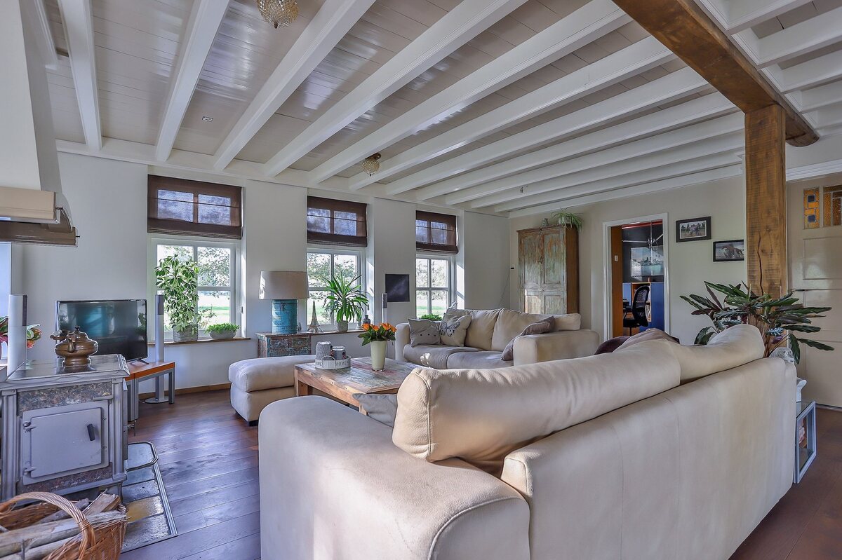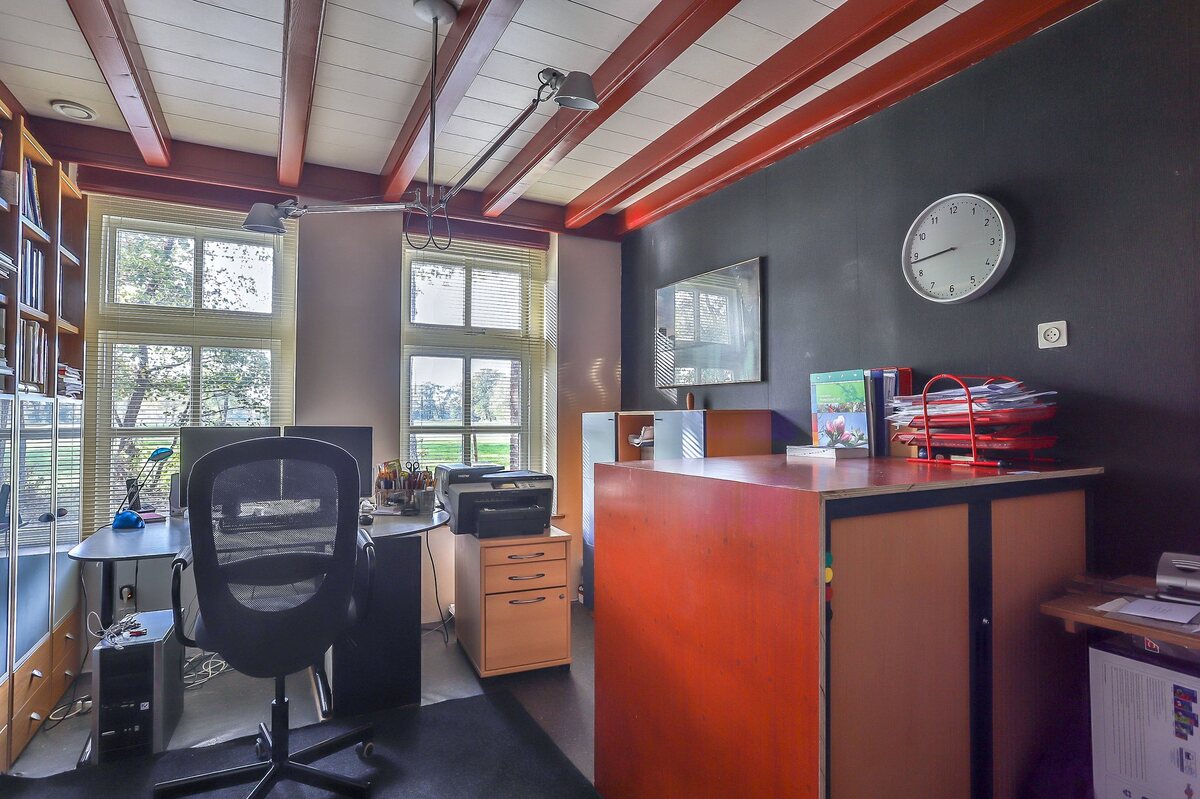 Hal/entree met meterkast en doorloop naar de centrale hal.Prachtige hoge centrale hal (ca. 25 m2) met toegang tot alle vertrekken, toilet en open bordestrap naar de verdieping.Royale en gezellige woonkamer (ca. 45 m2) met balkenplafond, een fraaie schouw met haard, houten vloerdelen, openslaande deuren naar de tuin en een onovertroffen uitzicht op de omliggende landerijen en eigen tuin.Unieke woonkeuken (ca. 39 m2) met fraaie vide, gebinten en een houthaard (Finse oven). De keuken is voorzien van alle gemakken: koelkast, Boretti gasfornuis met oven, vaatwasser, kookschouw en een natuurstenen aanrechtblad. Een grote glazen pui en openslaande deuren welke toegang geven tot de tuin.Slaap/werkkamer 1 (12 m2).Slaap/werkkamer 2 (ca. 22 m2, geen vloerverwarming) met toegang tot de badkamer.Fraaie badkamer (ca. 13 m2) met luxe douche/stoomcabine, toilet, wastafelmeubel en bubbelbad. Ruime kast met opstelplaats voor de wasmachine.Een aparte gang achter de hal geeft toegang tot de deel/schuur.De schuur is ca 130 m2 groot, heeft twee paardenboxen, zolder en grote openslaande deuren naar het achtererf.