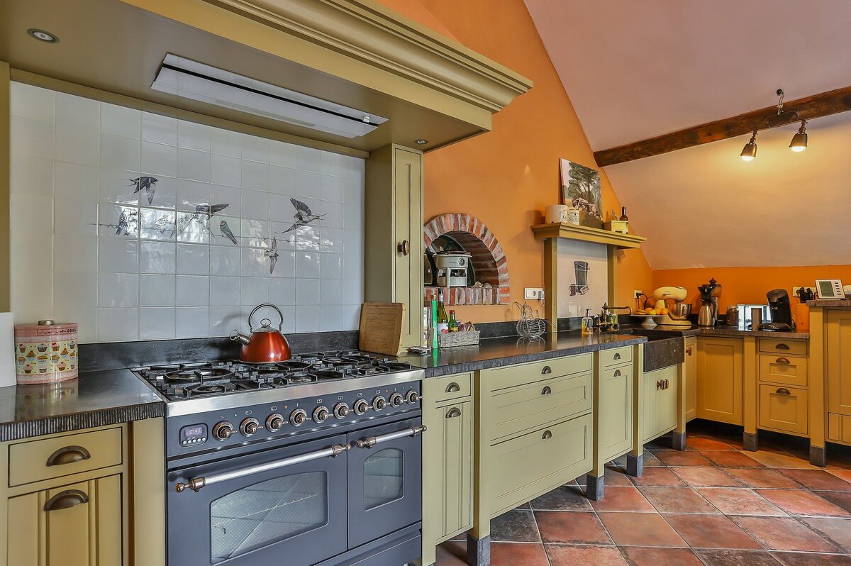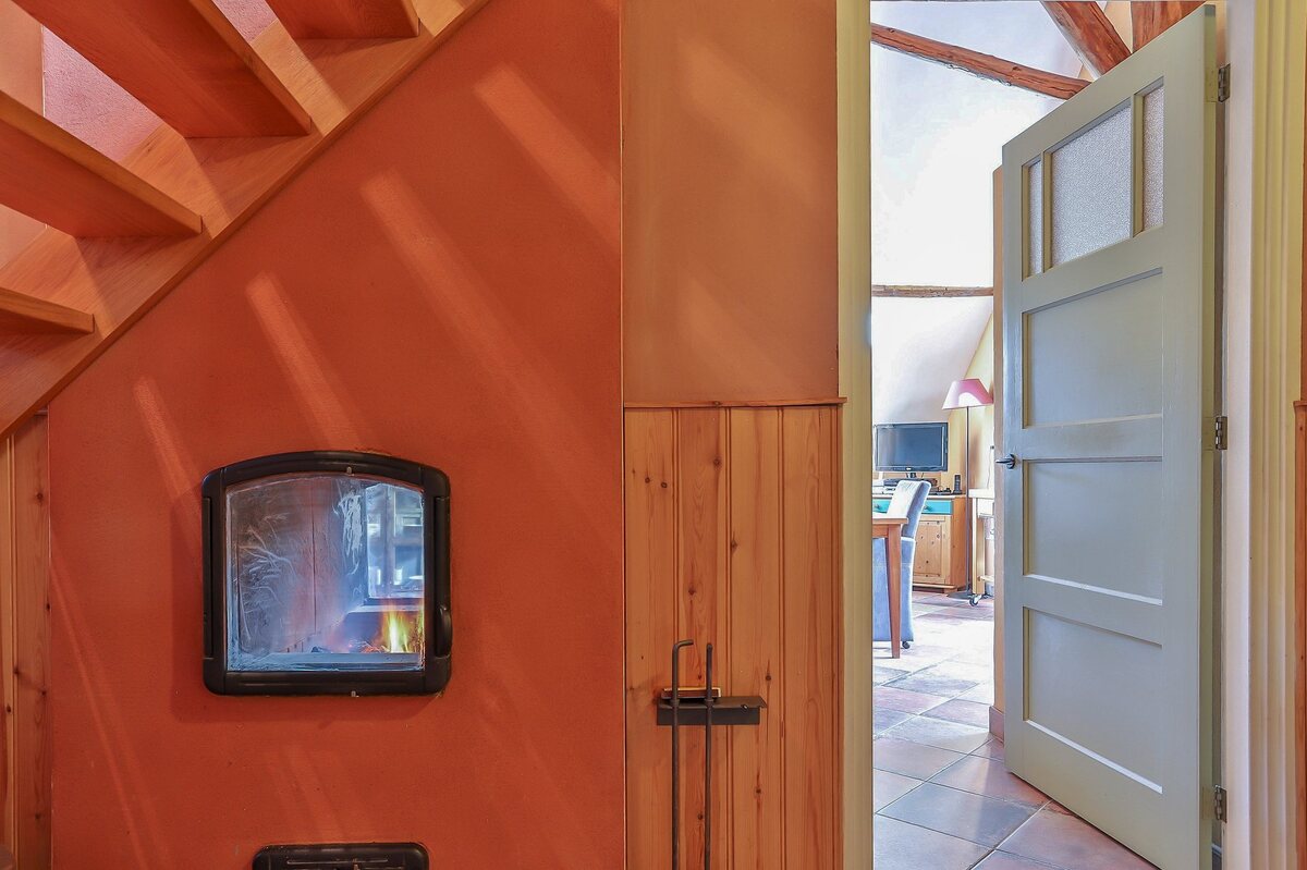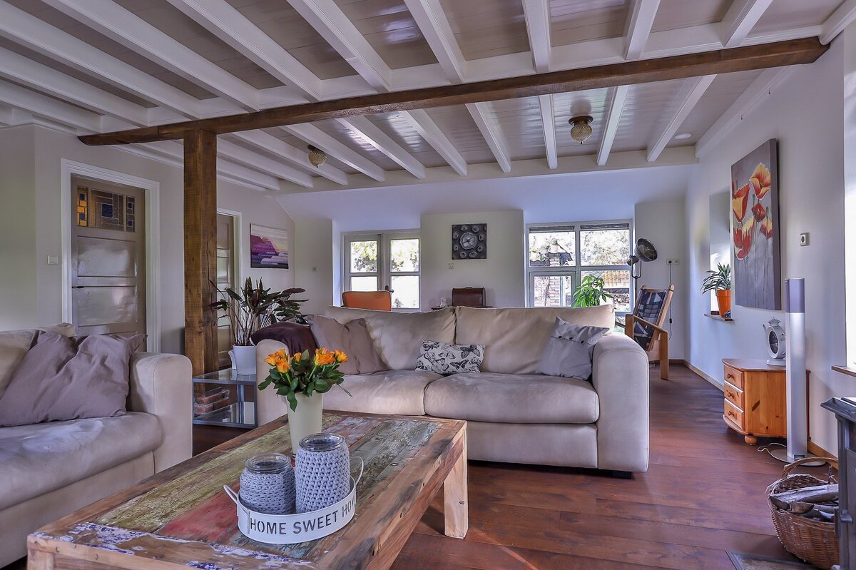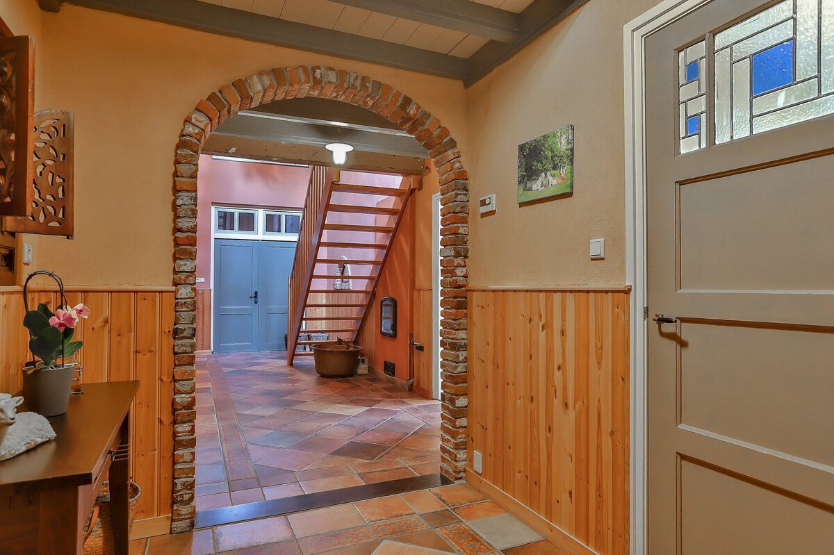 Hal/entree met meterkast en doorloop naar de centrale hal.Prachtige hoge centrale hal (ca. 25 m2) met toegang tot alle vertrekken, toilet en open bordestrap naar de verdieping.Royale en gezellige woonkamer (ca. 45 m2) met balkenplafond, een fraaie schouw met haard, houten vloerdelen, openslaande deuren naar de tuin en een onovertroffen uitzicht op de omliggende landerijen en eigen tuin.Unieke woonkeuken (ca. 39 m2) met fraaie vide, gebinten en een houthaard (Finse oven). De keuken is voorzien van alle gemakken: koelkast, Boretti gasfornuis met oven, vaatwasser, kookschouw en een natuurstenen aanrechtblad. Een grote glazen pui en openslaande deuren welke toegang geven tot de tuin.Slaap/werkkamer 1 (12 m2).Slaap/werkkamer 2 (ca. 22 m2, geen vloerverwarming) met toegang tot de badkamer.Fraaie badkamer (ca. 13 m2) met luxe douche/stoomcabine, toilet, wastafelmeubel en bubbelbad. Ruime kast met opstelplaats voor de wasmachine.Een aparte gang achter de hal geeft toegang tot de deel/schuur.De schuur is ca 130 m2 groot, heeft twee paardenboxen, zolder en grote openslaande deuren naar het achtererf.