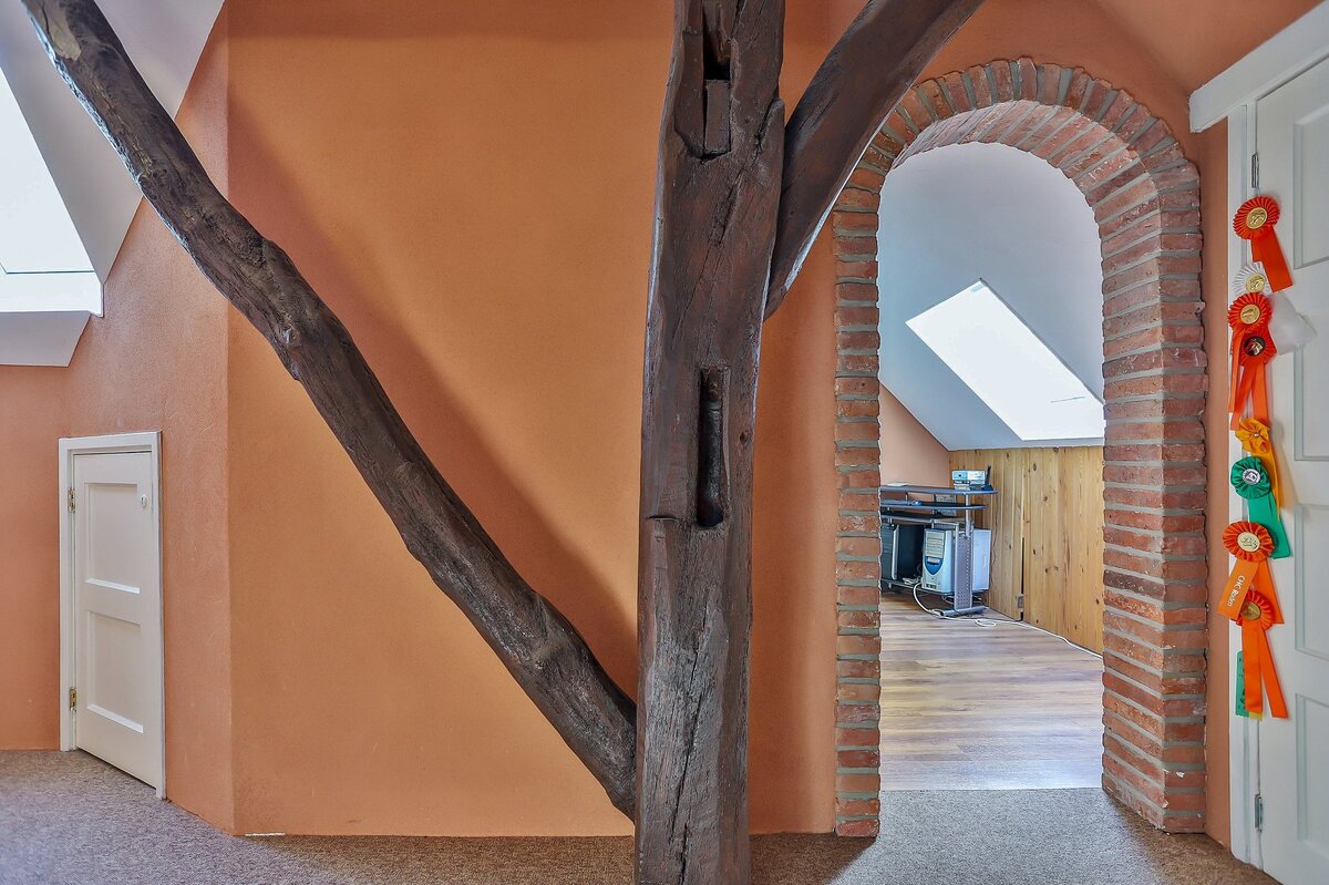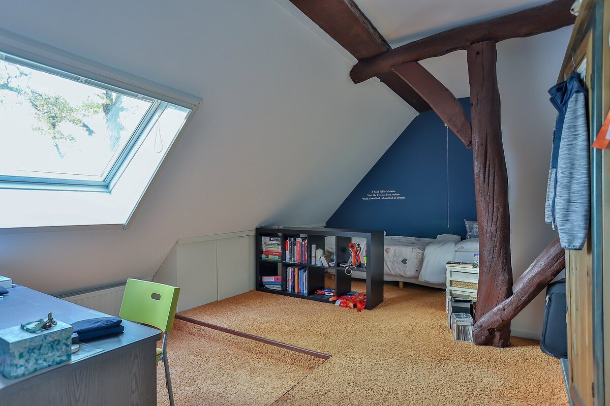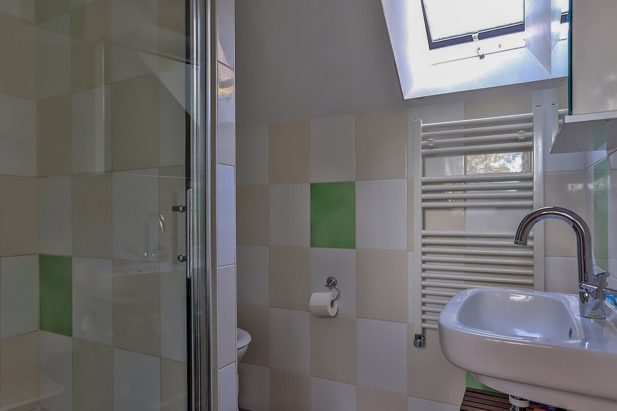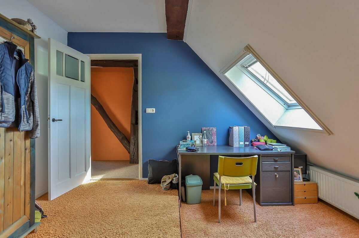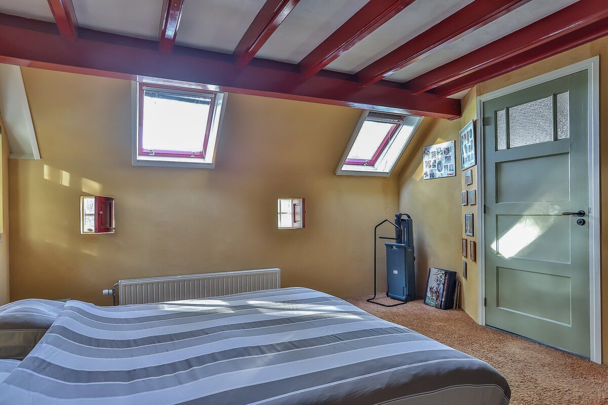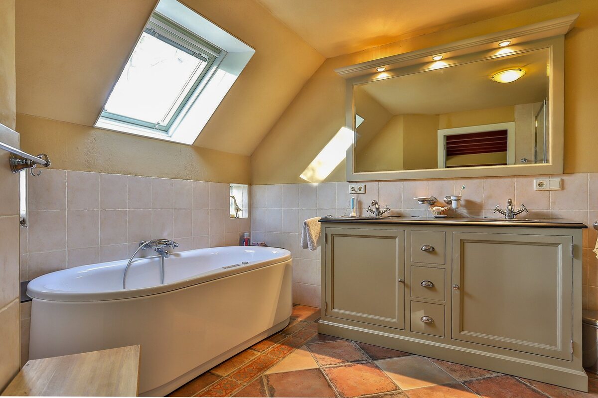 Verdieping: royale overloop met dakramen, inloopkast en toegang tot drie slaapkamers van 18, 13 en 6 m2. Nette badkamer (ca. 4 m2) met douche, vaste wastafel en toilet.
