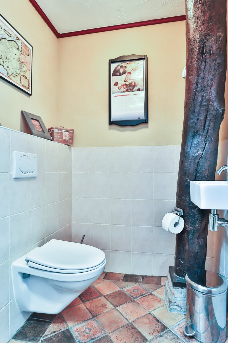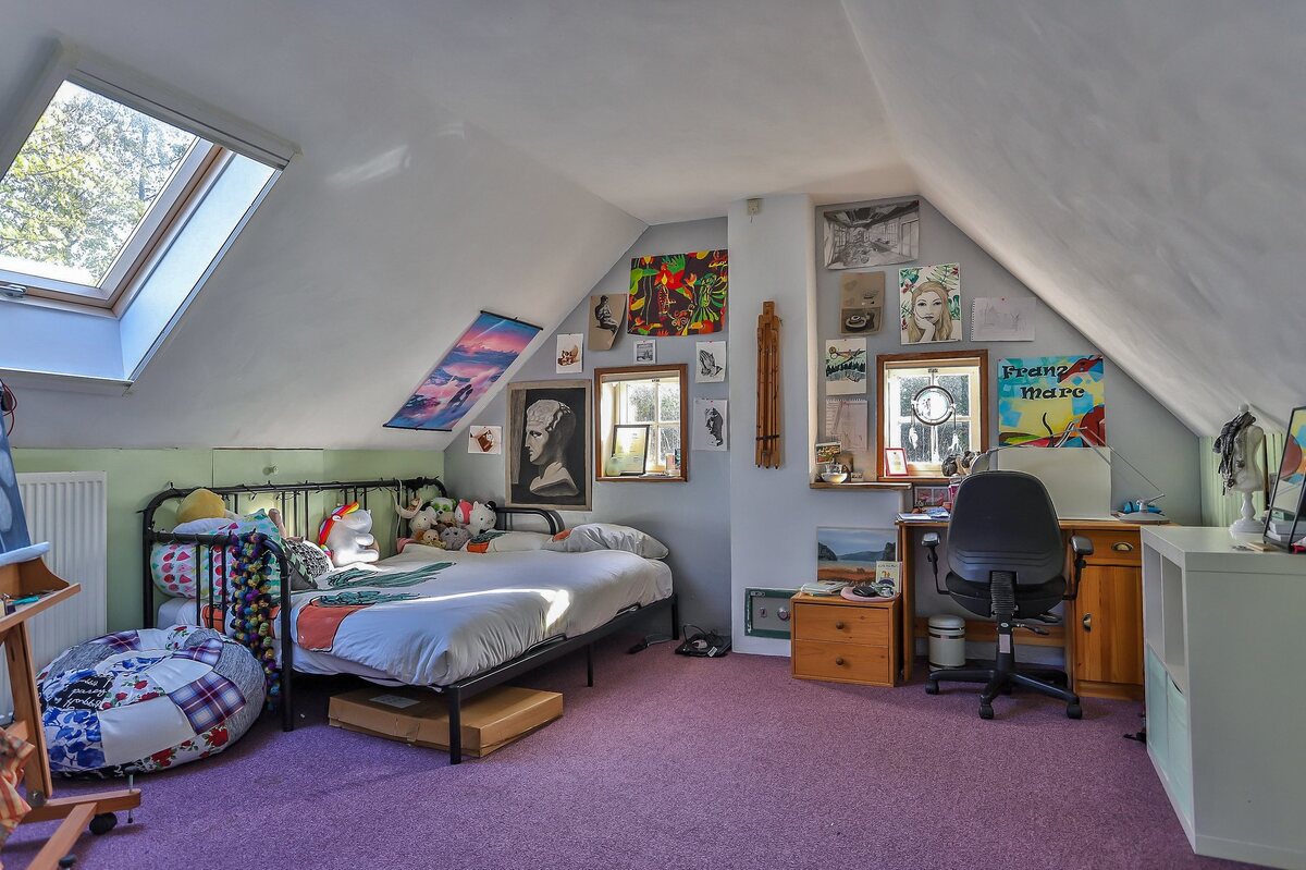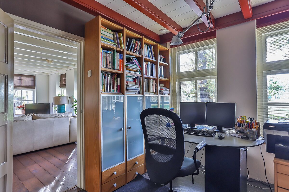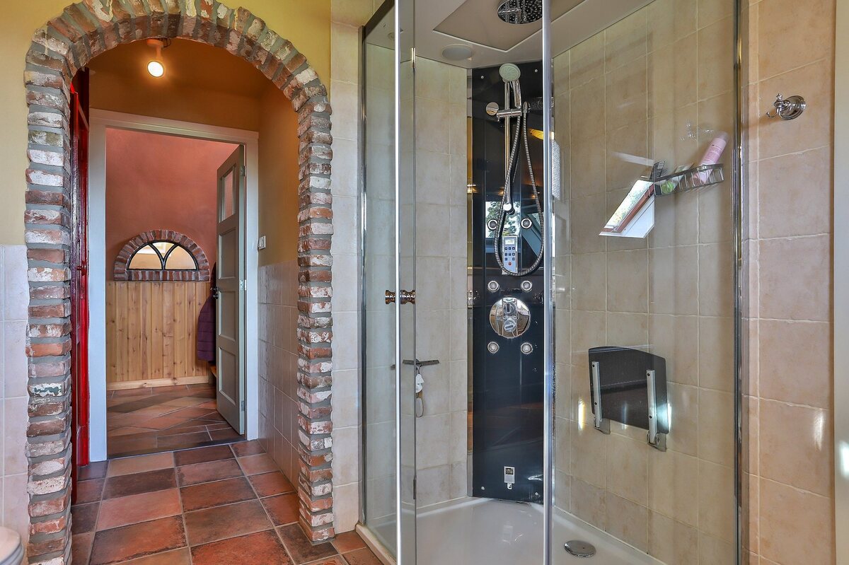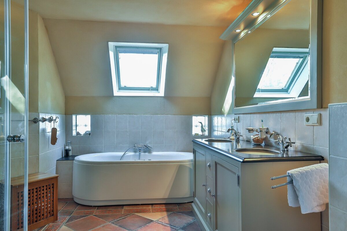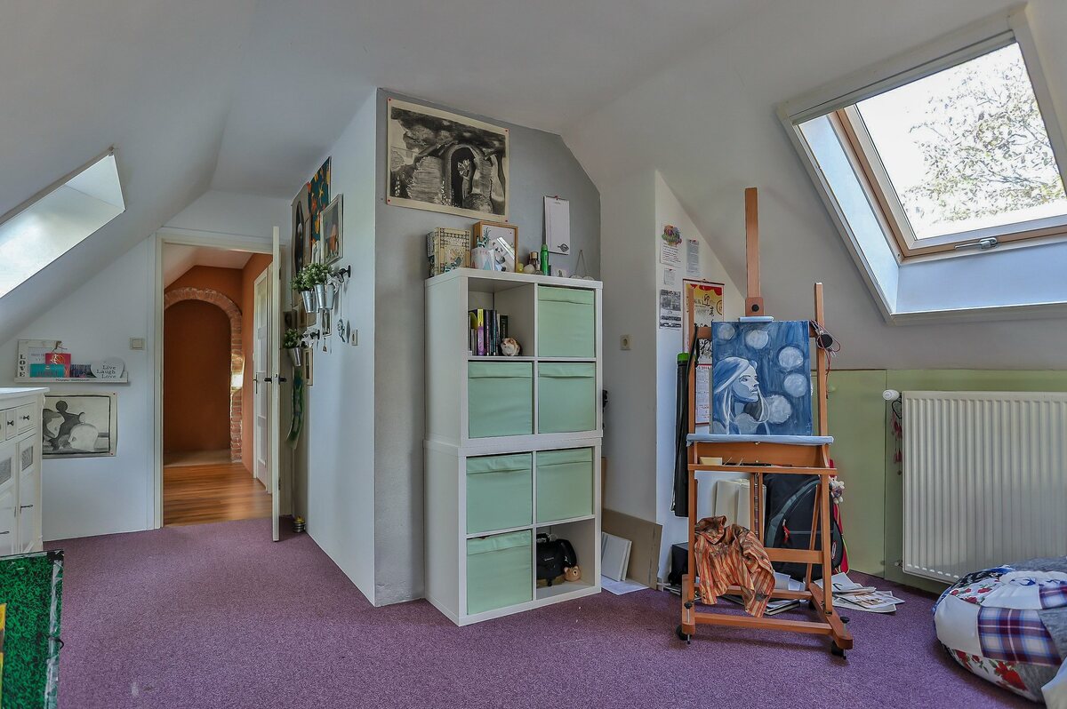 Verdieping: royale overloop met dakramen, inloopkast en toegang tot drie slaapkamers van 18, 13 en 6 m2. Nette badkamer (ca. 4 m2) met douche, vaste wastafel en toilet.