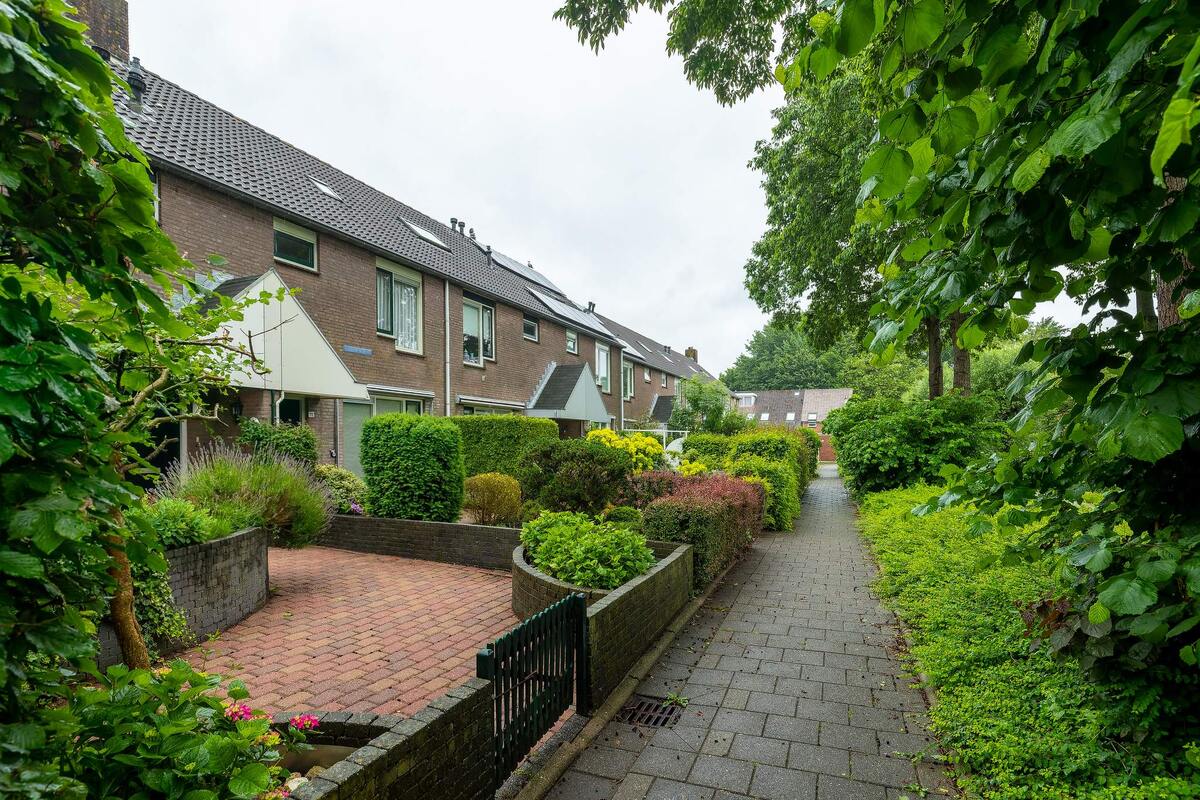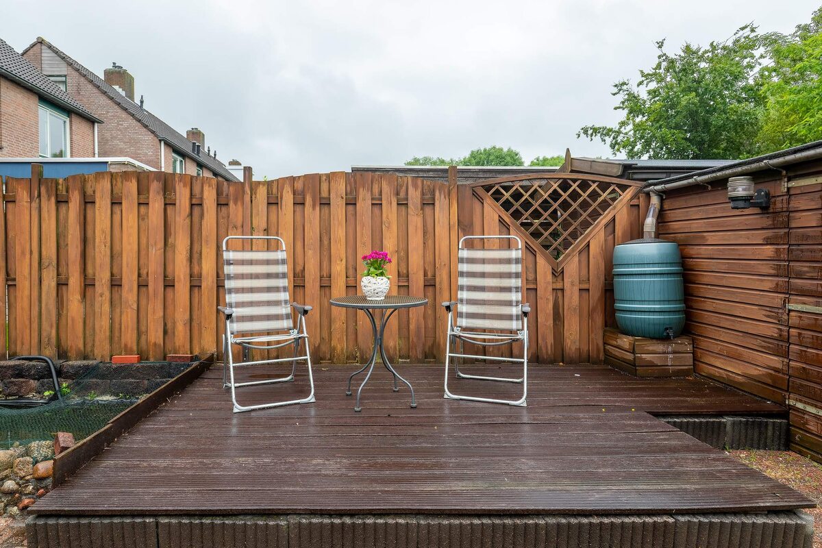 Grote zonnige voortuin (ca. 40 m2) gericht op het zuidwesten met zicht op groen. Hier is het heerlijk toeven! Verder een flinke achtertuin van ca. 60 m2 en een houten berging. Met achterom.