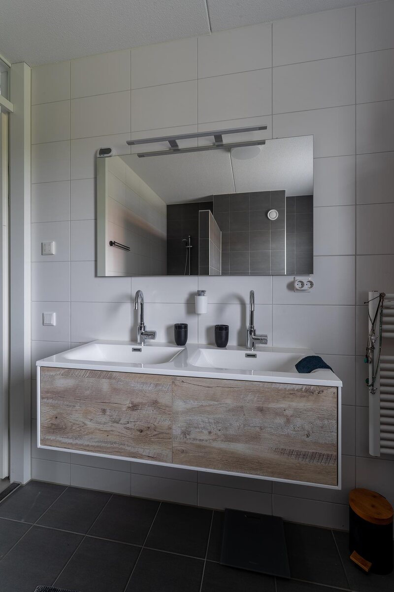 Eerste verdieping: overloop met toegang tot drie slaapkamers en de badkamer. De slaapkamers zijn ca. 13 m², 11 m² en 10 m² groot. De badkamer, van ca. 8 m² groot, beschikt over een toilet, een inloopdouche, een ligbad en een dubbele wastafel. Ook deze verdieping is voorzien van vloerverwarming.