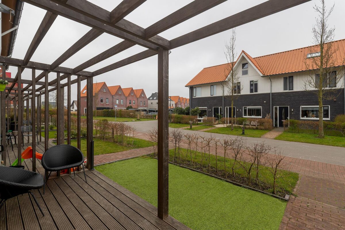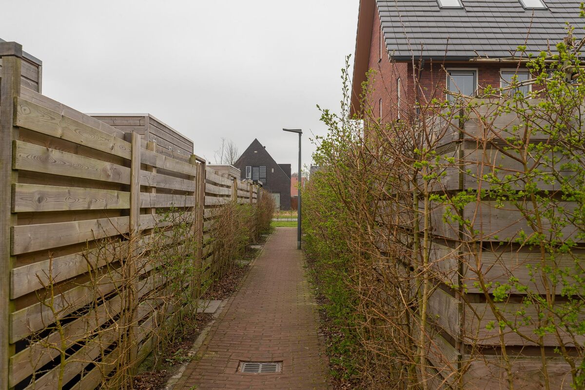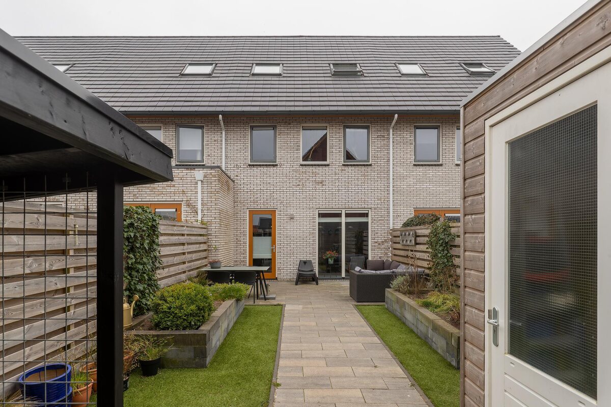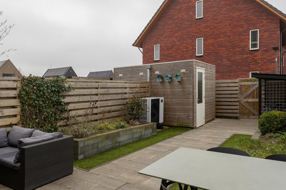 Tuin: keurig onderhoudsvriendelijke voor- en achtertuin. De voorzijde is gelegen op het zuidoosten en de achterzijde op het noordwesten. In de achtertuin staat nog een berging van ca. 6 m² groot en fietsenoverkapping. Er is een achterom aanwezig die leidt naar de parkeerplaats toe. Hier kan men de auto parkeren.