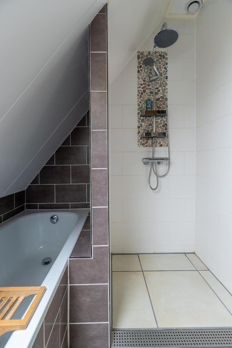 Eerste verdieping: overloop met knieschotten en toegang tot vier slaapkamers en de badkamer. De twee slaapkamers aan de linkerzijde van de woning zijn ca. 10 m² en 9 m² groot. De slaapkamers aan de rechterzijde zijn ca. 9 m² en 5 m² groot. De badkamer van ca. 5 m² is voorzien van een douche, ligbad, toilet en wastafel.