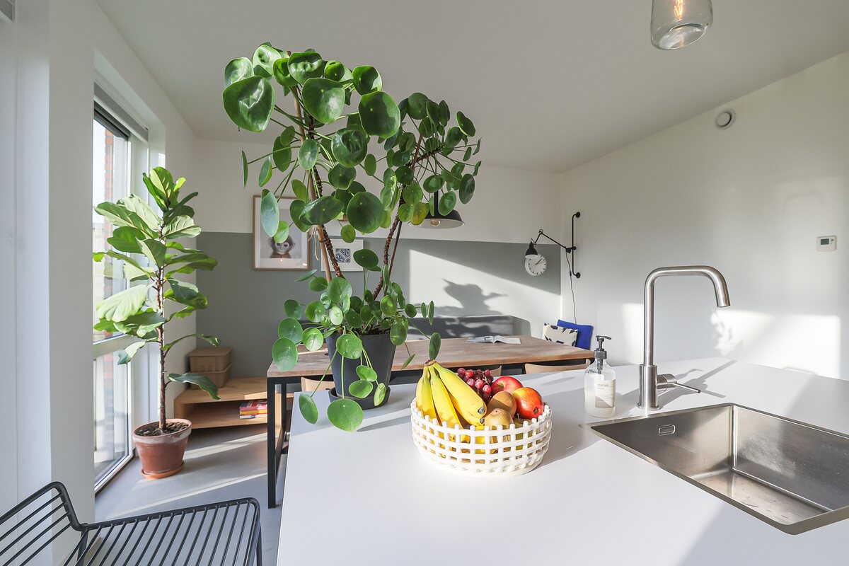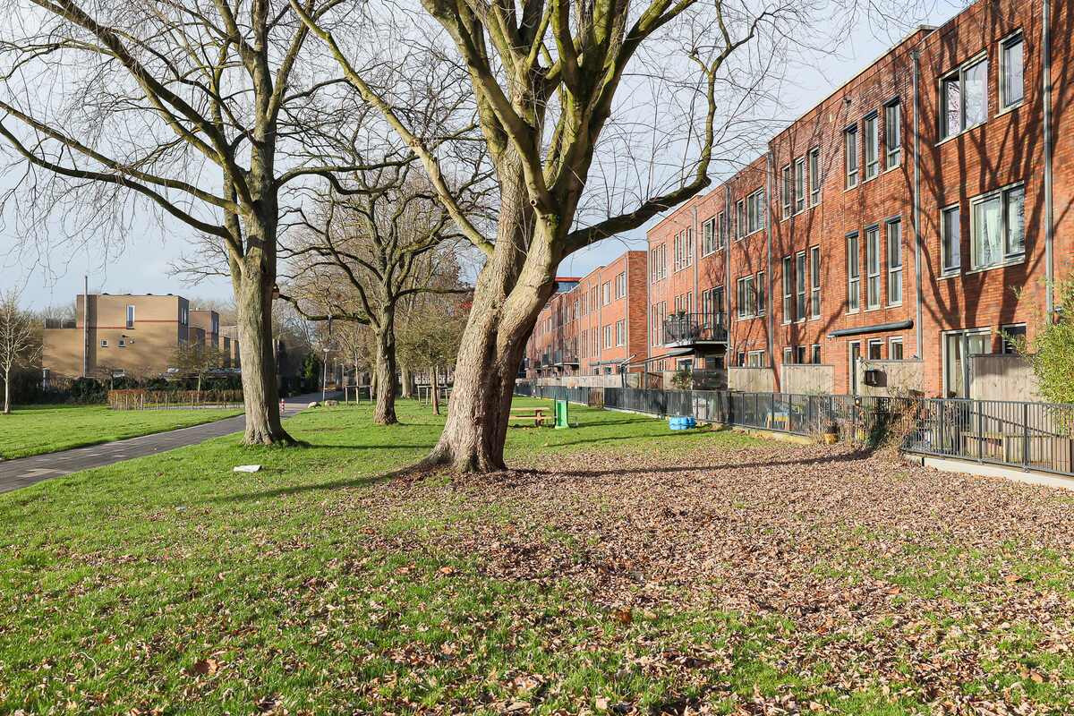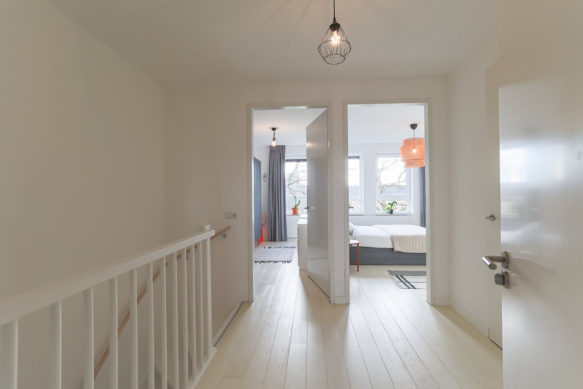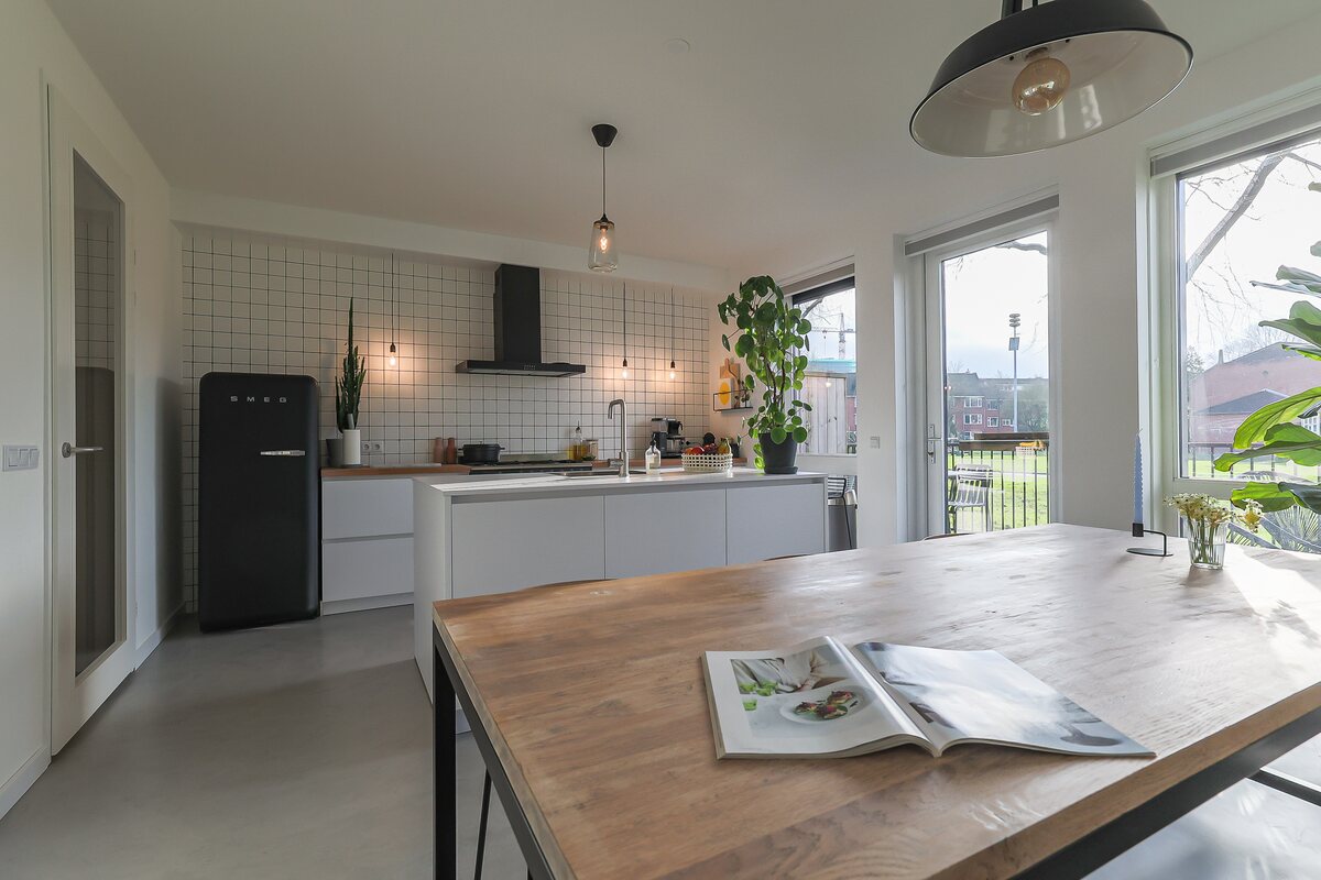 Begane grond: entree/hal, toilet, inpandige berging (8 m2), trapkast, flinke woonkeuken met 2 luxe keukenblokken v.v. inbouwapparatuur (22 m2). Vanuit de keuken toegang tot zonnig terras van 13 m2 met vrij uitzicht. Een heerlijke plek om te zitten en te genieten van het groen.Eerste verdieping: overloop, lekker lichte en ruime woonkamer (40 m2) en een compacte speel-/werkkamer (3 m2). De woonkamer is strak gestuukt met gave houten vloer. Daarnaast is op subtiele wijze een mooi (en praktisch) bureaublad aangebracht.Tweede verdieping: overloop, 3 nette slaapkamers van circa 13, 9 en 8 m2, strakke badkamer (6 m2) met douche, ligbad, fraaie wastafel en 2e toilet, bergruimte met cv-opstelling en wasmachine-opstelling.