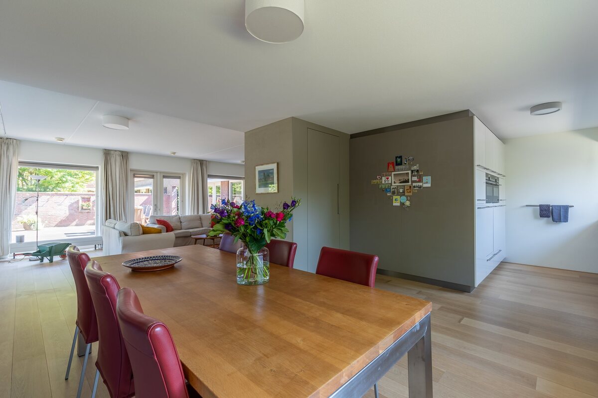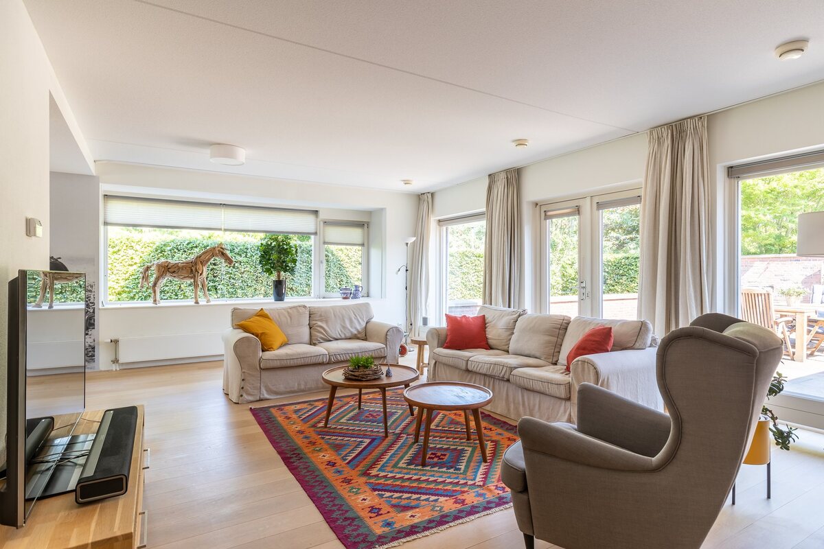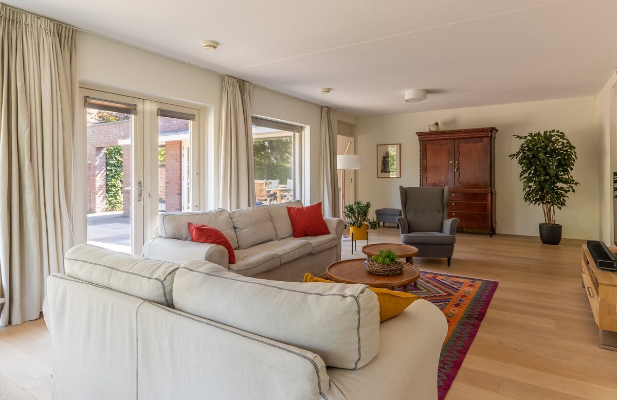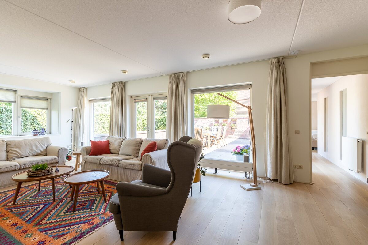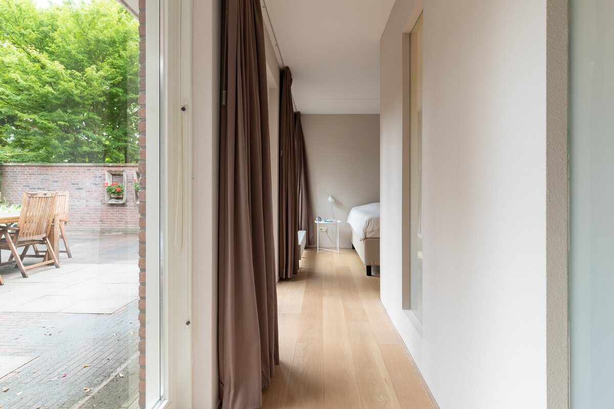 Begane grond: ruime hal met deur naar de aangebouwde garage (21 m2), wc met hangend toilet, royale U-vormige living (ca. 67 m2) met houten parketvloer en openslaande deuren naar het riante en zonnige terras in de tuin. Luxe open maatkeuken (2017, door Hendriks & De Jonge Interieurbouw) voorzien van alle gemakken en vervaardigd van hoogwaardige materialen. Verder op de begane grond een grote slaapkamer (17 m2) met een unieke zeer fraaie luxe badkamer en suite met o.a. vloerverwarming, ligbad, douche, wastafelmeubel en separaat 2e toilet. Deze slaapkamer heeft eveneens openslaande deuren naar het terras.