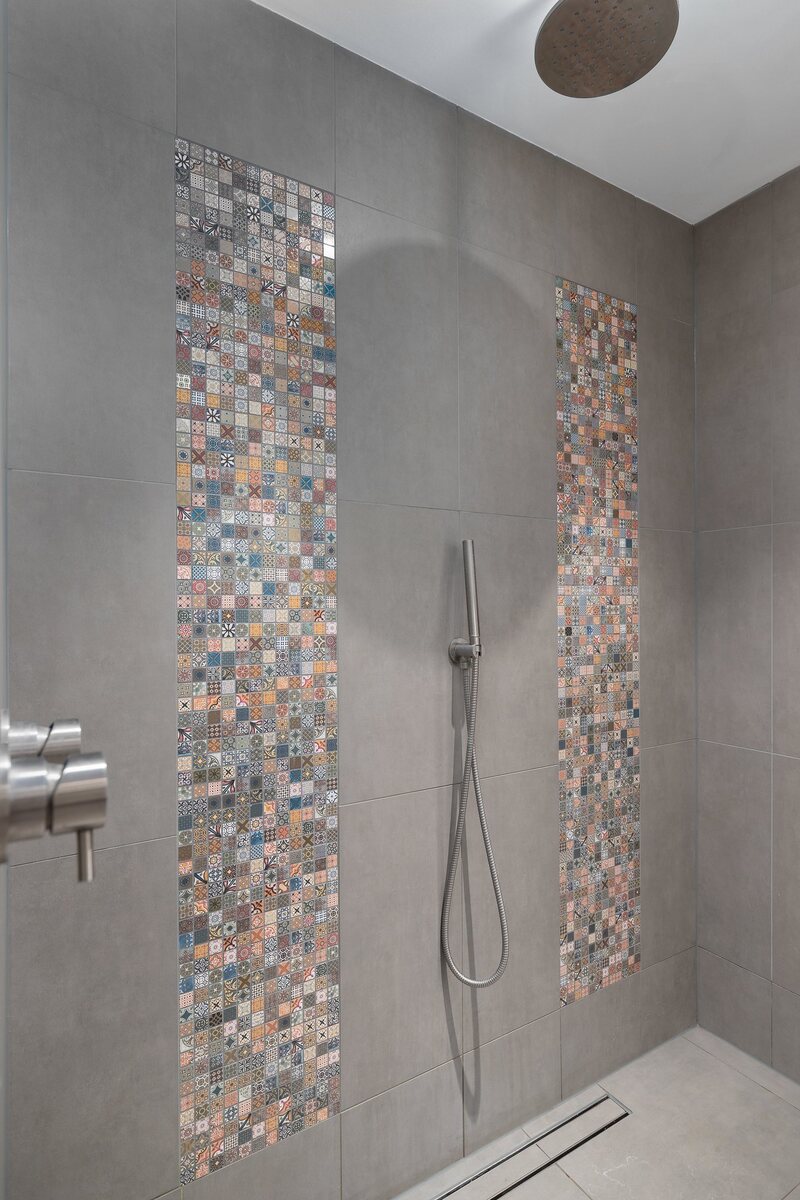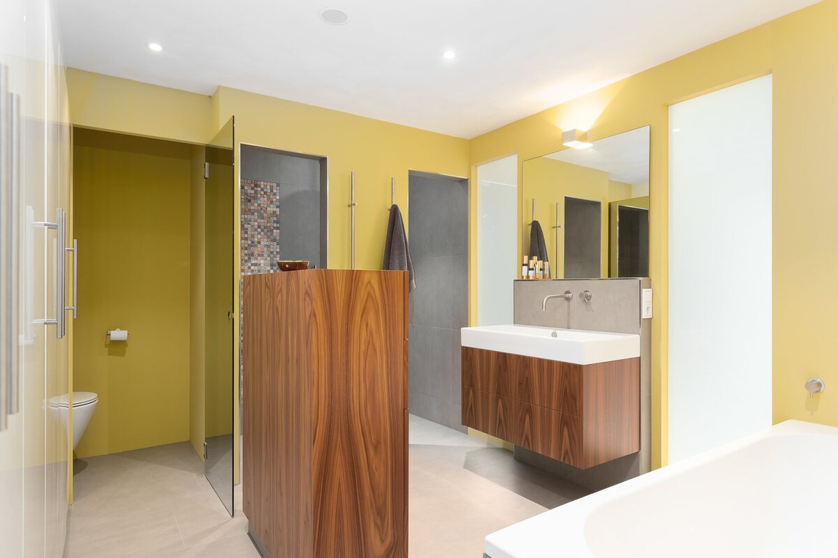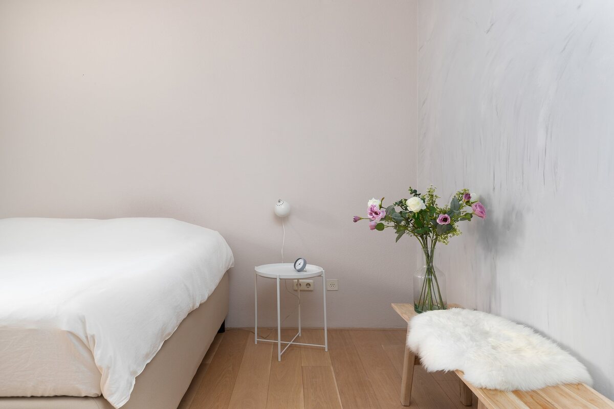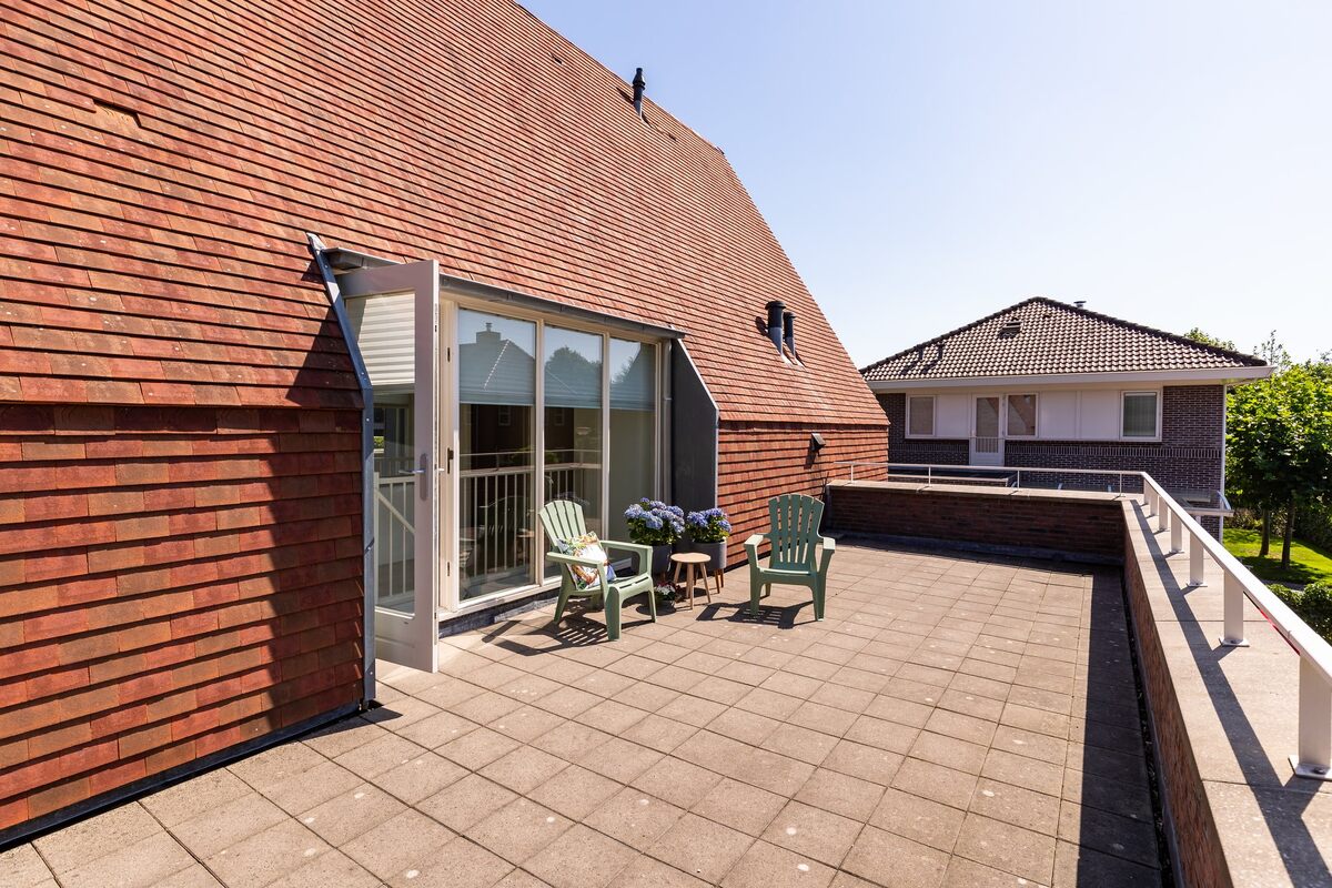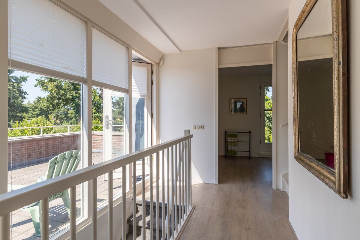 Eerste verdieping: overloop, royaal dakterras met uitstekende bezonning (ca. 32 m2), drie volwaardige slaapkamers (17 m2 met Frans balkon, 13 m2 met grote inloopkast en een kamer van 18 m2), tweede moderne badkamer (2017) met dubbele wastafel, 3e toilet en inloopdouche. Separate wasruimte.